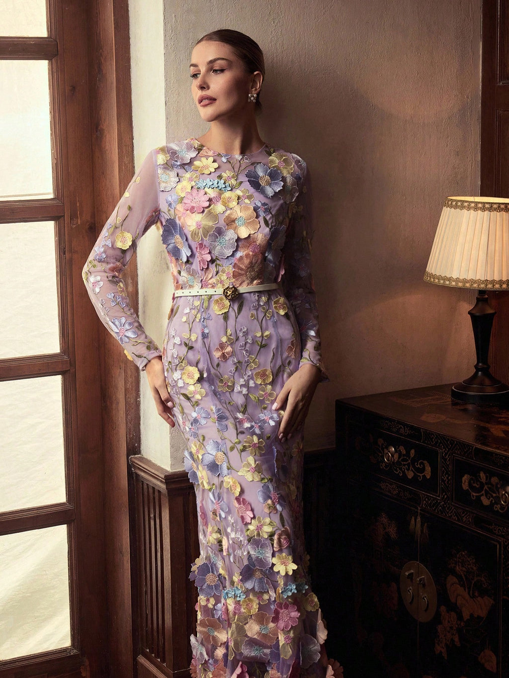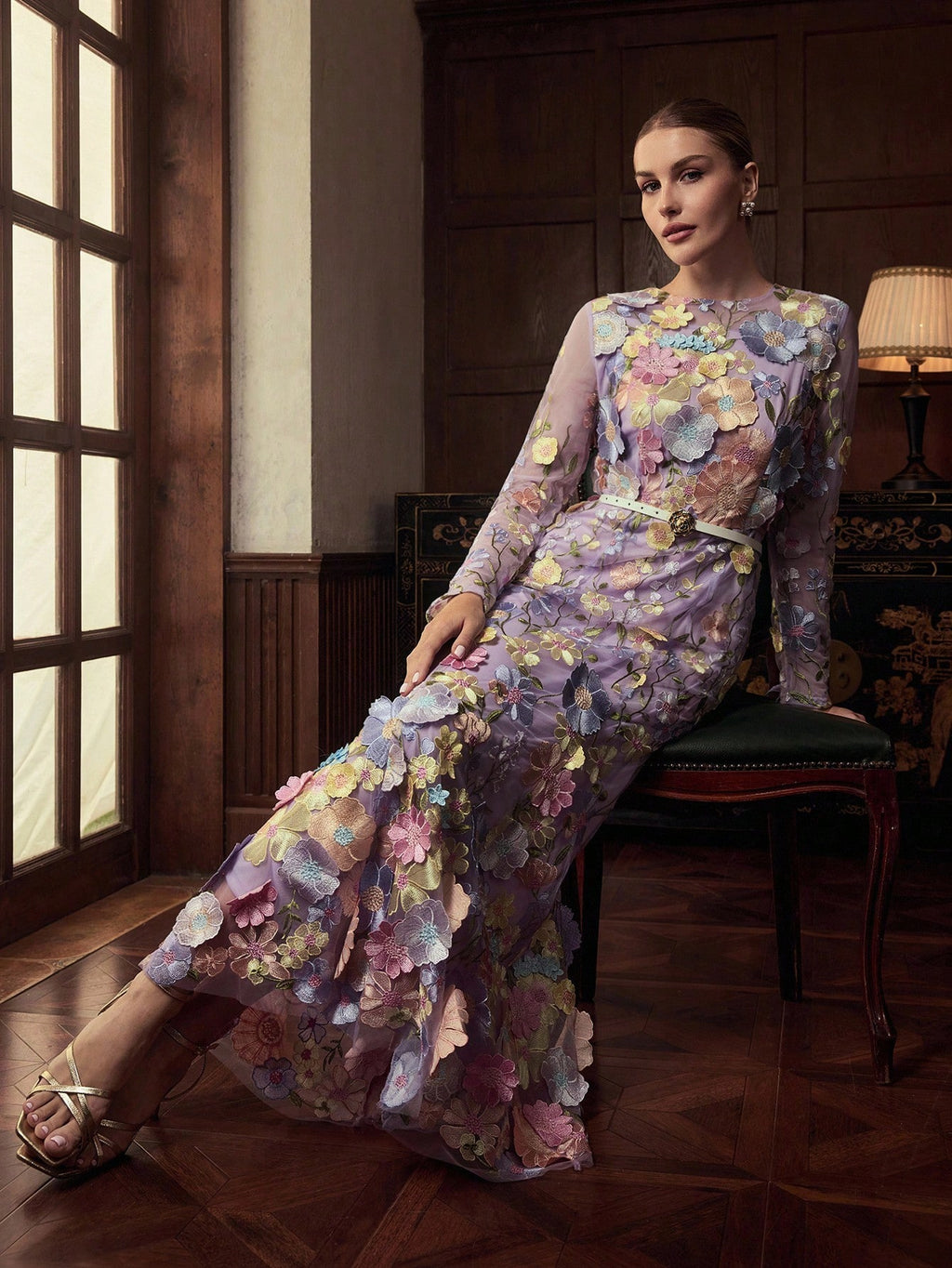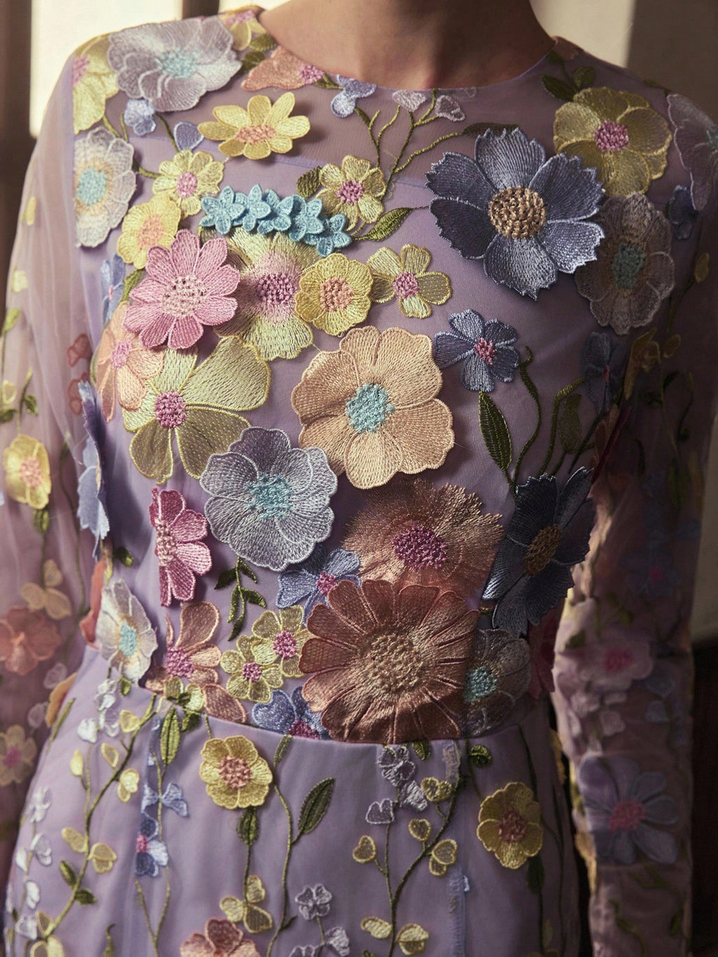 MIU Women's Elegant Party 3D Floral Embroidered Mesh Dress