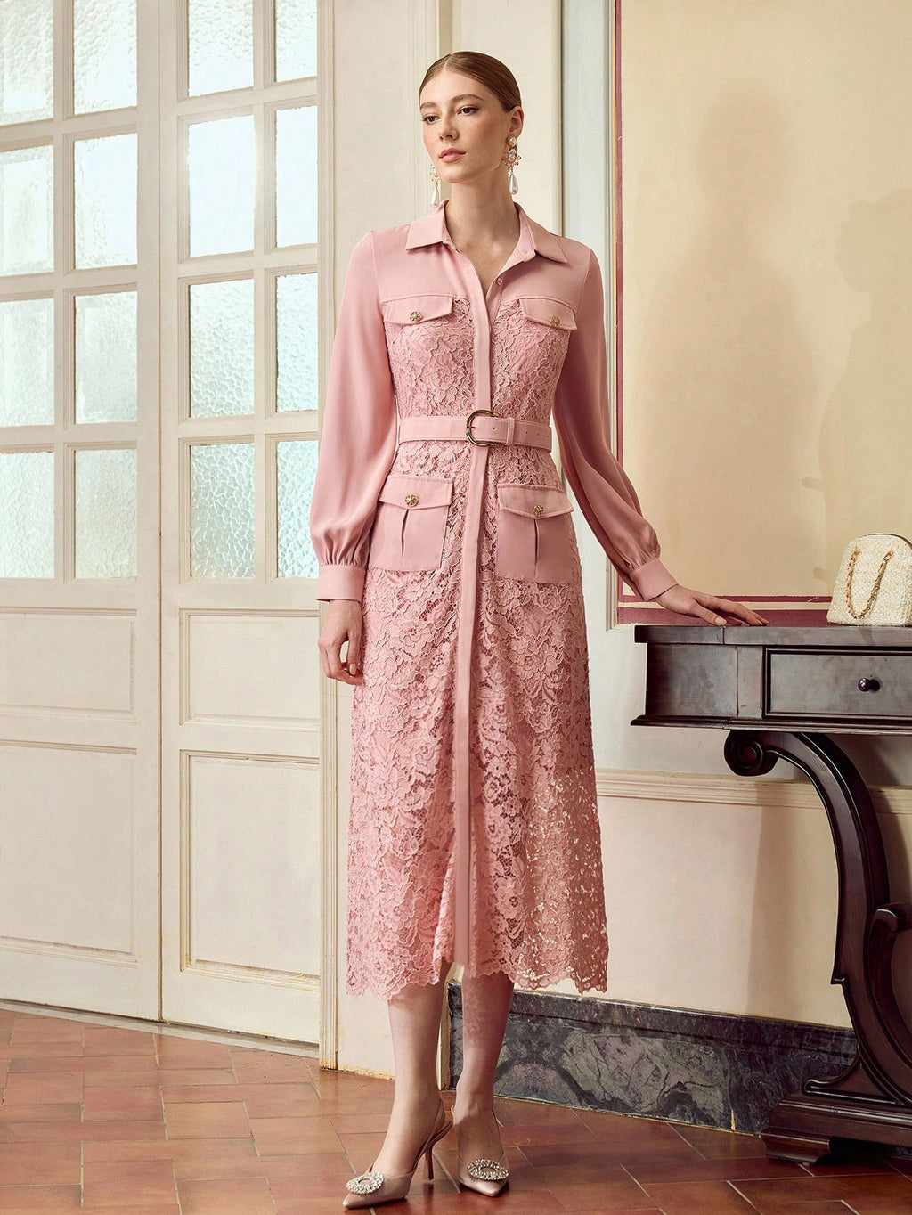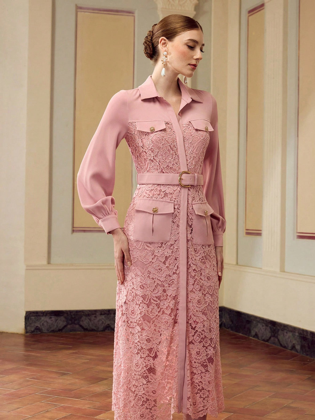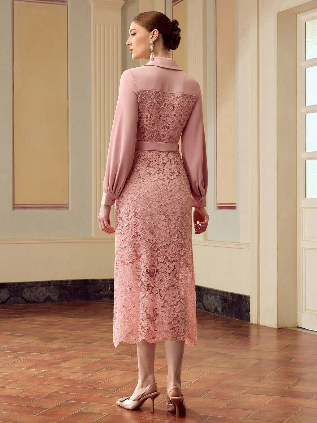 MIU Women's Elegant Solid Color Lace Splice Midi Dress