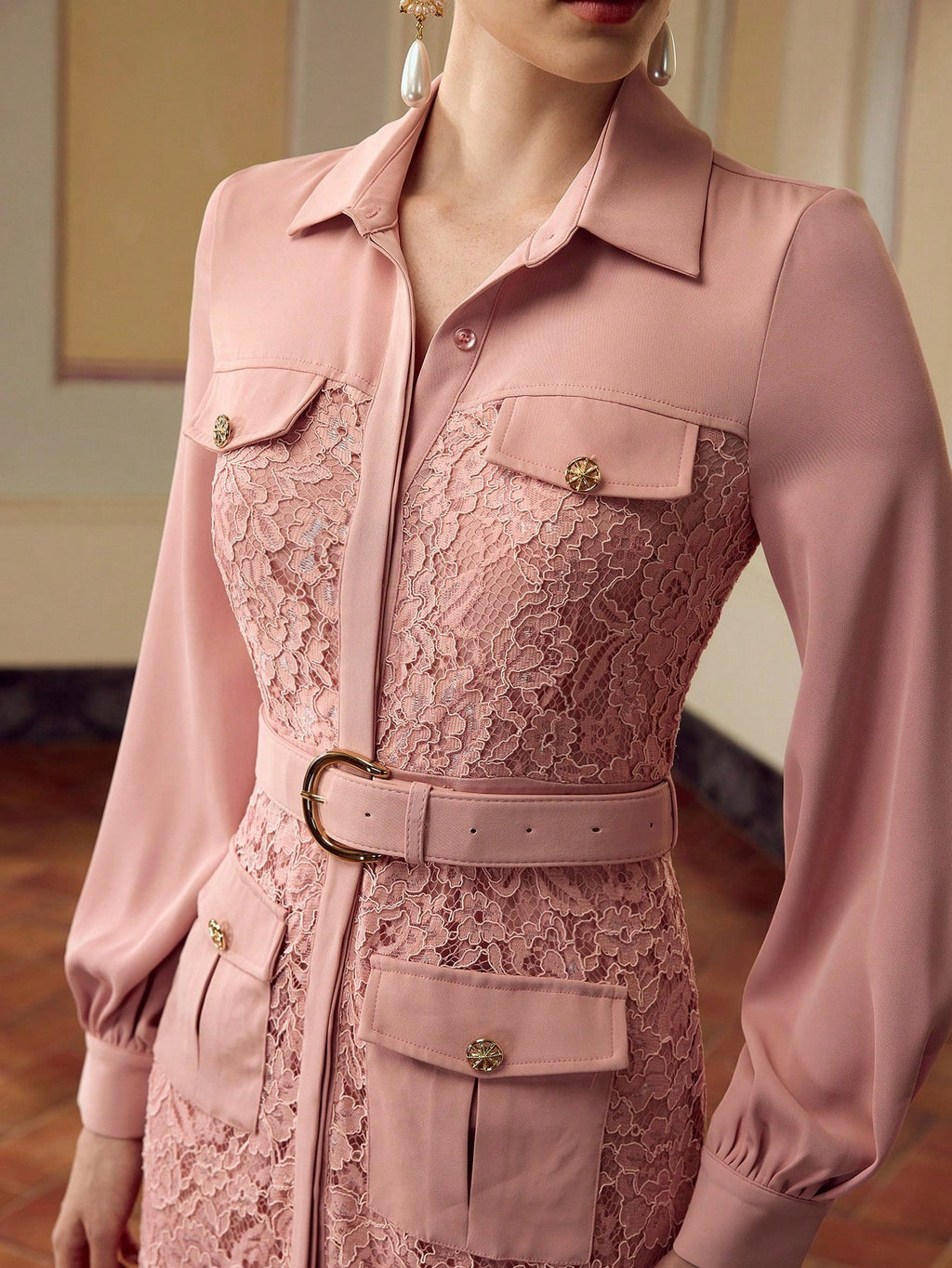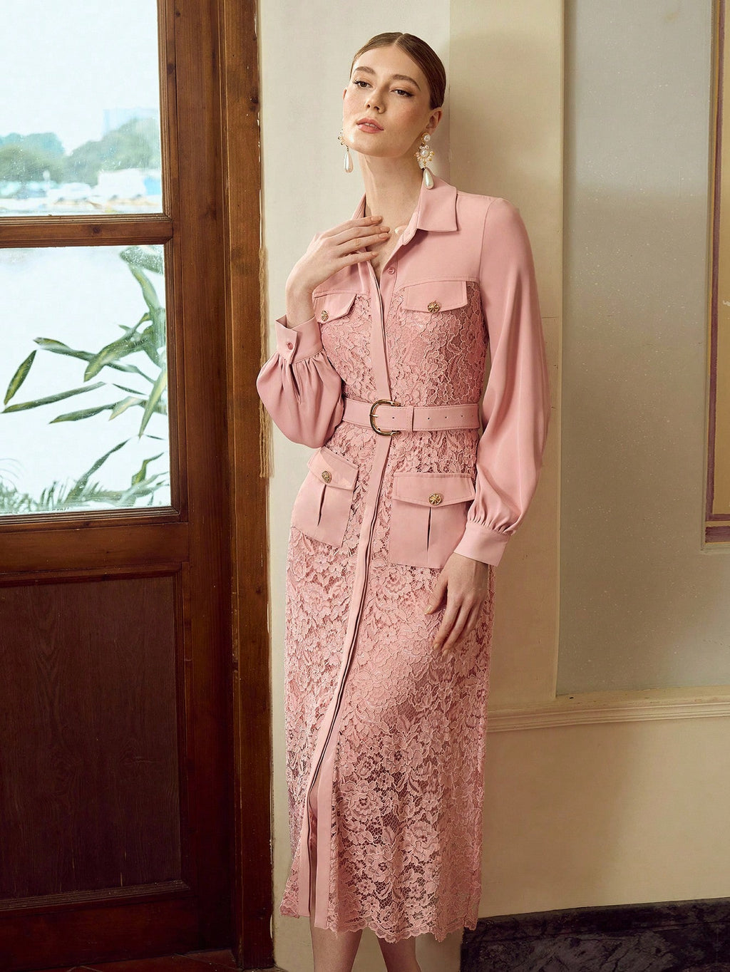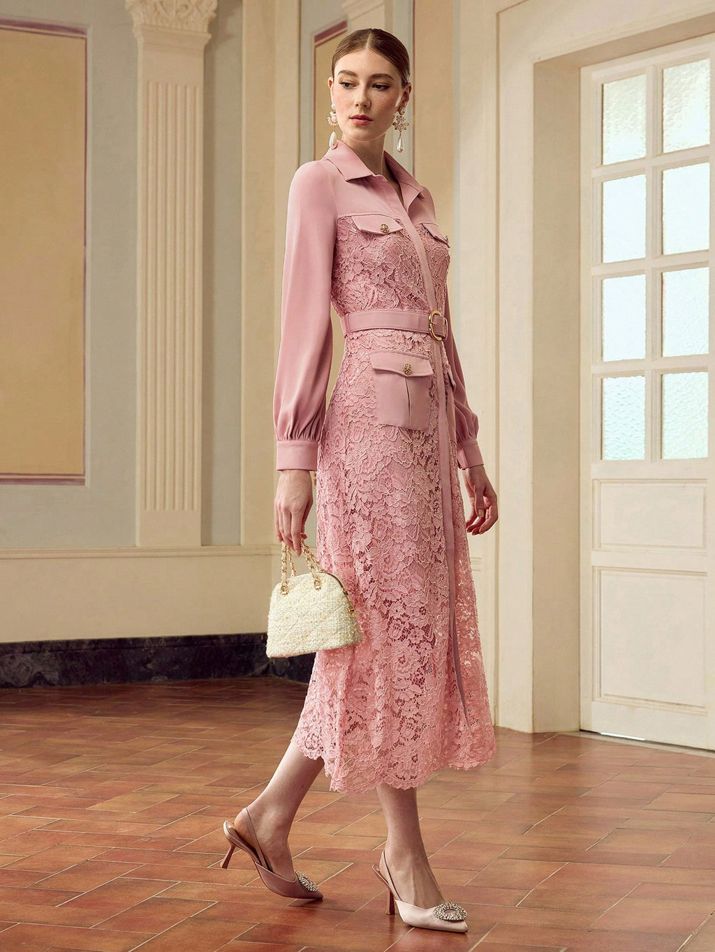 MIU Women's Elegant Solid Color Lace Splice Midi Dress