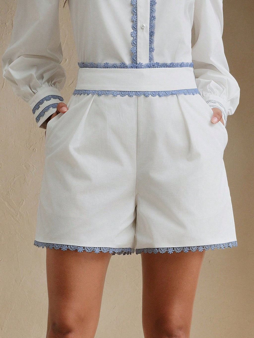 MIU Women's Elegant White Woven Romper With Lace Trim And Long Sleeves