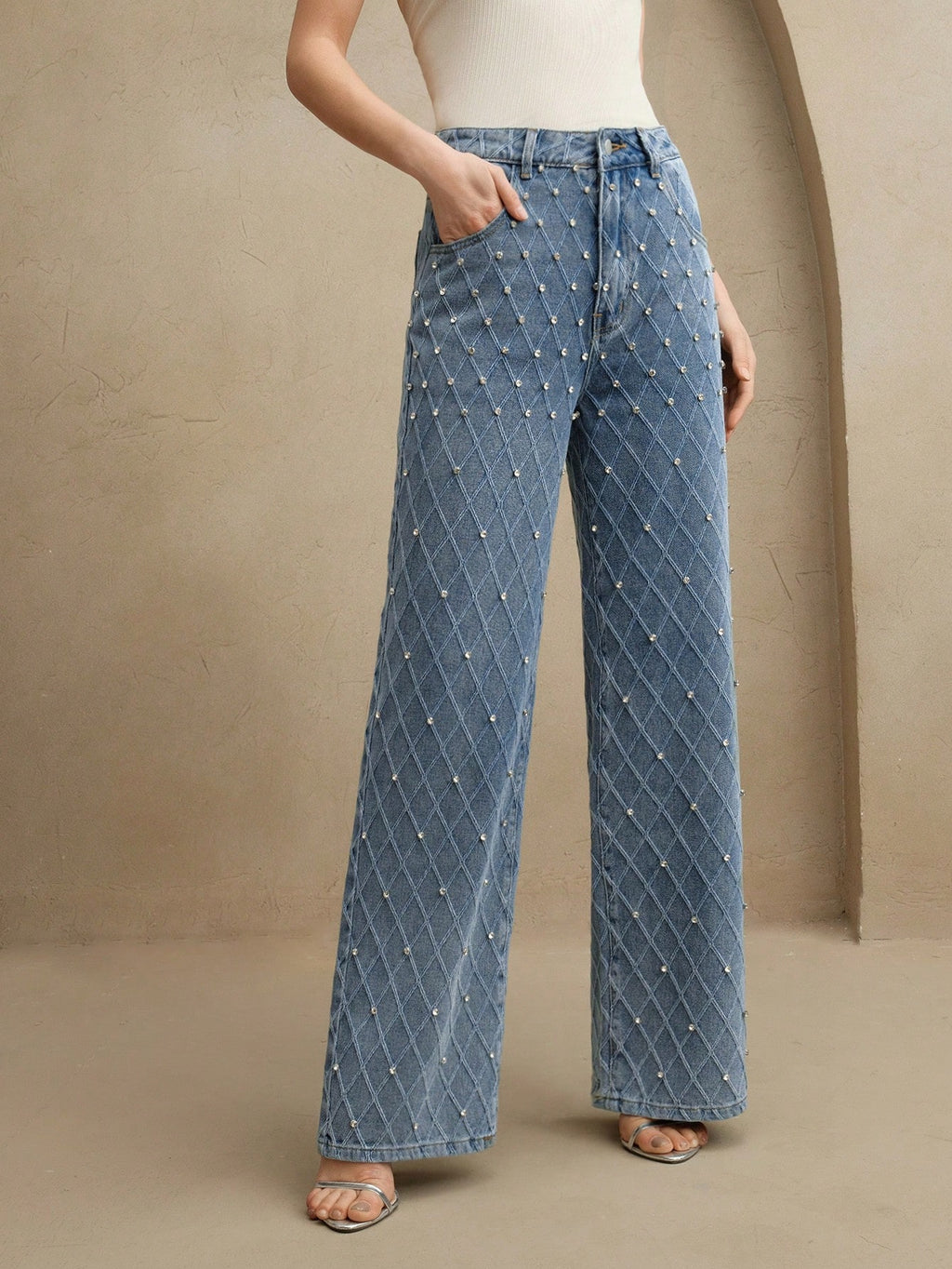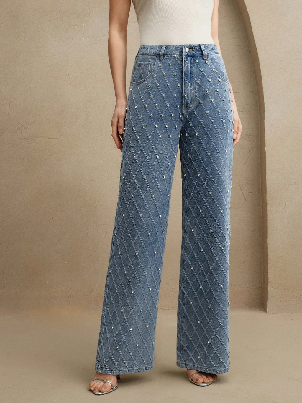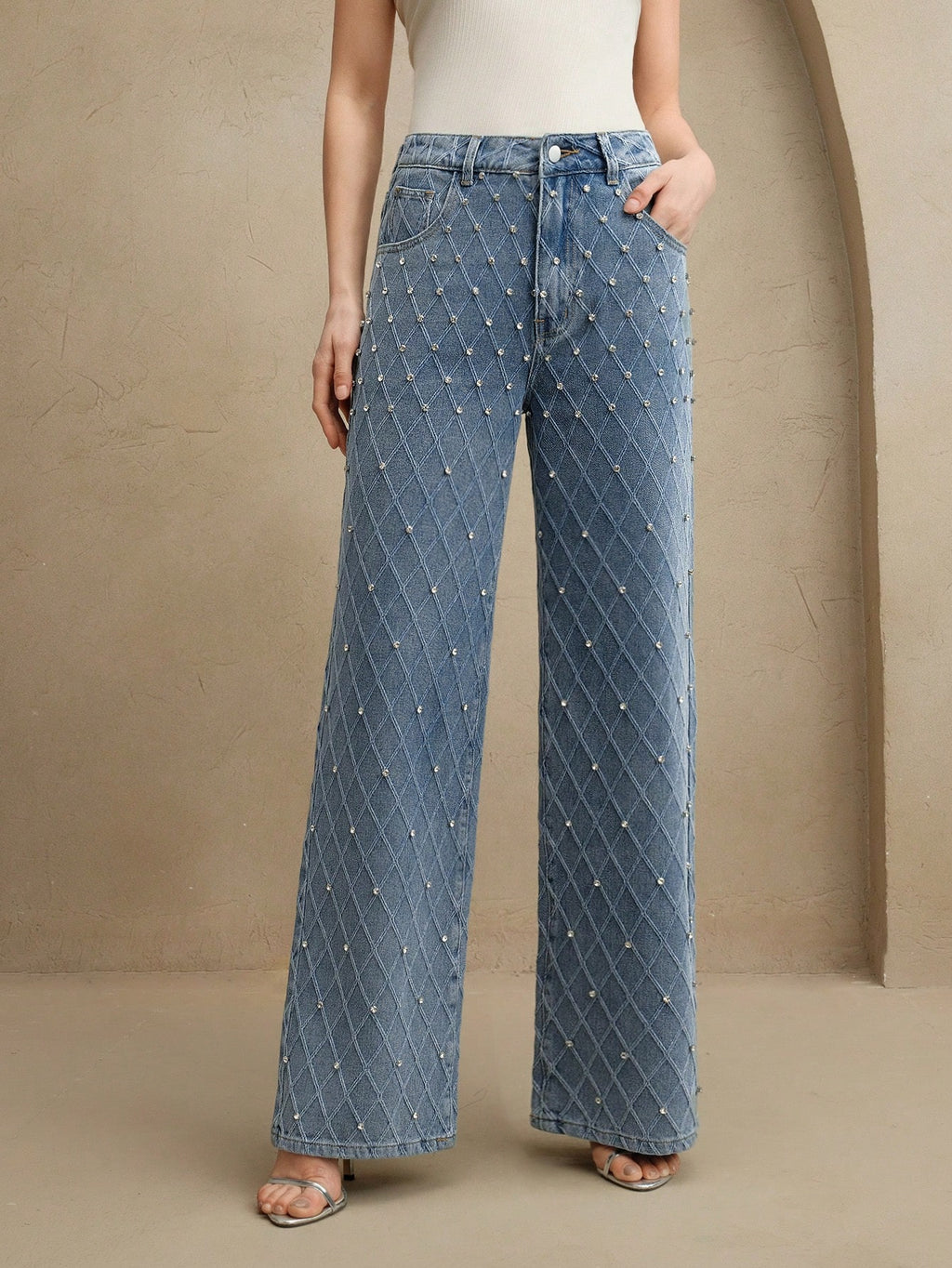 MIU Women's Fashion Beaded Luxury Embellished Straight Leg Jeans, Festival, Casual, Elegant
