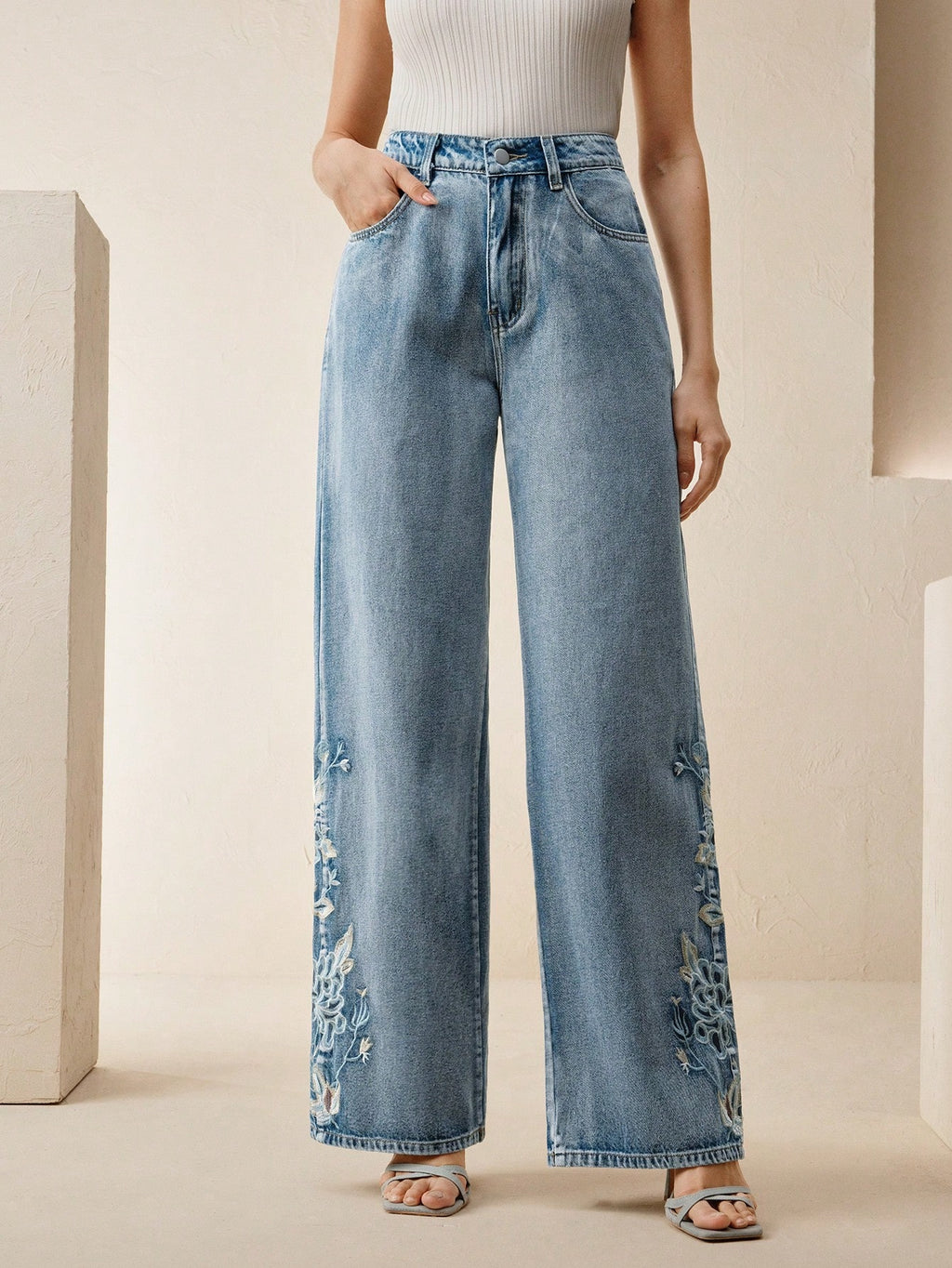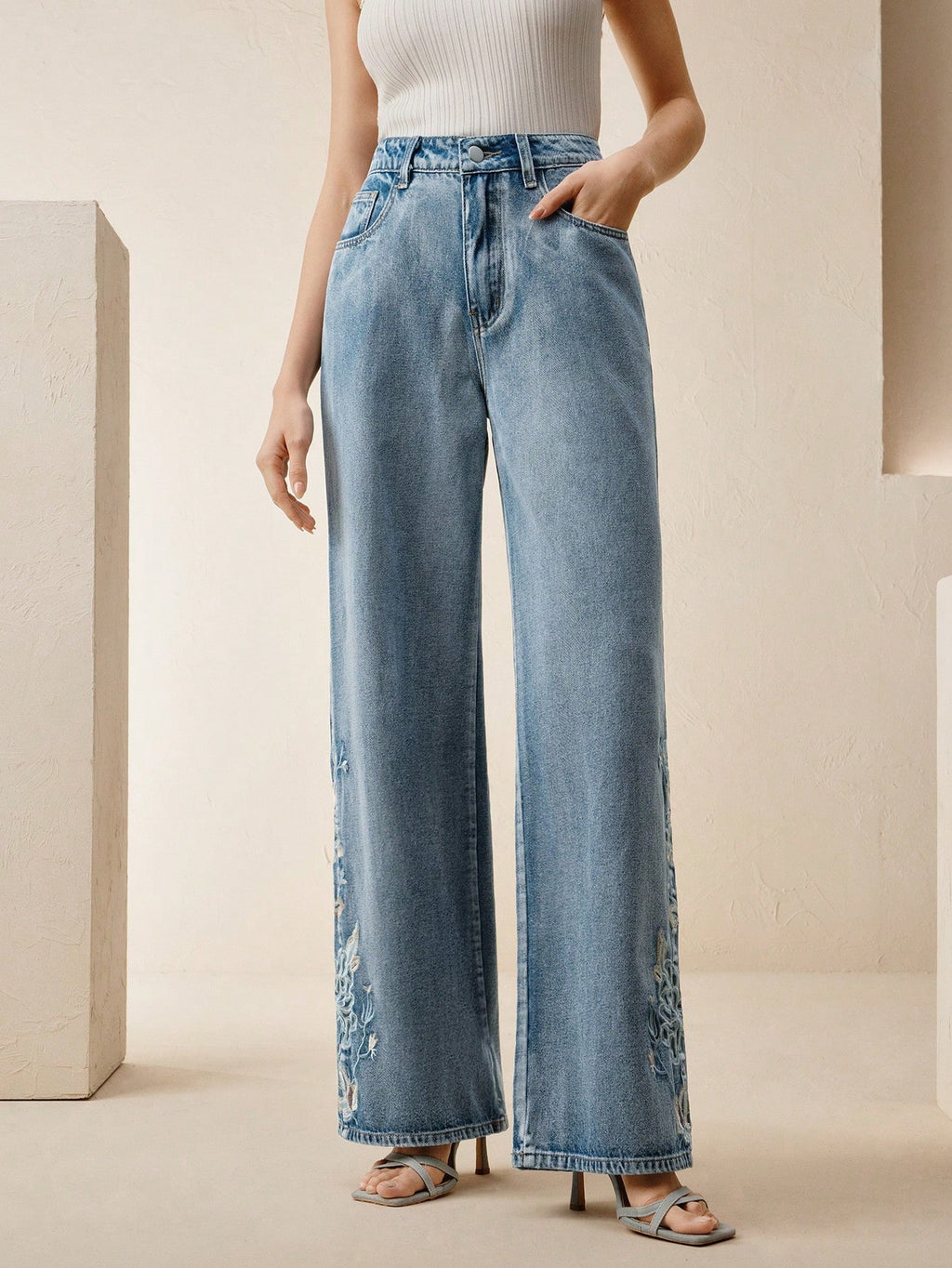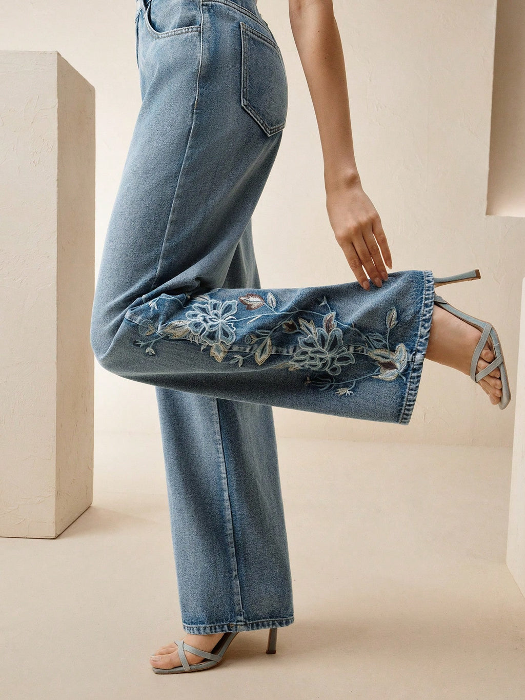 MIU Women's Fashion Embroidered Straight Leg Blue Denim Jeans