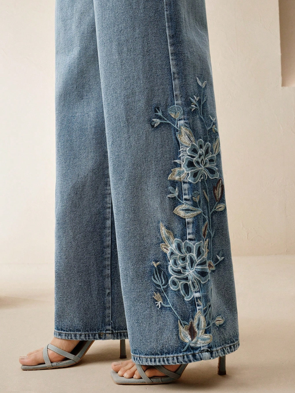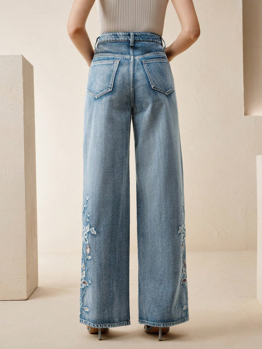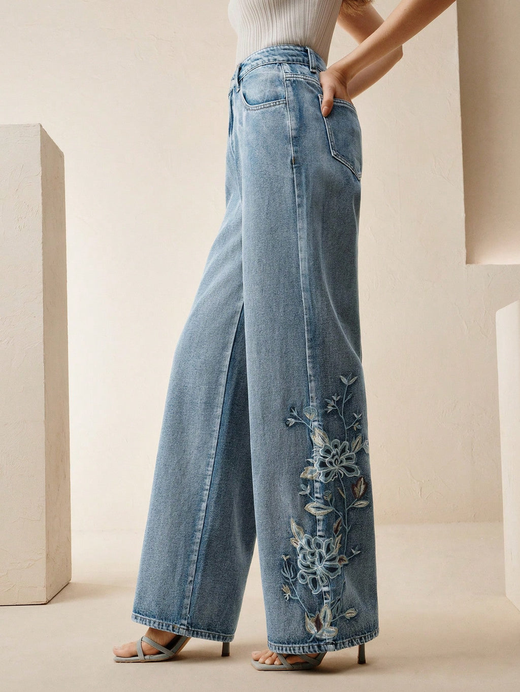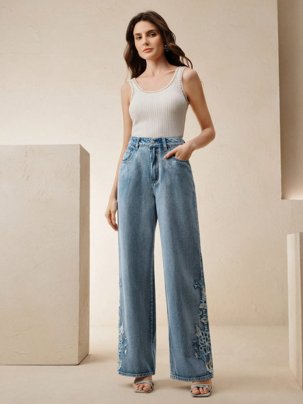 MIU Women's Fashion Embroidered Straight Leg Blue Denim Jeans