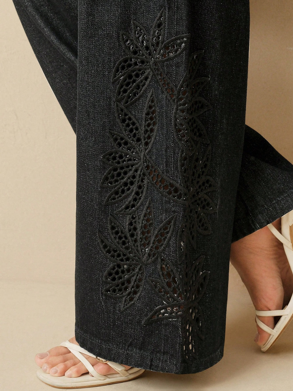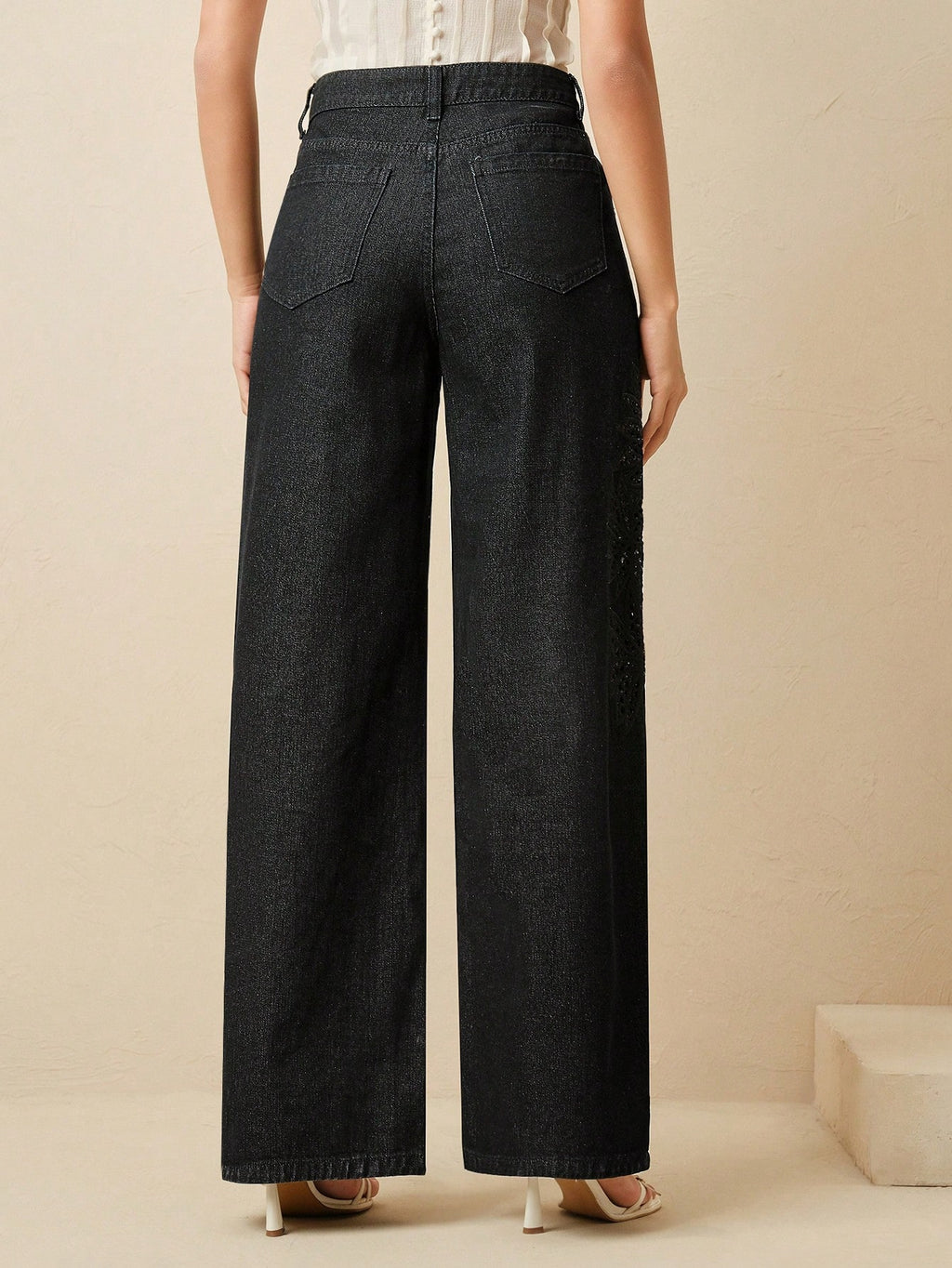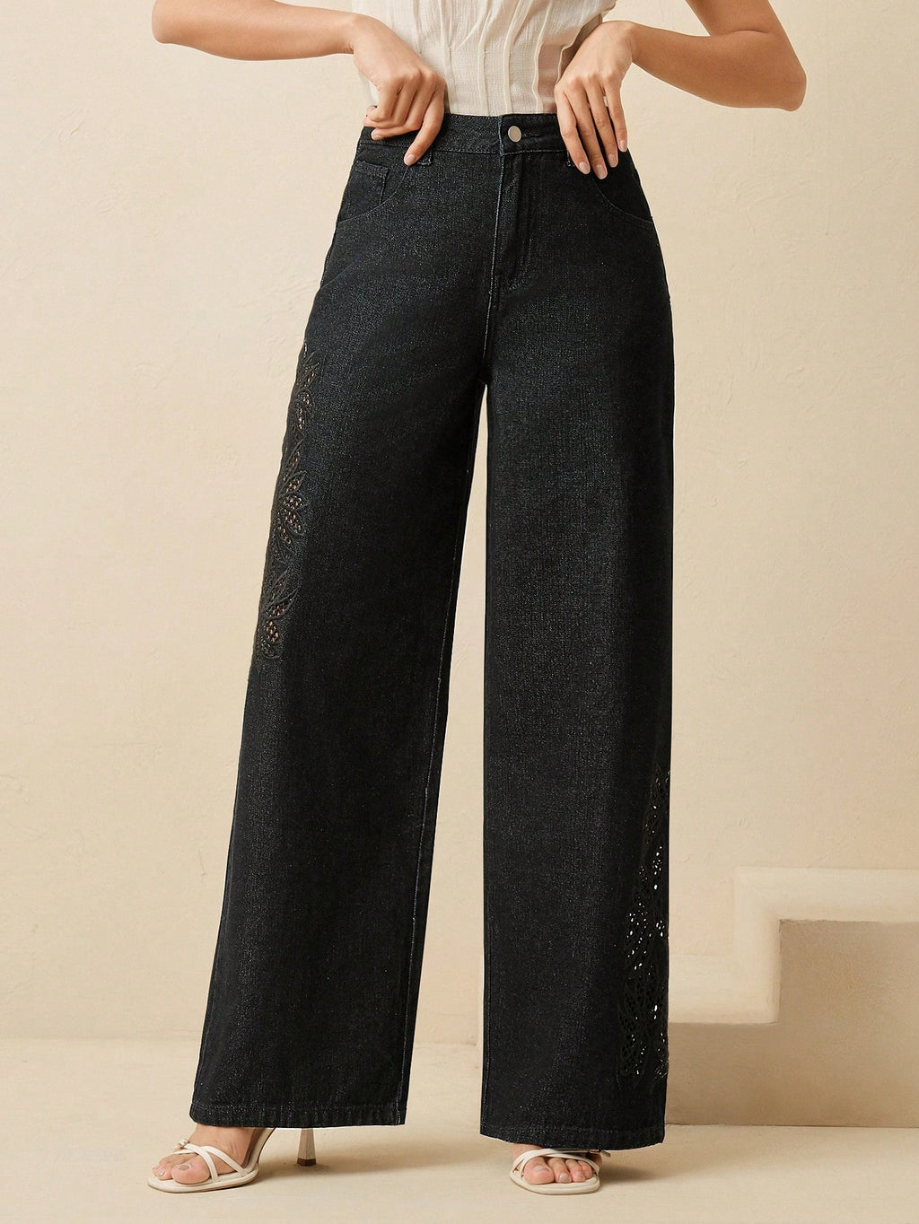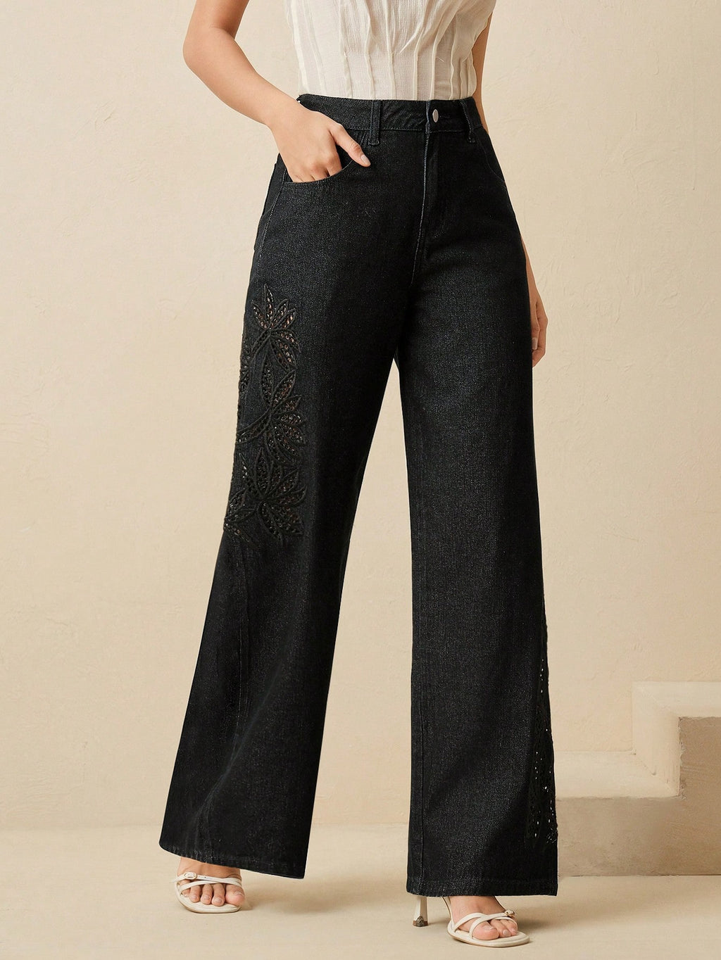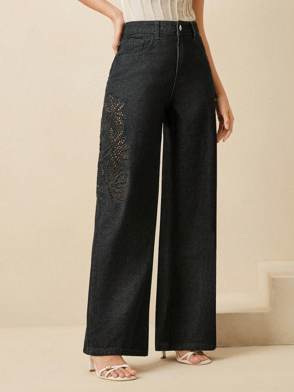 MIU Women's Fashion Hollow Out Wide Leg Straight Fit Jeans