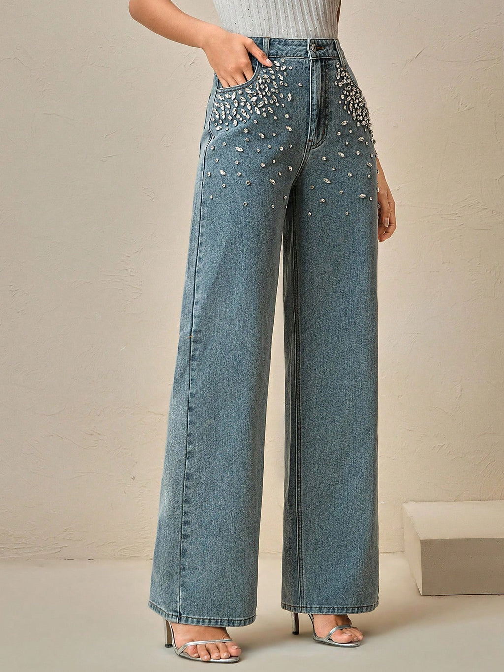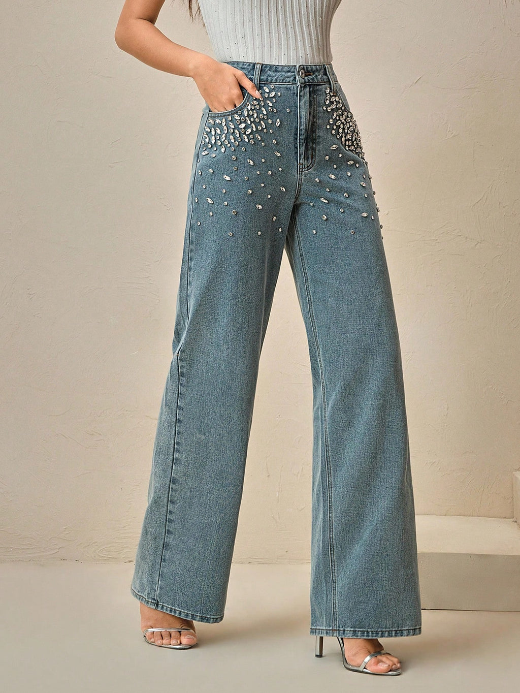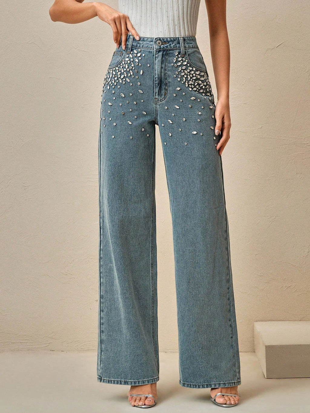 MIU Women's Fashion Rhinestone Embellished Straight Leg Loose Wide Leg Elegant Denim Jeans, Autumn/Winter