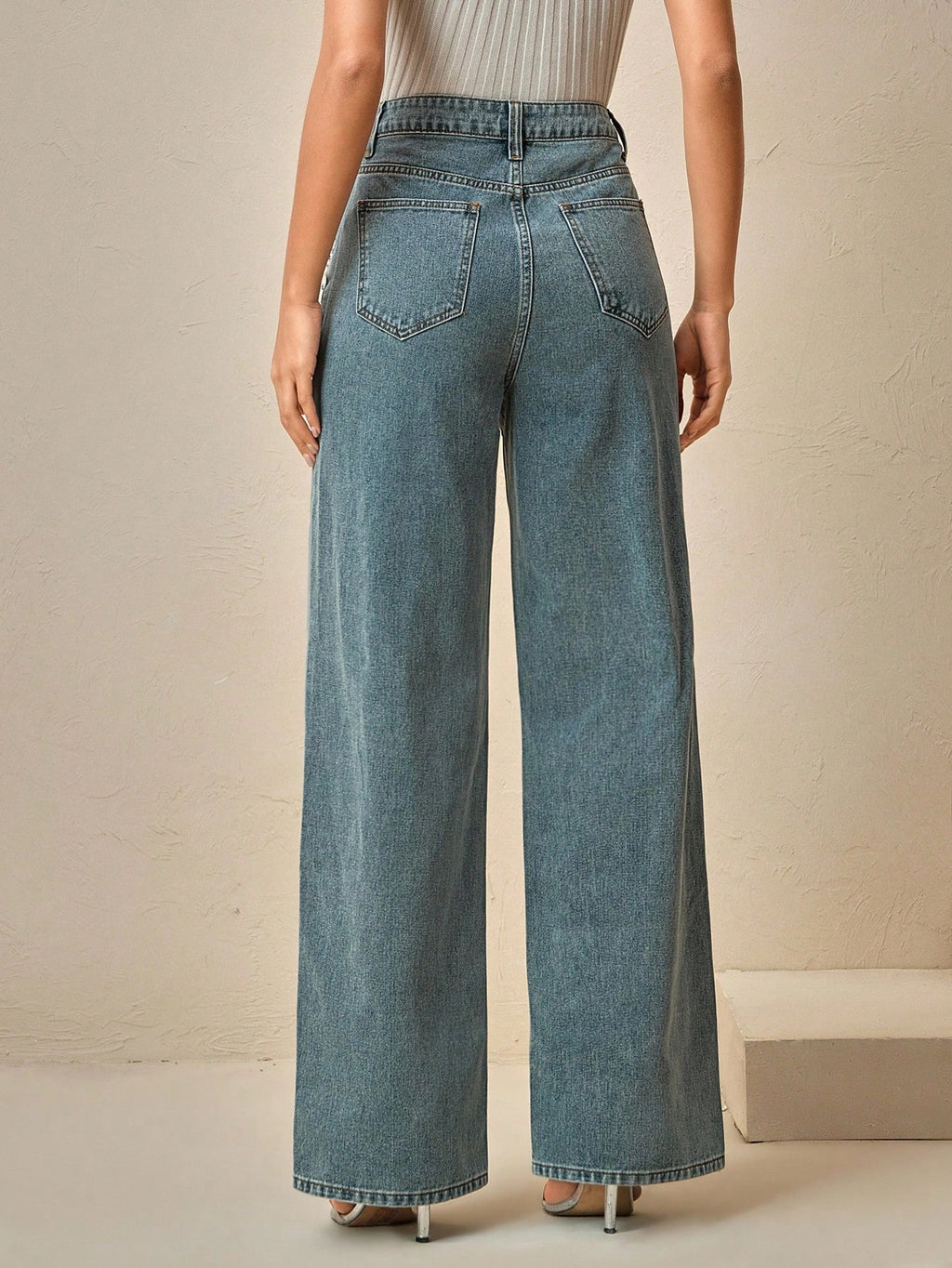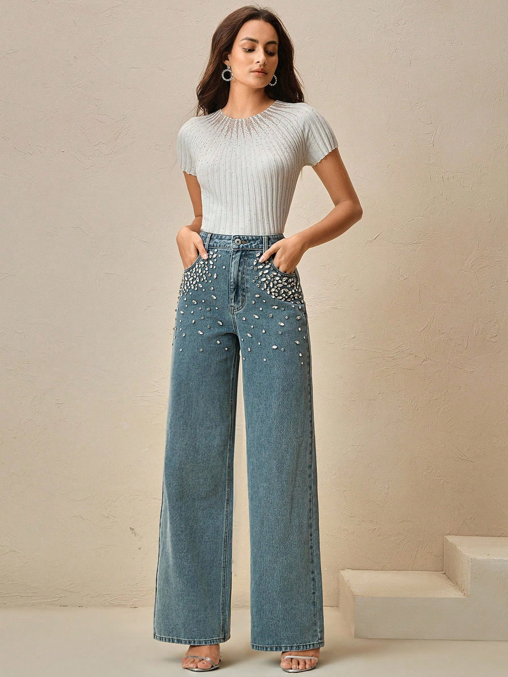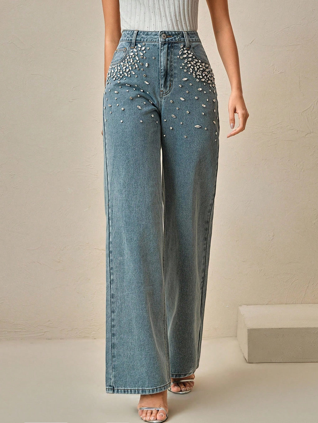 MIU Women's Fashion Rhinestone Embellished Straight Leg Loose Wide Leg Elegant Denim Jeans, Autumn/Winter
