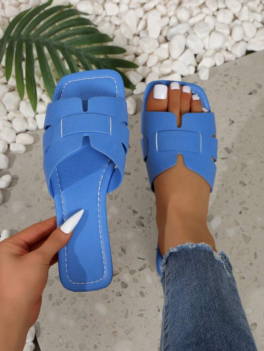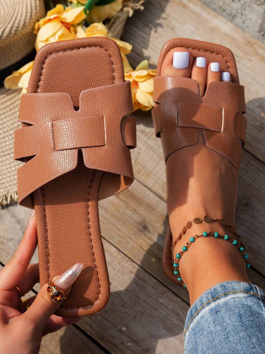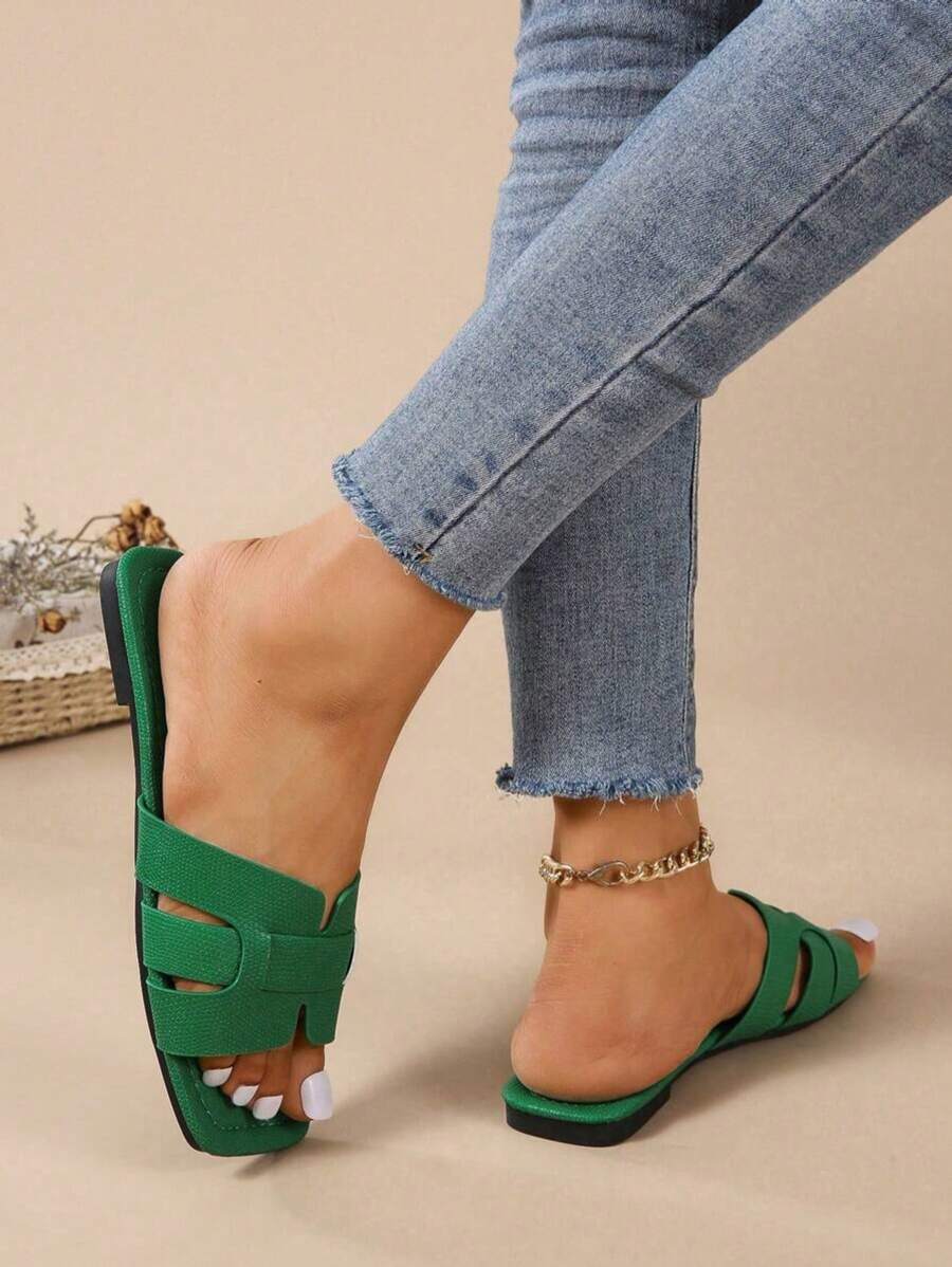 MIU Women's Fashion Square Toe Flat Slippers, Versatile Open Toe Sandals For Spring Summer, Solid Color Casual Ladies Sandals