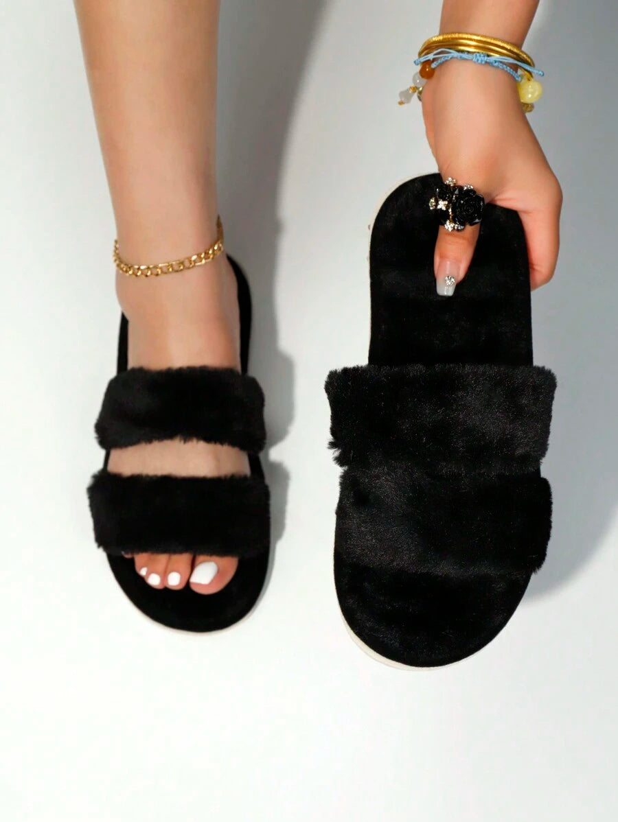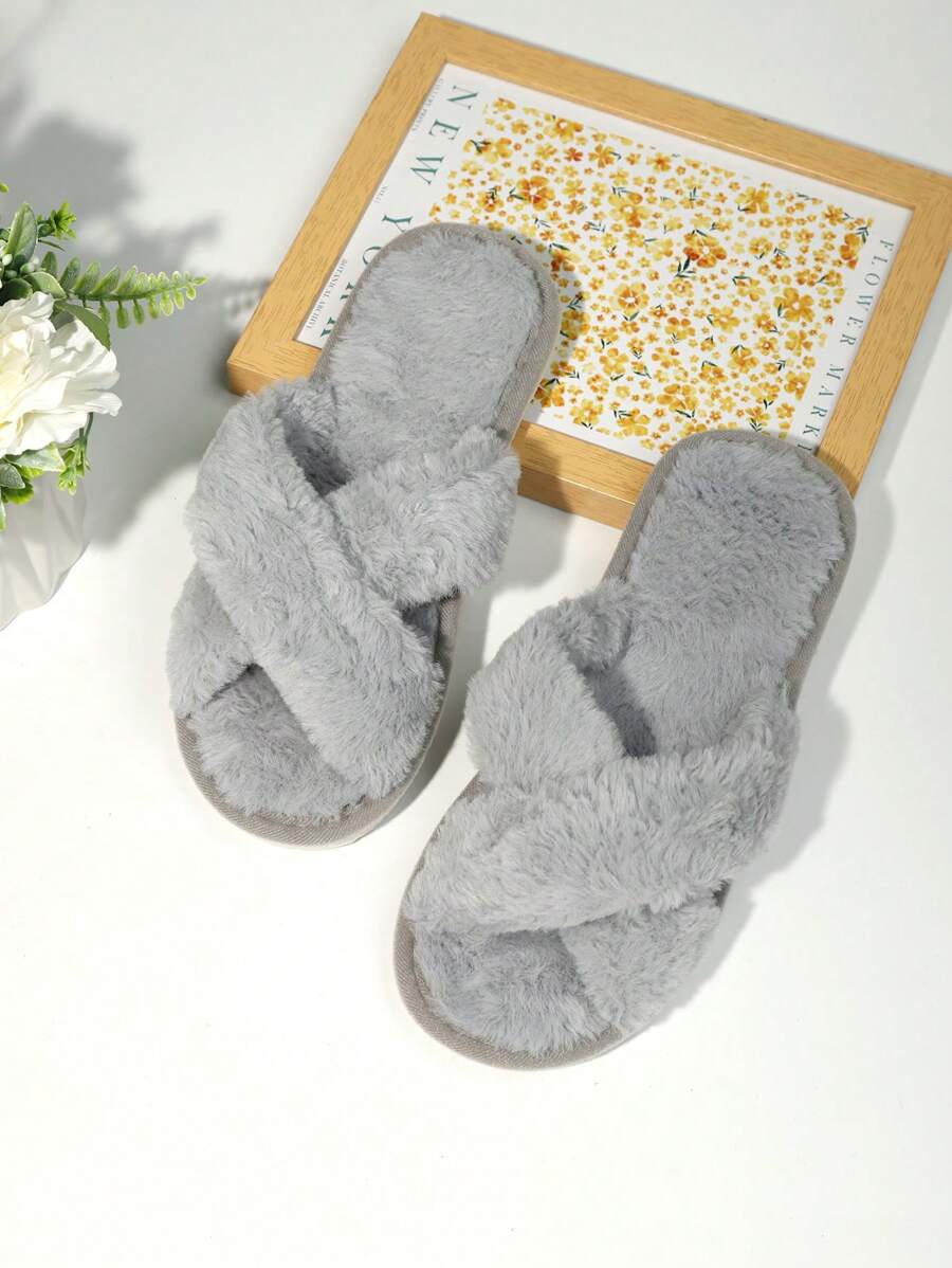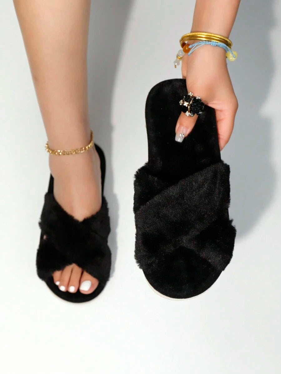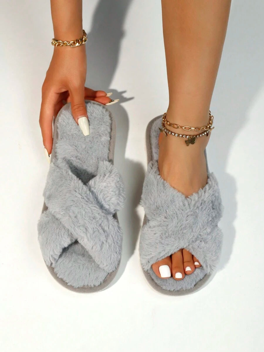 MIU Women's Fashionable Brown Plushy Cross Strap Fluffy Slippers, Soft Sole Comfortable Indoor Silent Bedroom Slippers