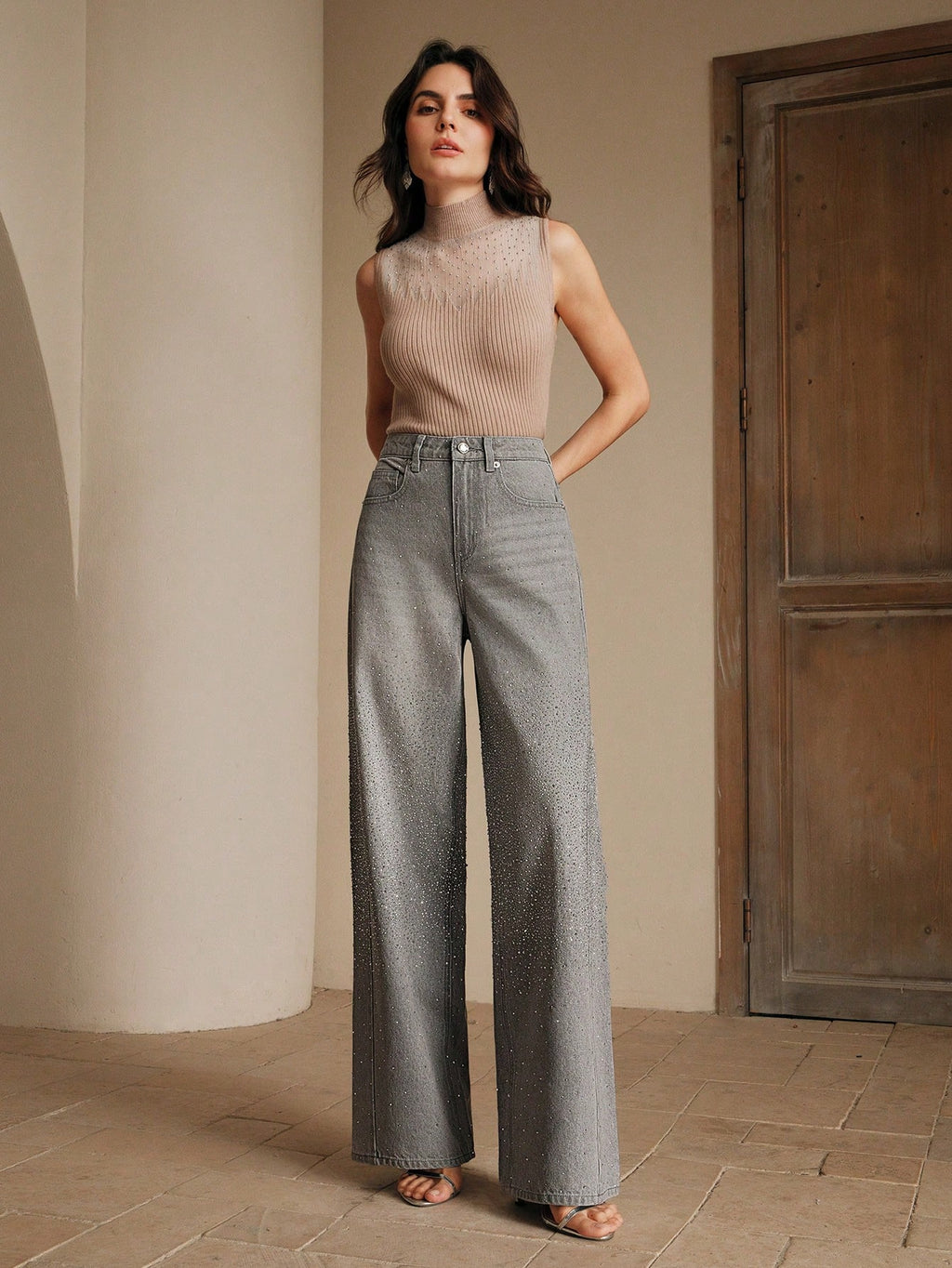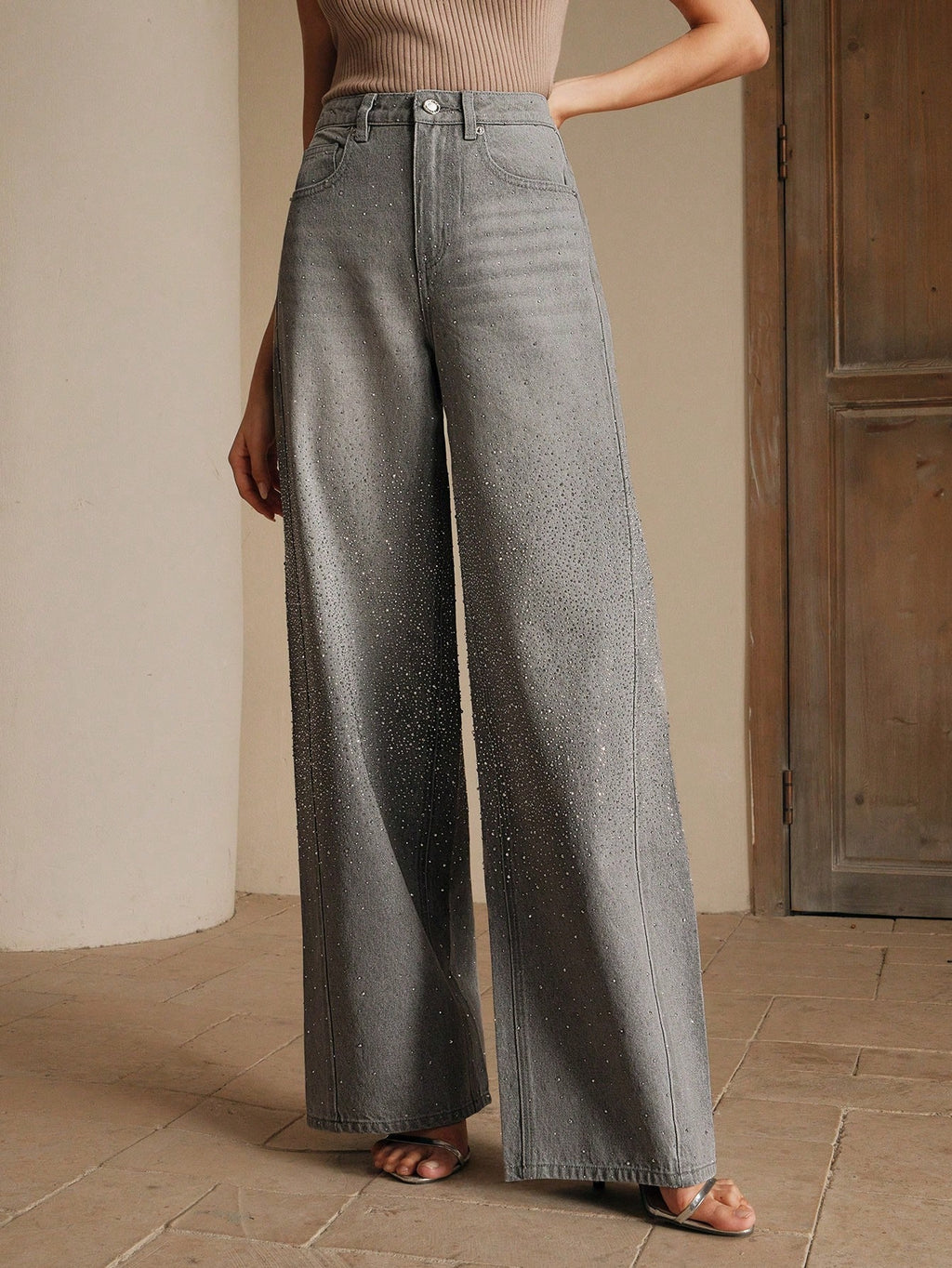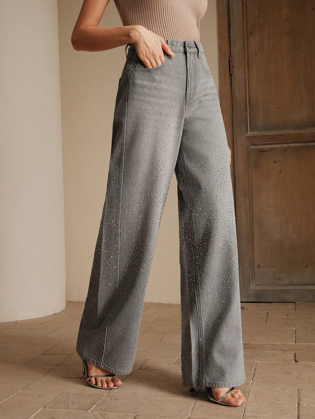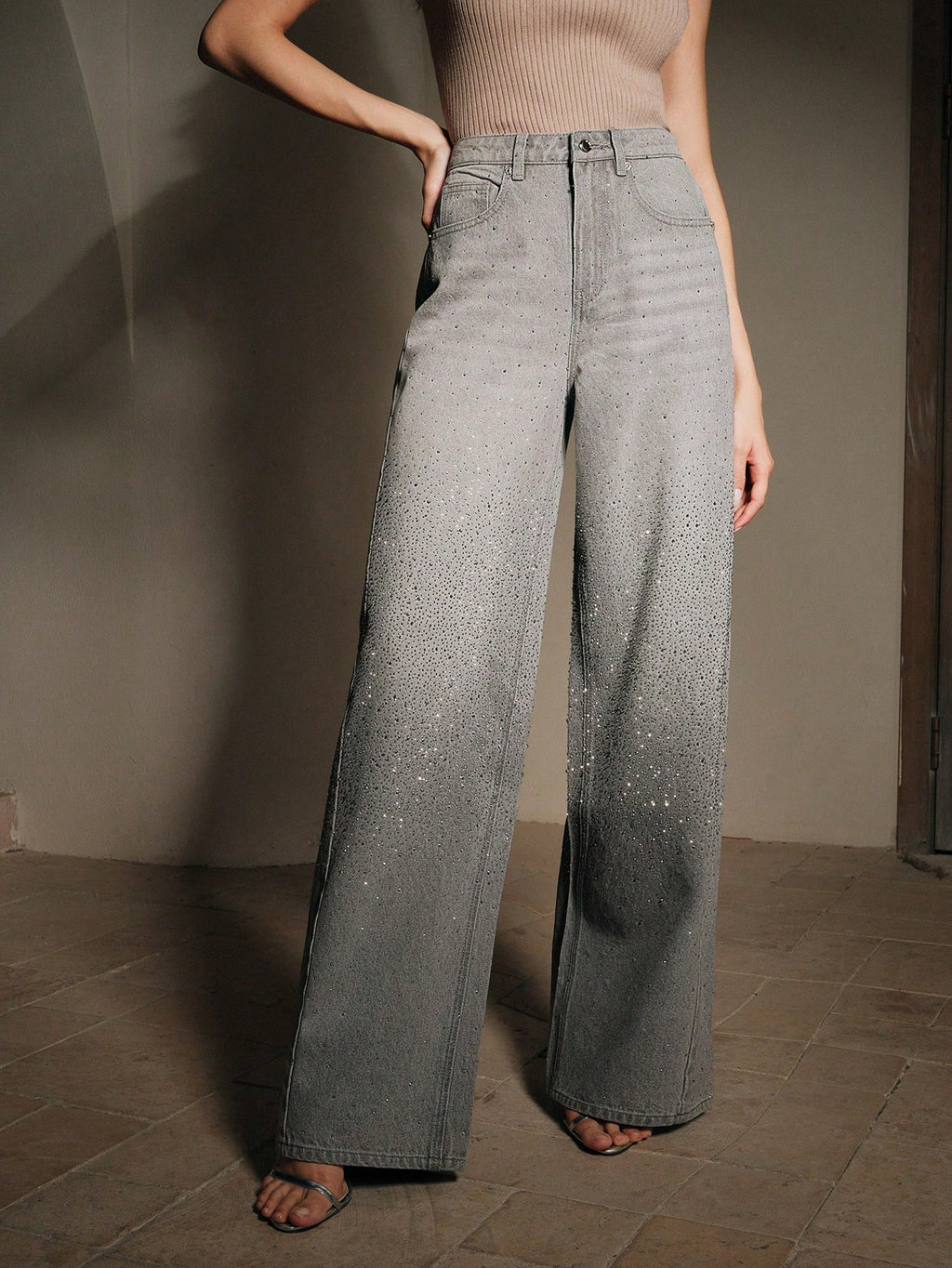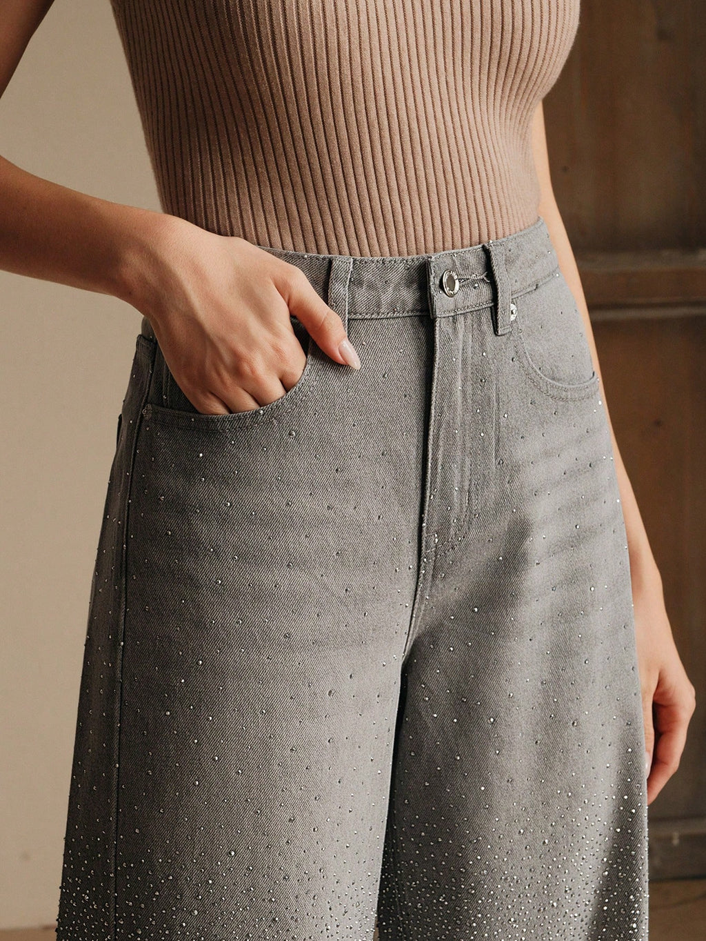 MIU Women's Fashionable Gray Rhinestone Studded Denim Jeans