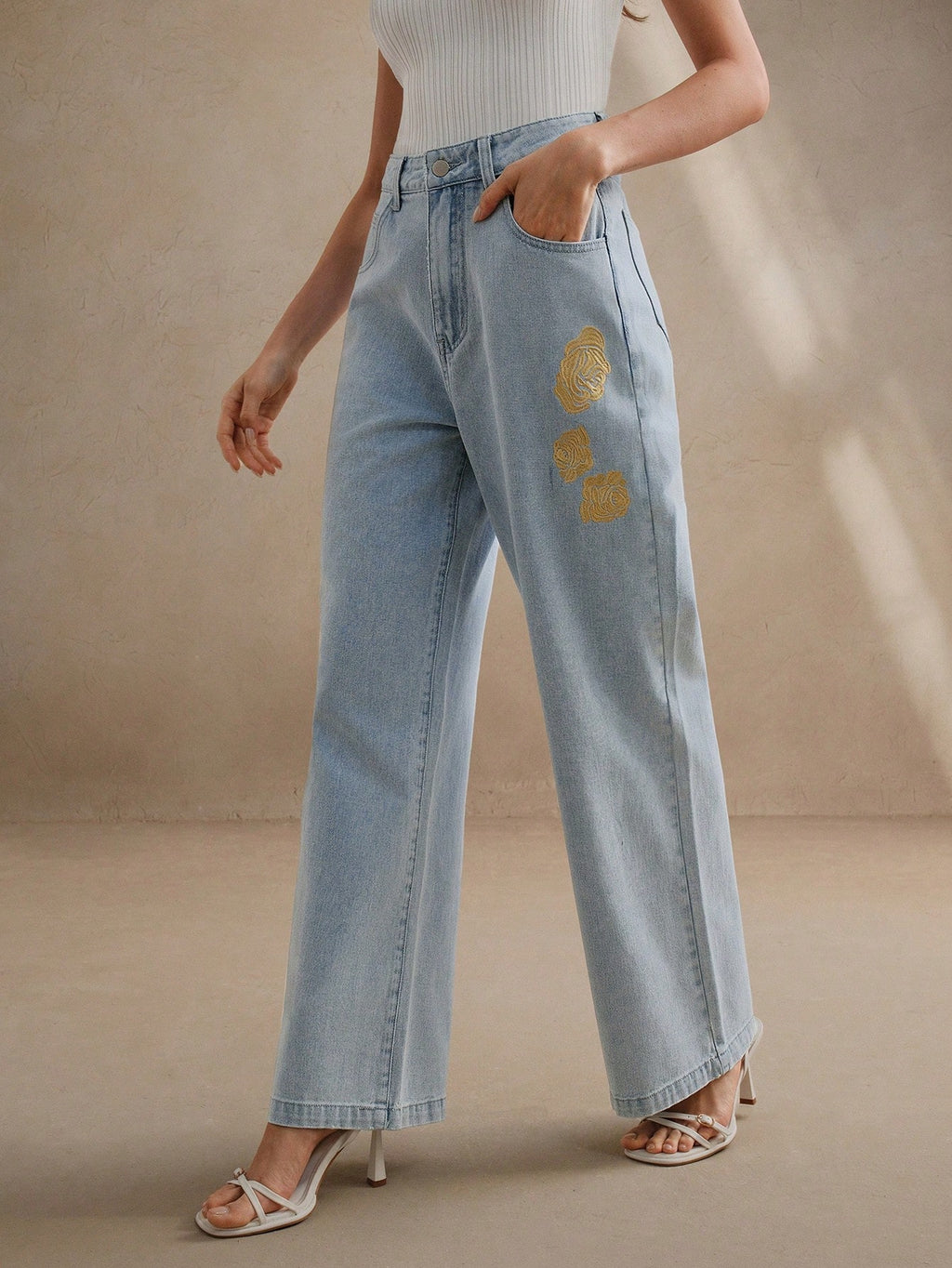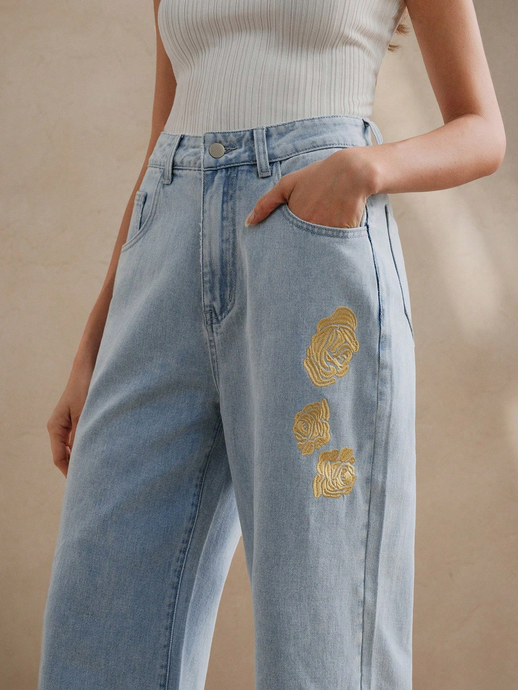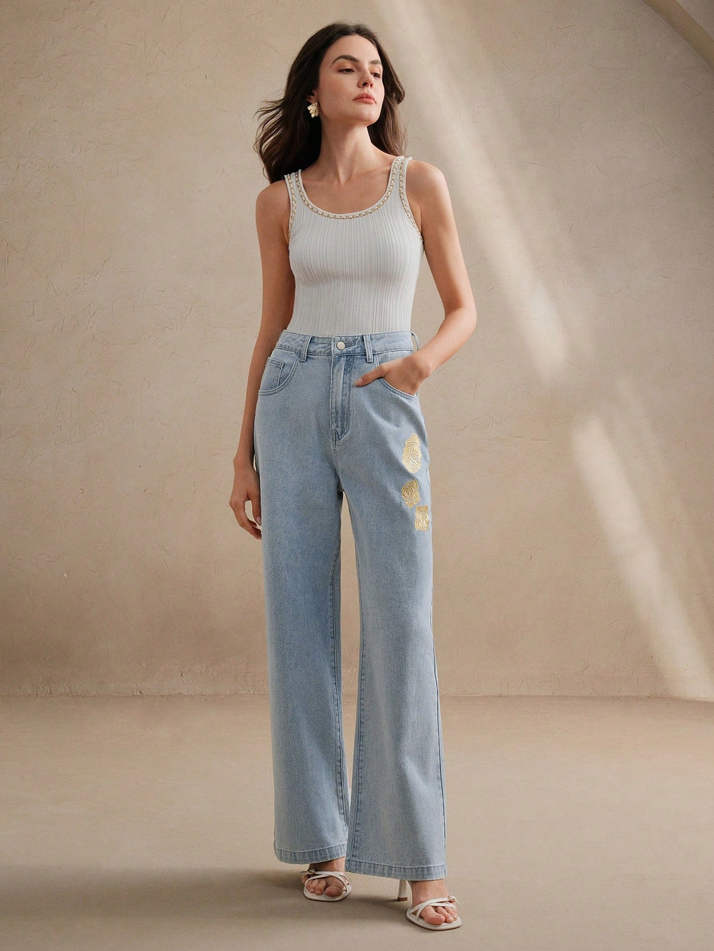 MIU Women's Floral Embroidered Vintage Premium High Luxury Denim Jeans