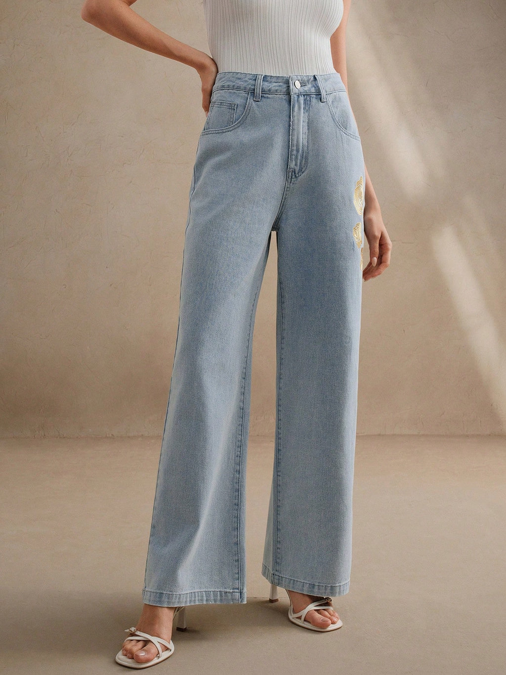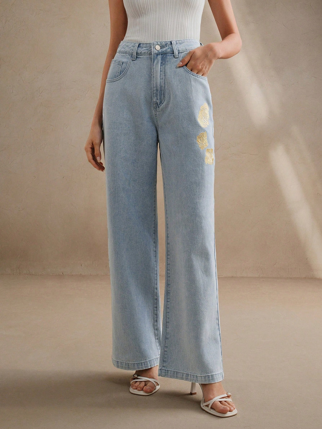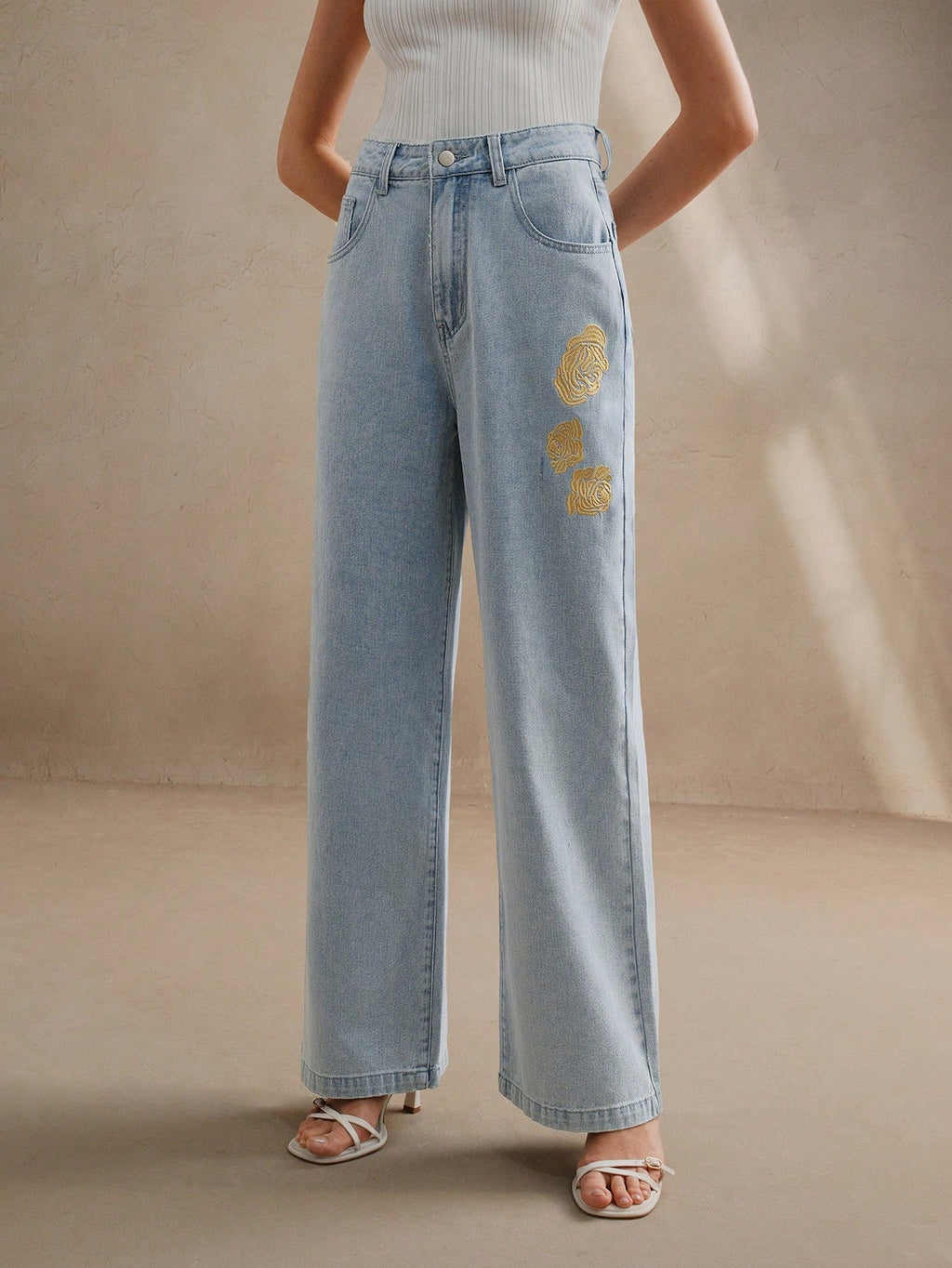 MIU Women's Floral Embroidered Vintage Premium High Luxury Denim Jeans