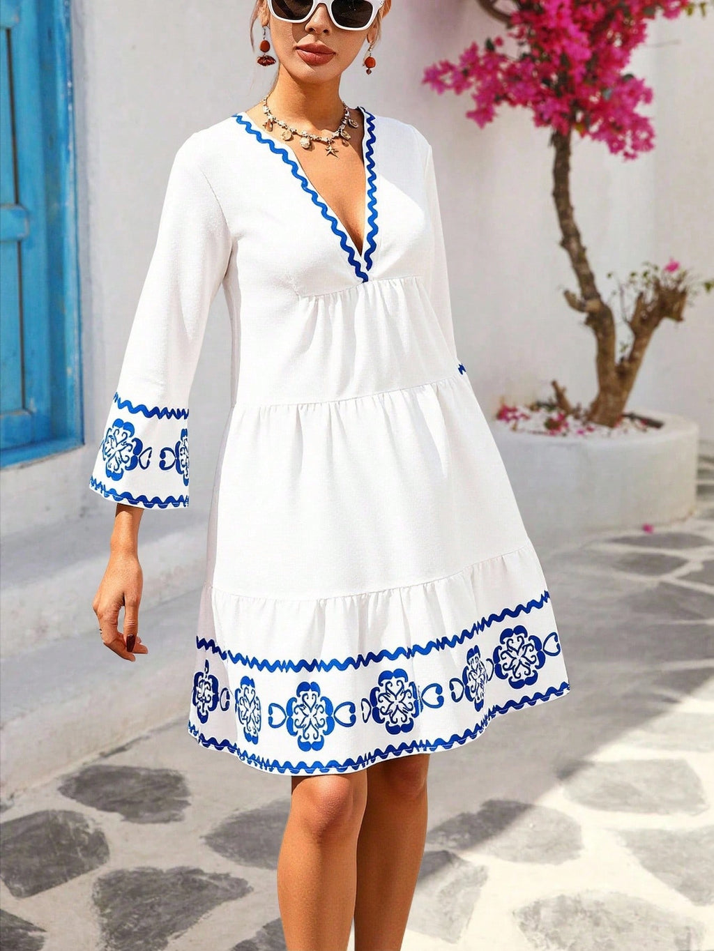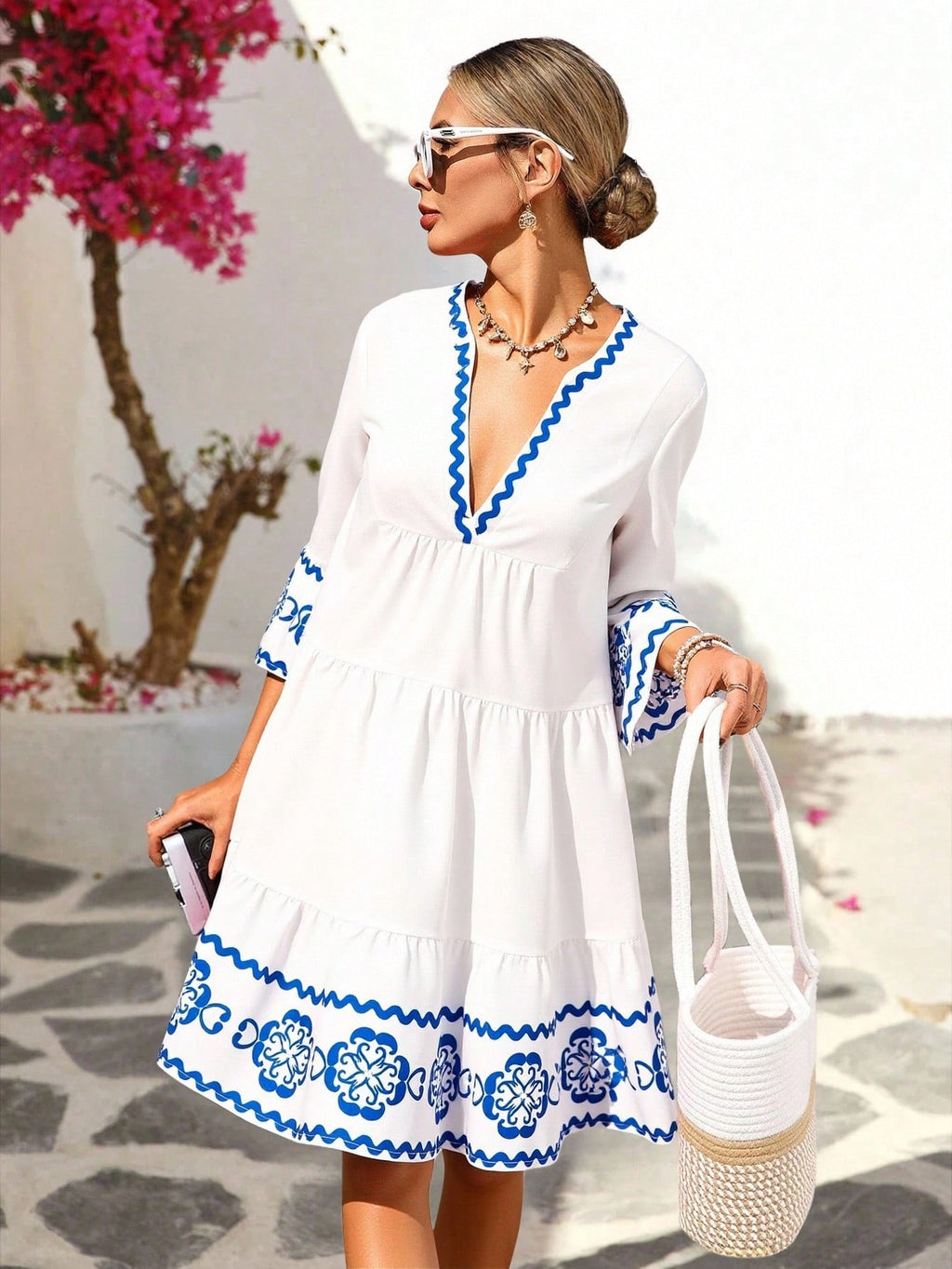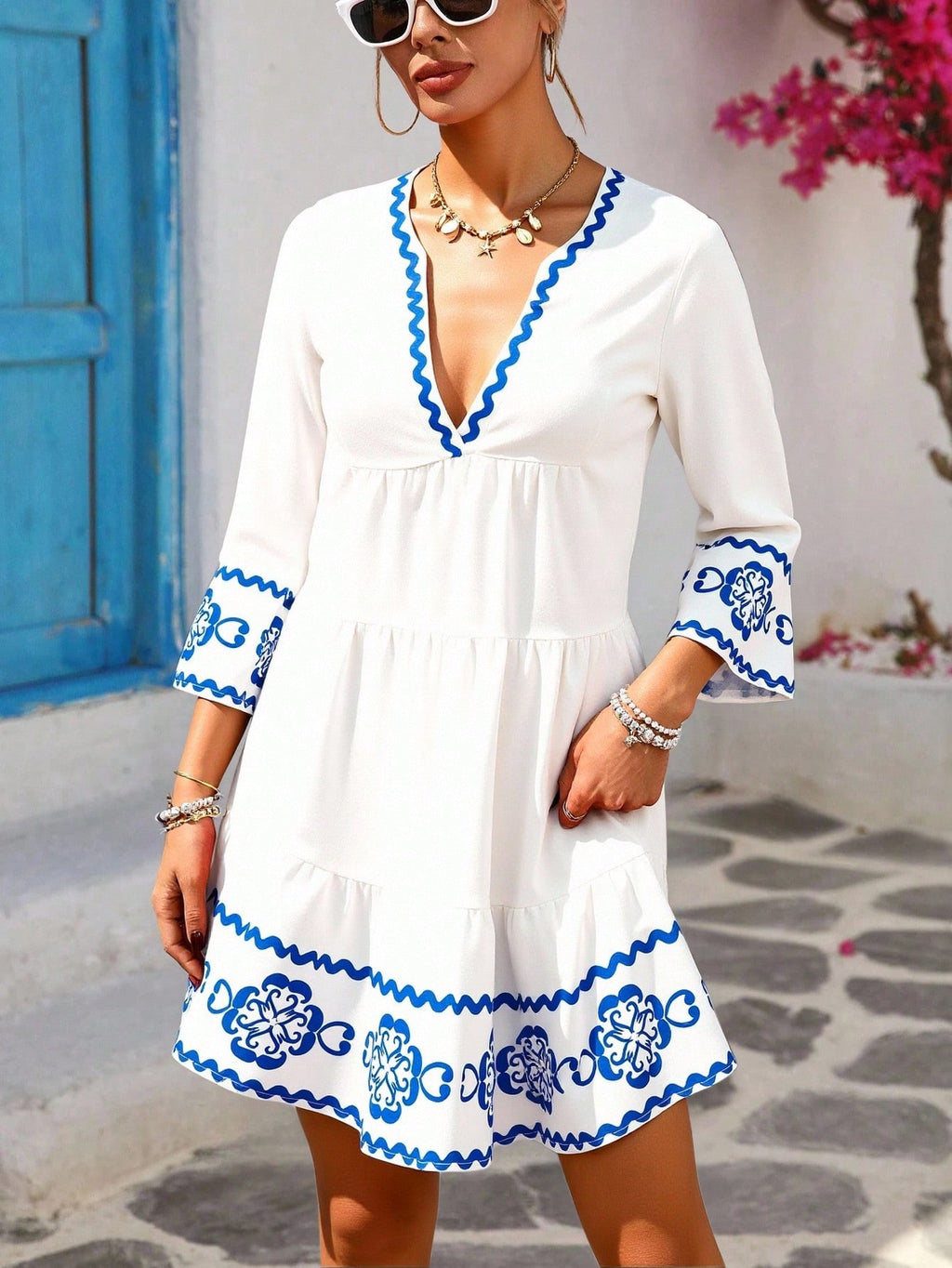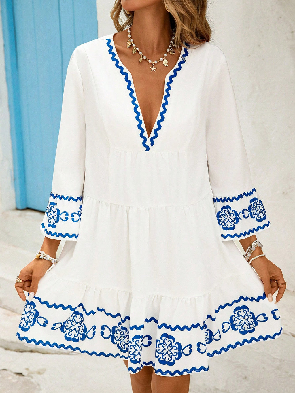MIU Women's Graphic Print Cutout Neck Casual Vacation Long Sleeve Mini Dress, Vacation Dress, Embroidered Dress, Blue And White Dress, White Boho Dress,Vacation Style Beach Print Loose Fit Dress,Blue