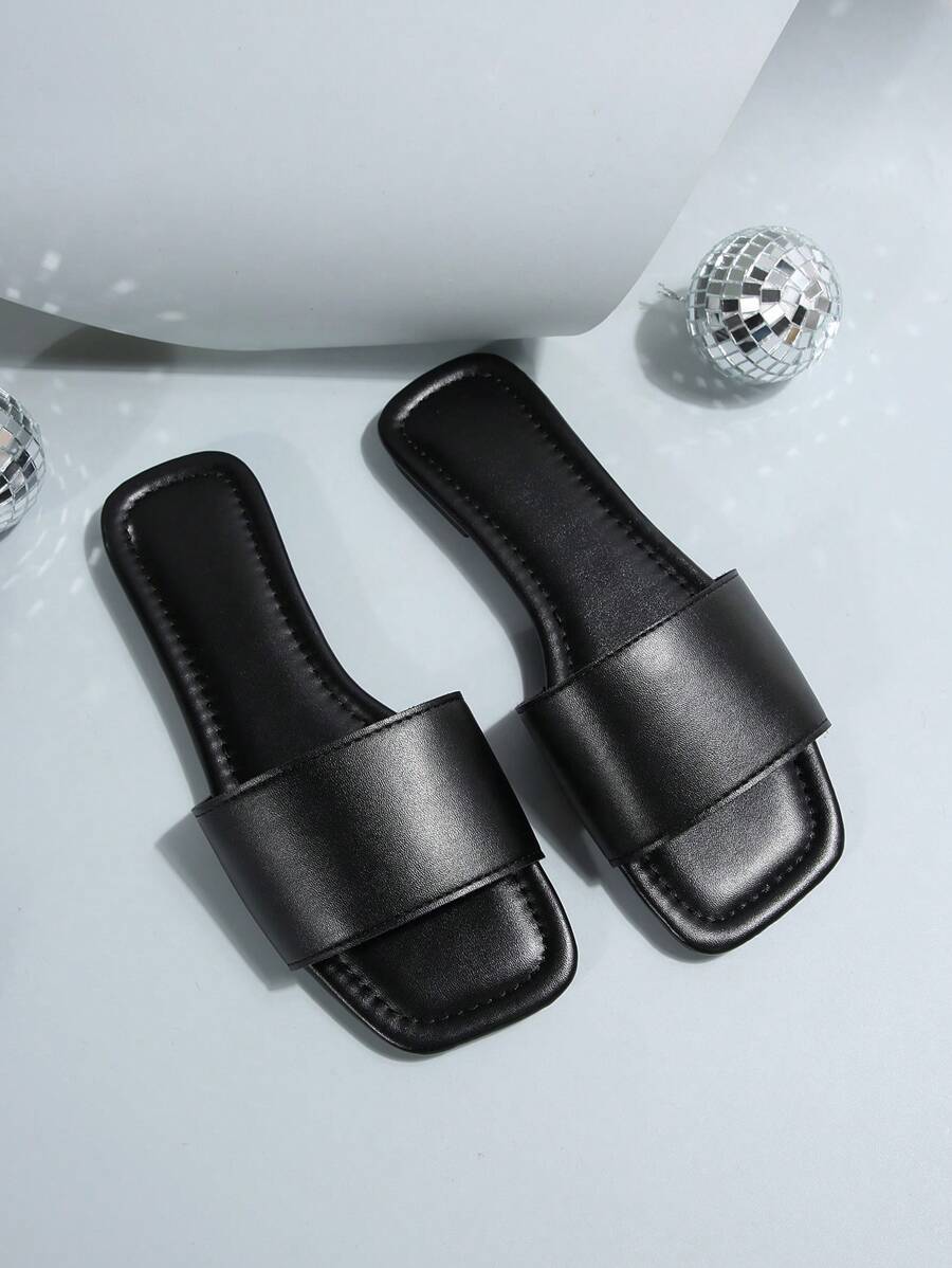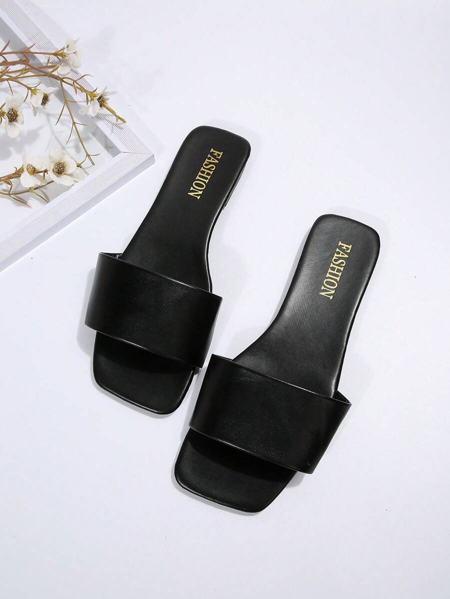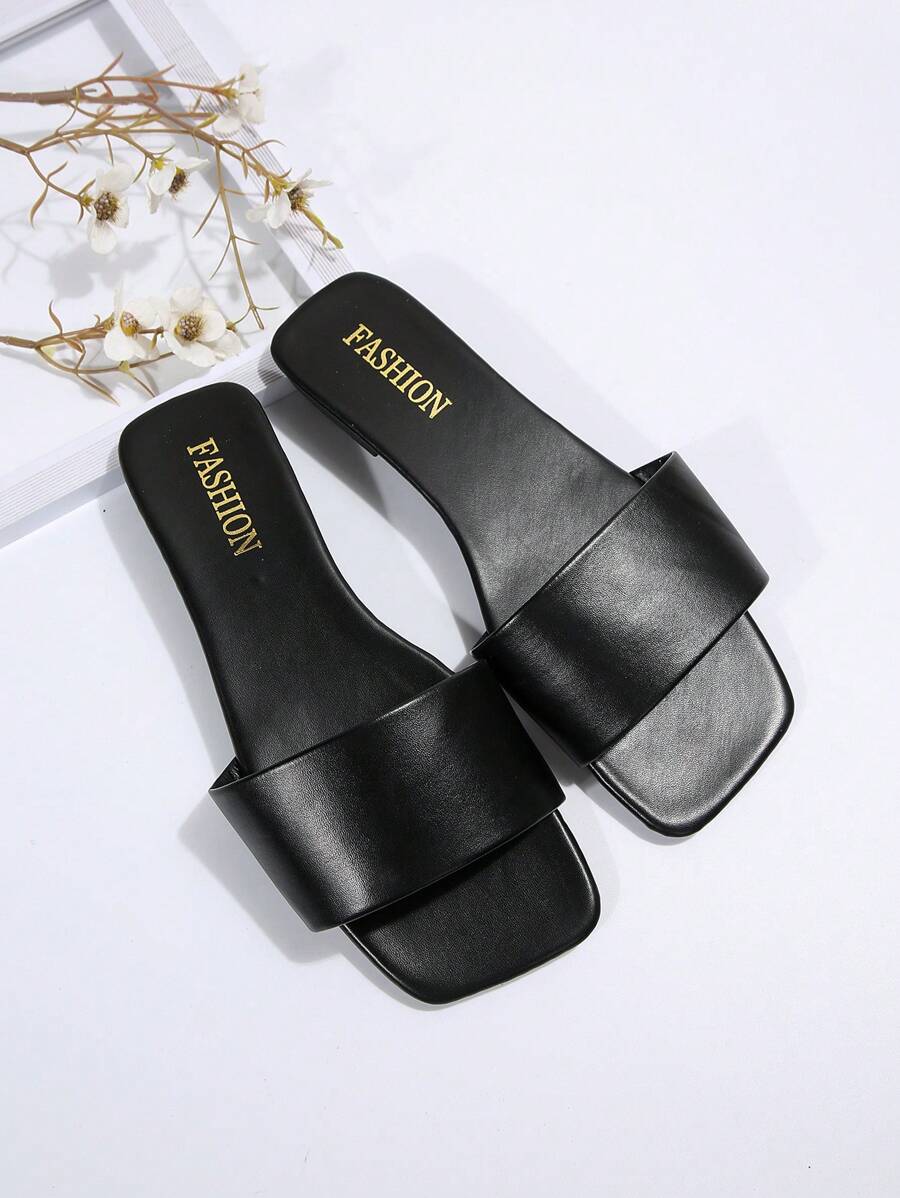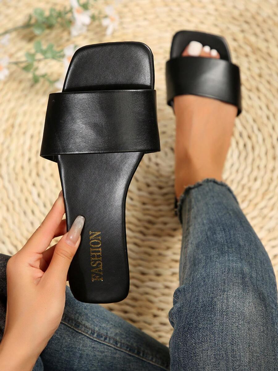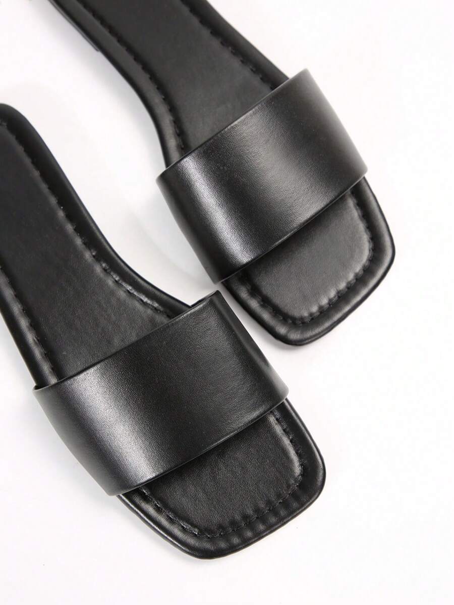 MIU Women's Leather One-Piece Flat Slide Sandals, Black Lightweight Soft Bottom Low Heel Slip-On Mule Sandals For Summer Casual Wear