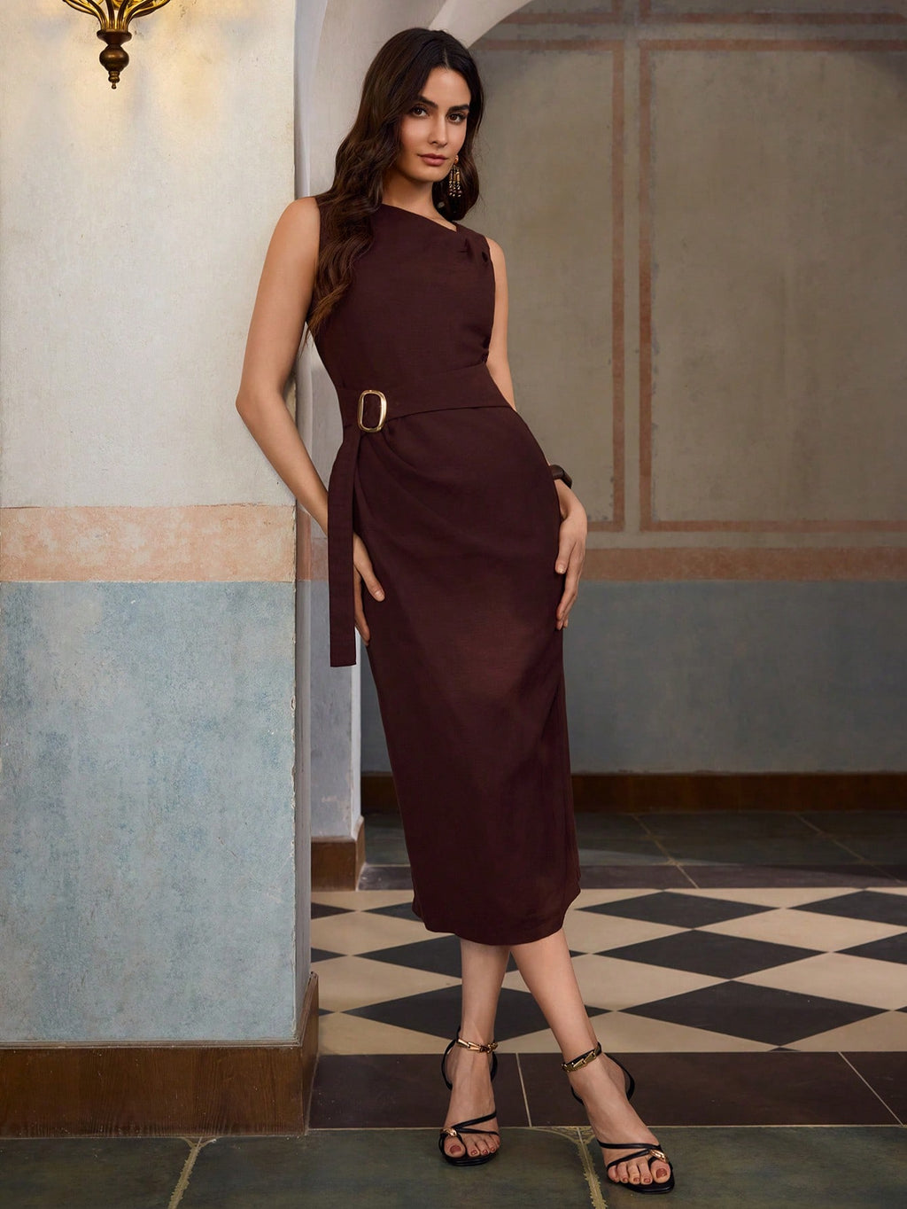 MIU Women's Metal Buckle Sleeveless Linen Long Dress, Summer Vacation