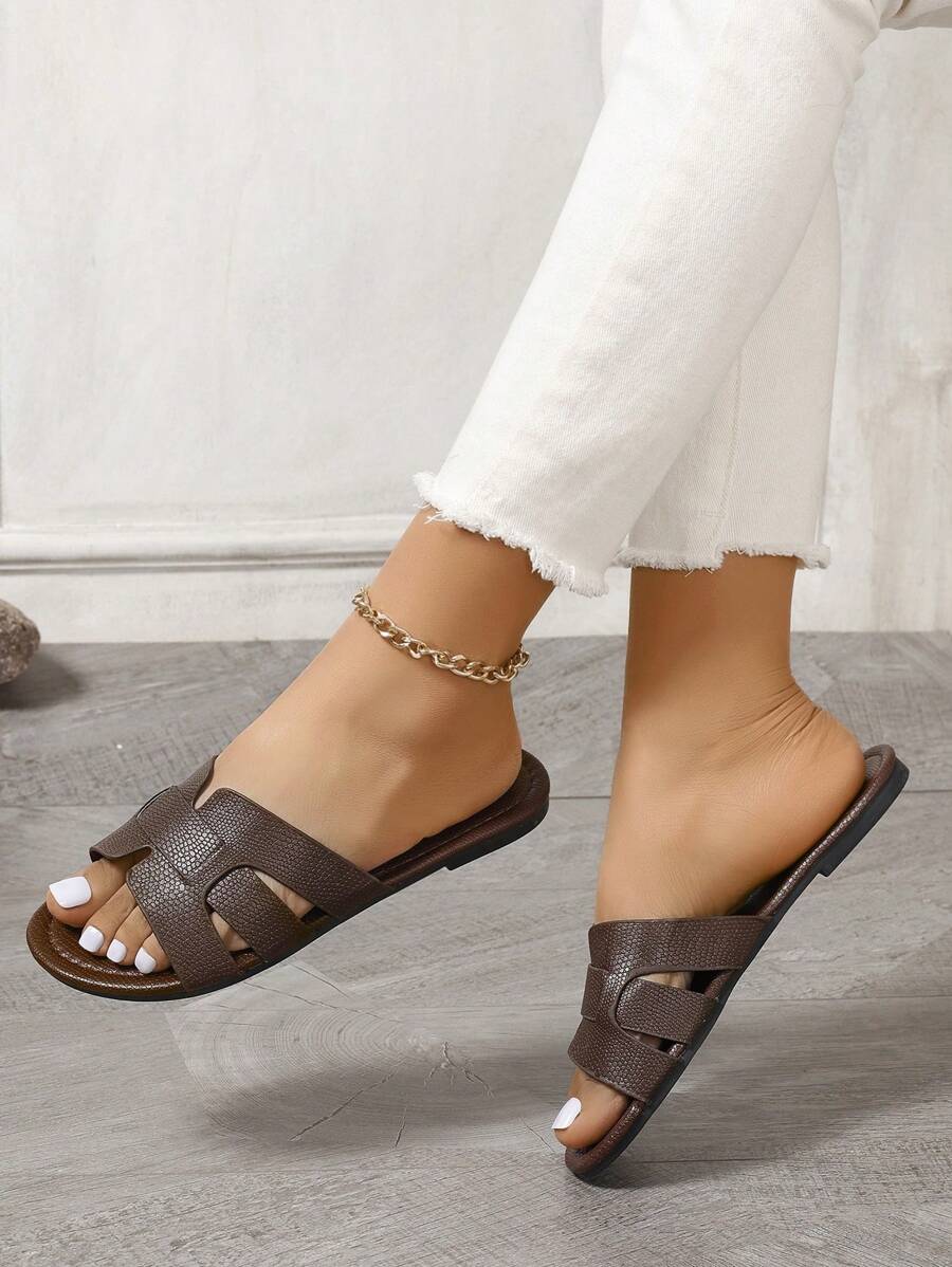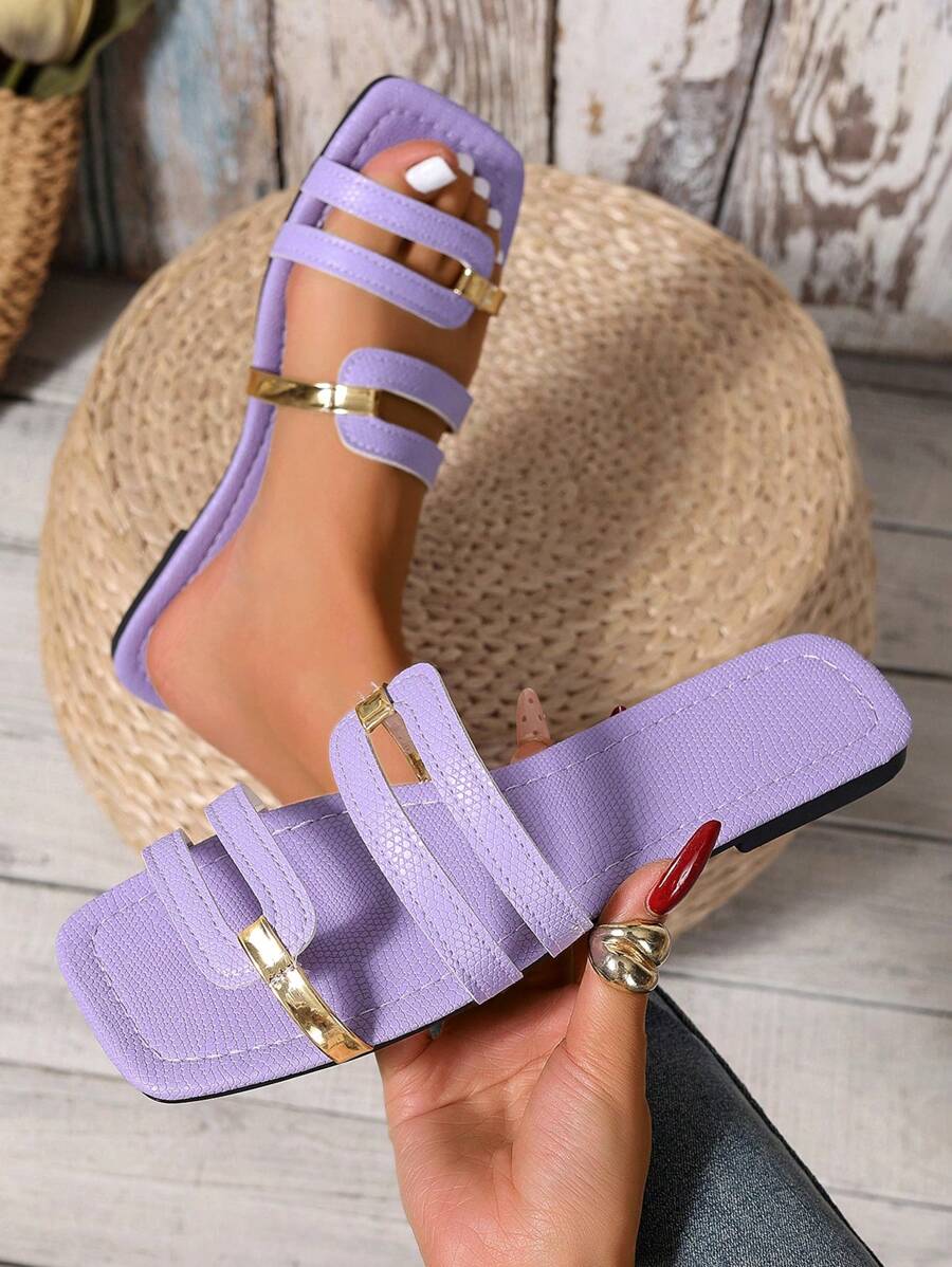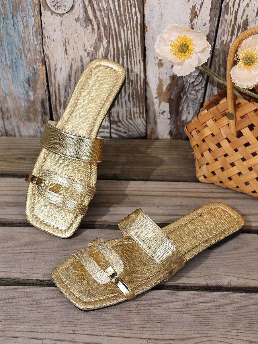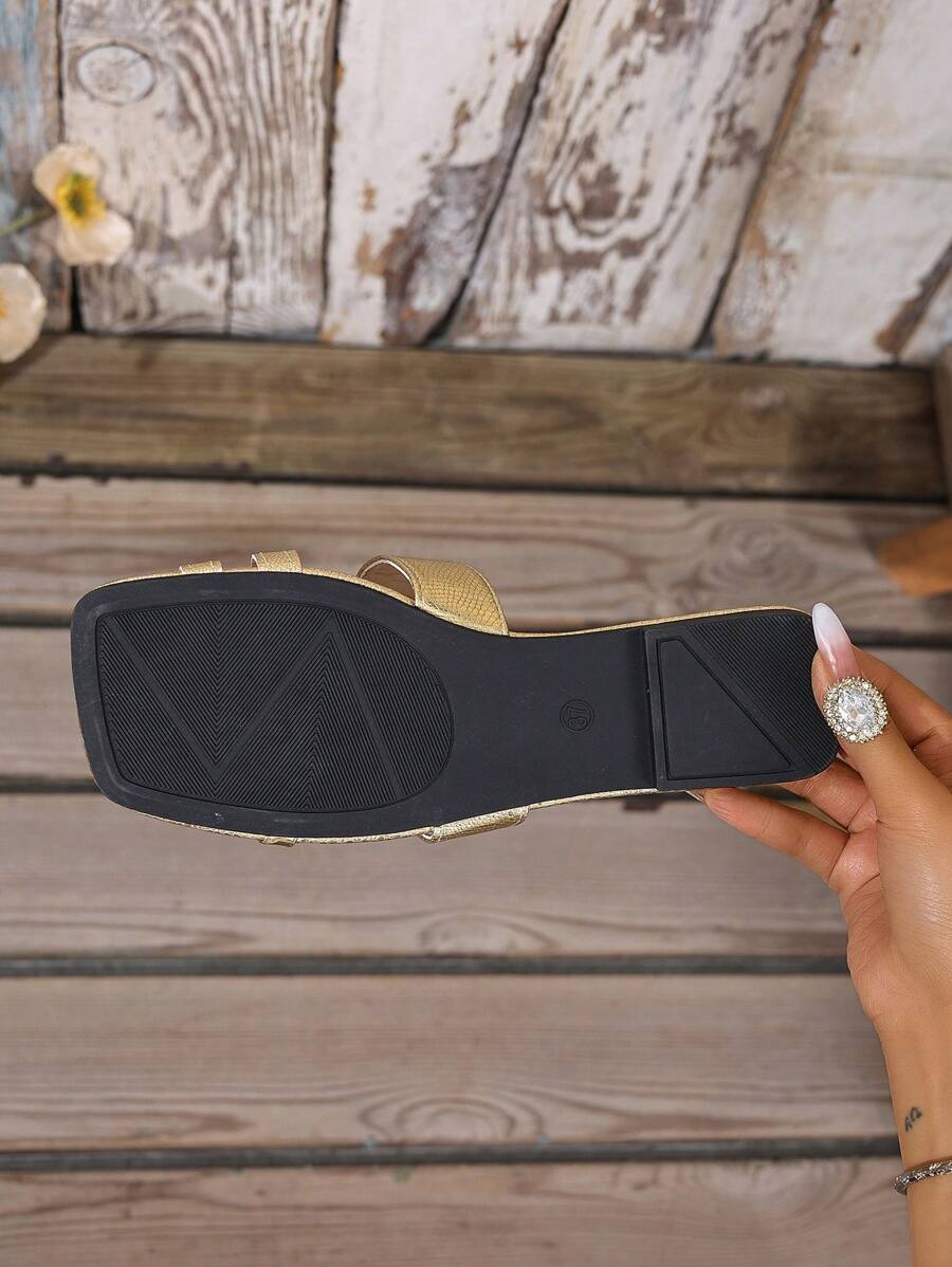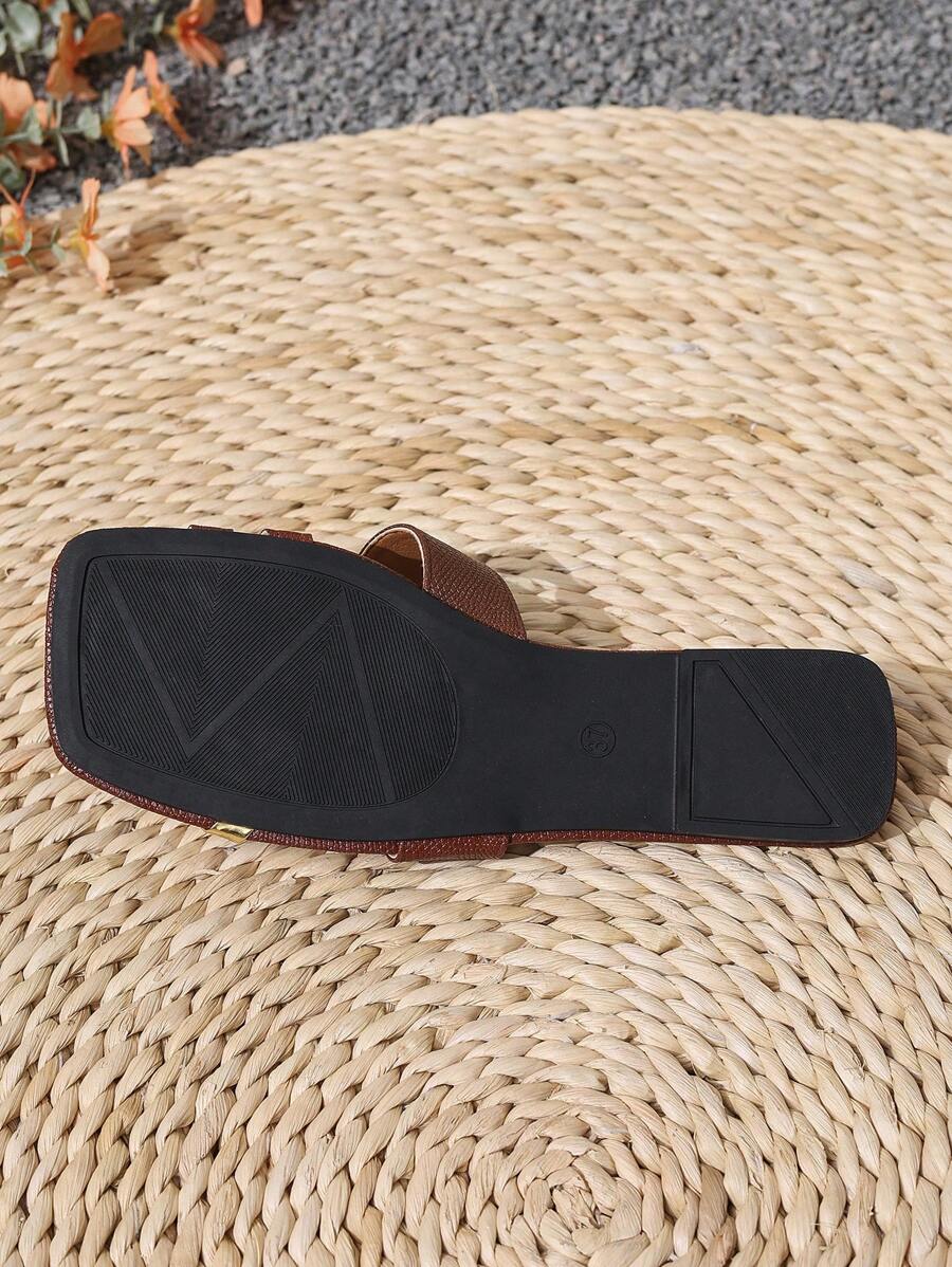 MIU Women's New Brown Square Toe Gold Strap Hollow Open Toe Casual Slip-On Sandals For Summer Vacation, Beach, Daily Wear
