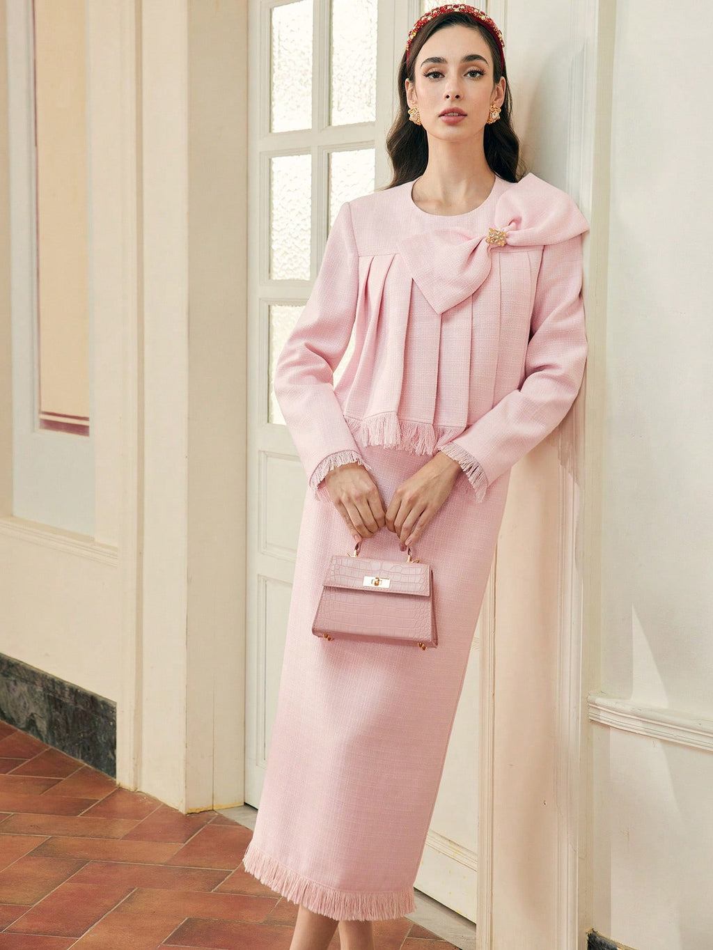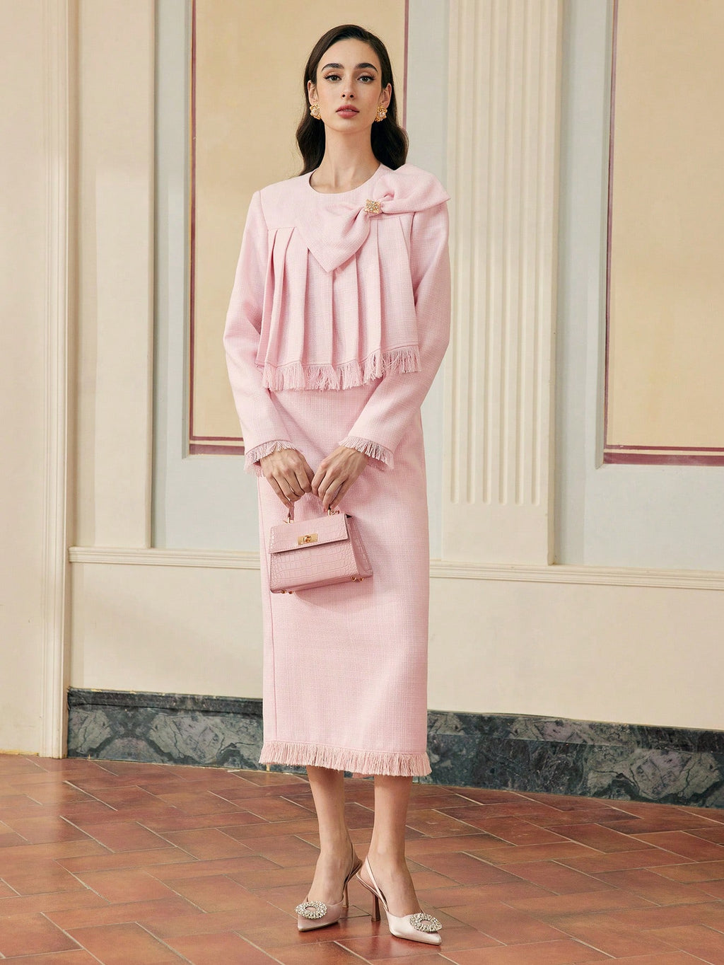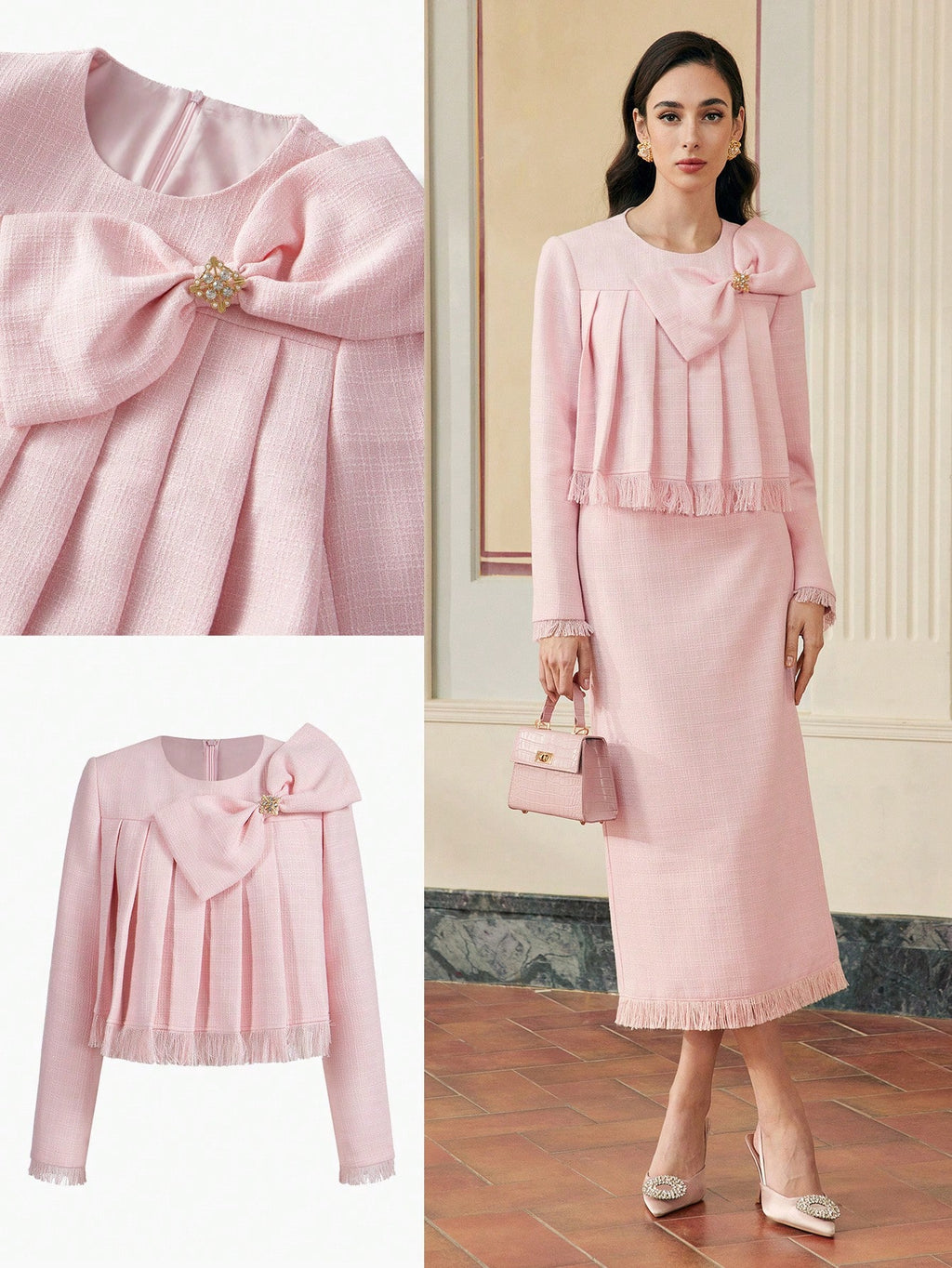 MIU WOMEN'S PLEATED BOW ZIPPER BACK JACKET WITH FRINGE HEM FOR VALENTINE'S DAY, LIGHTWEIGHT TWEED FABRIC,SPRING SUMMER