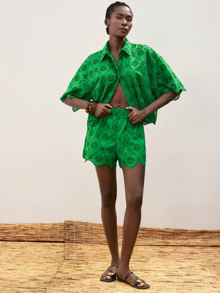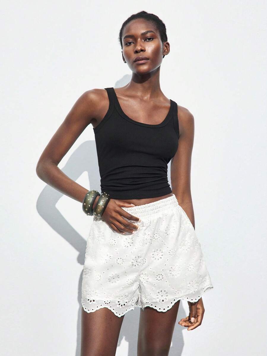 MIU Women's Red Summer Clothing, Hollow Cotton Embroidered Fabric, Wavy Hem Bohemian Style Vacation Beach Fashion Simple Casual Solid Color Daily Wear Shorts, Hawaiian Theme Summer Music Festival