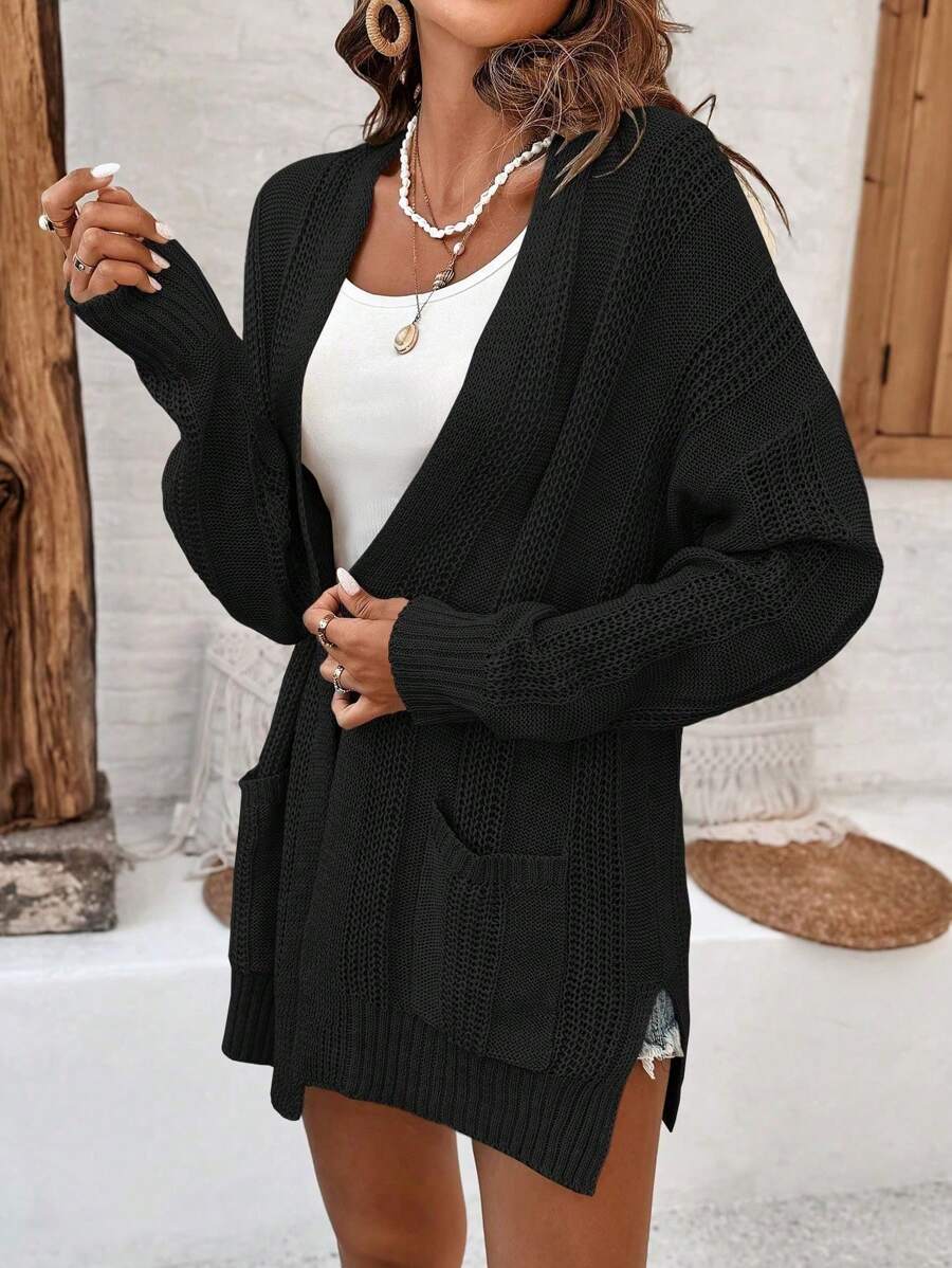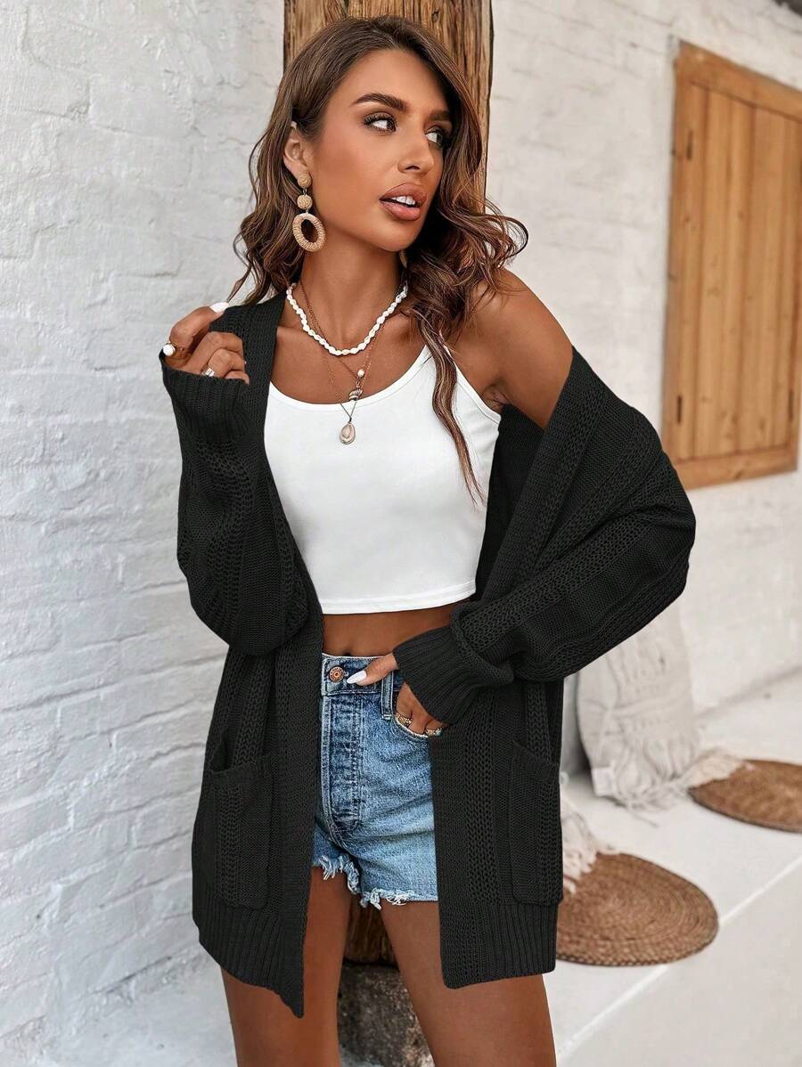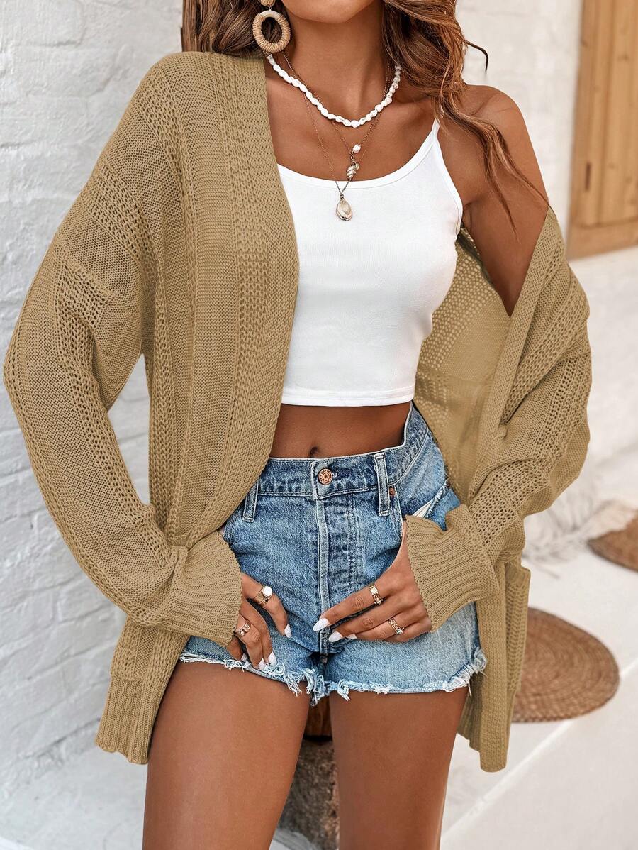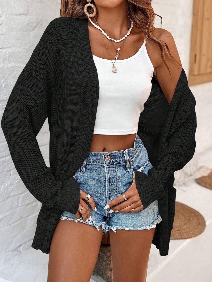 MIU Women's Solid Color Drop Shoulder Long Sleeve Cardigan With Double Pockets