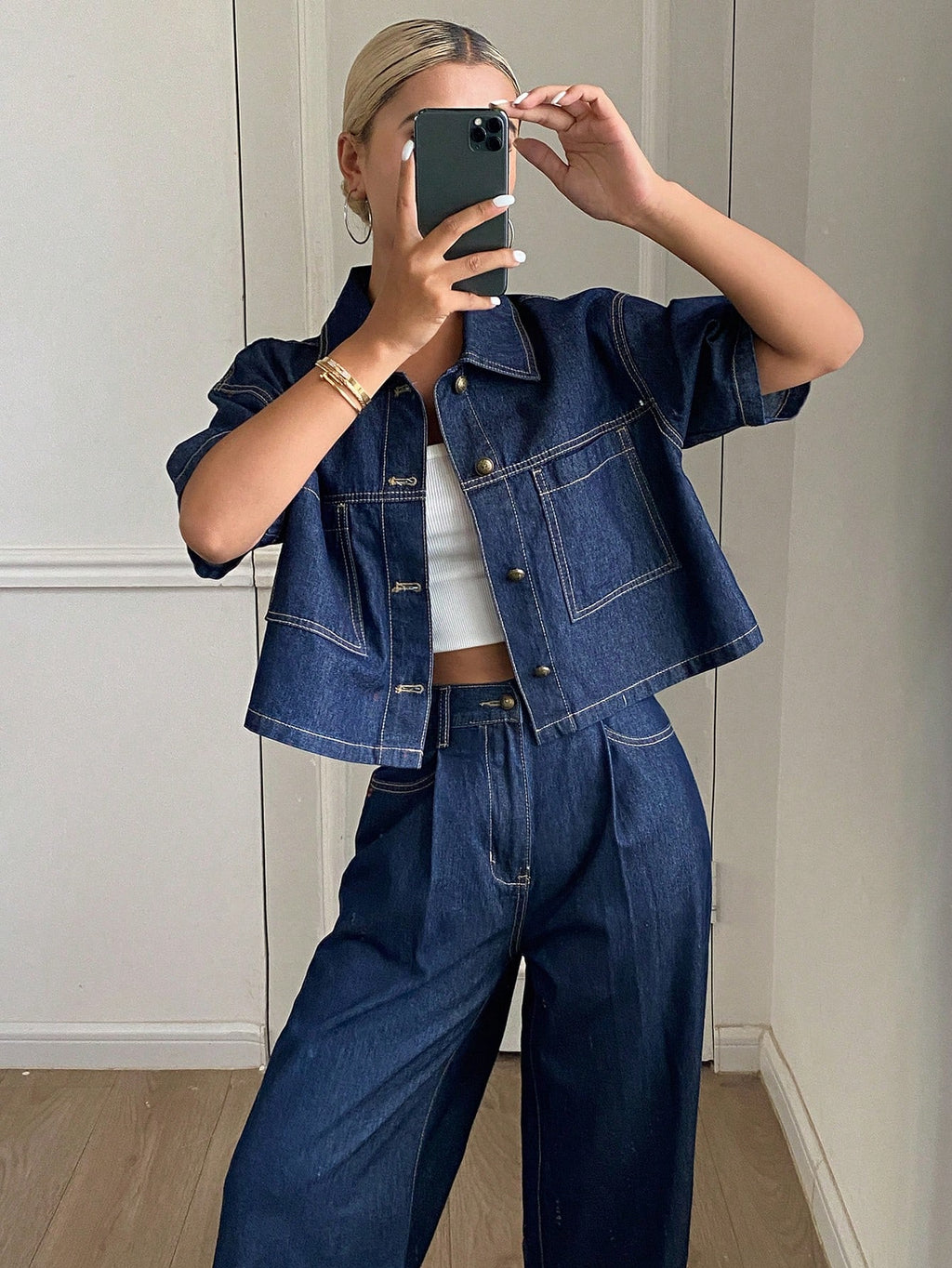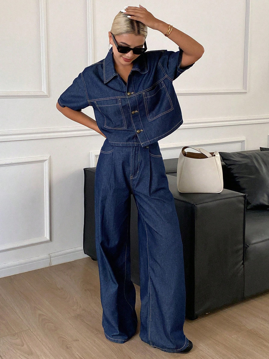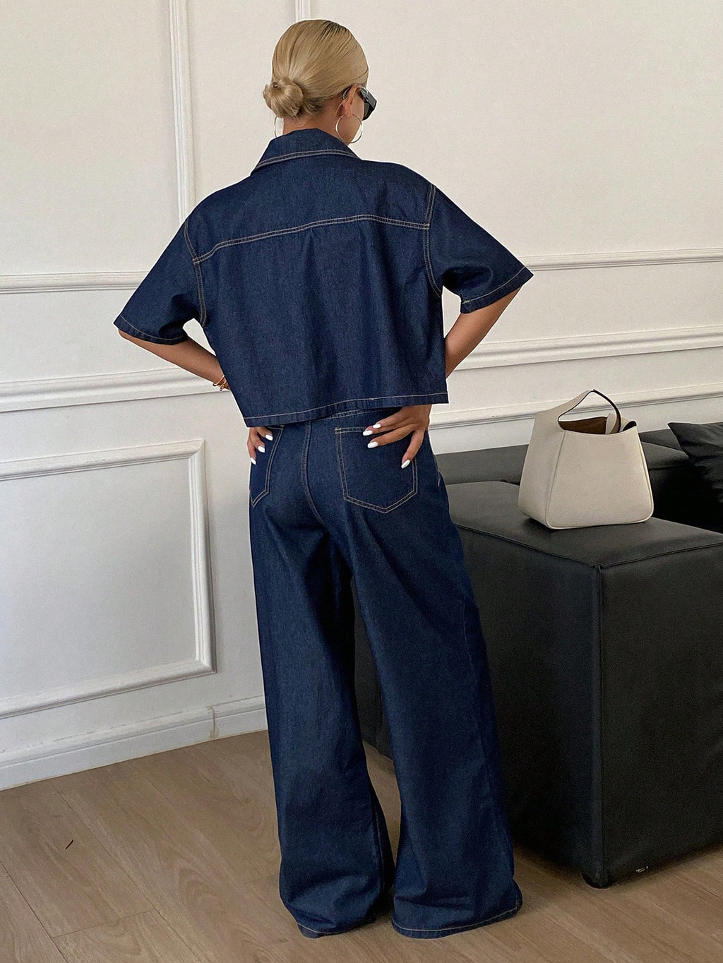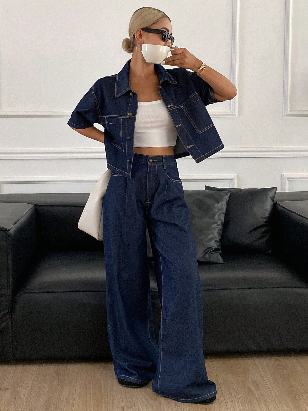 MIU Women's Summer Short Sleeve Blouse And Wide Leg Jeans Casual Loose Suit,Back To School Clothes