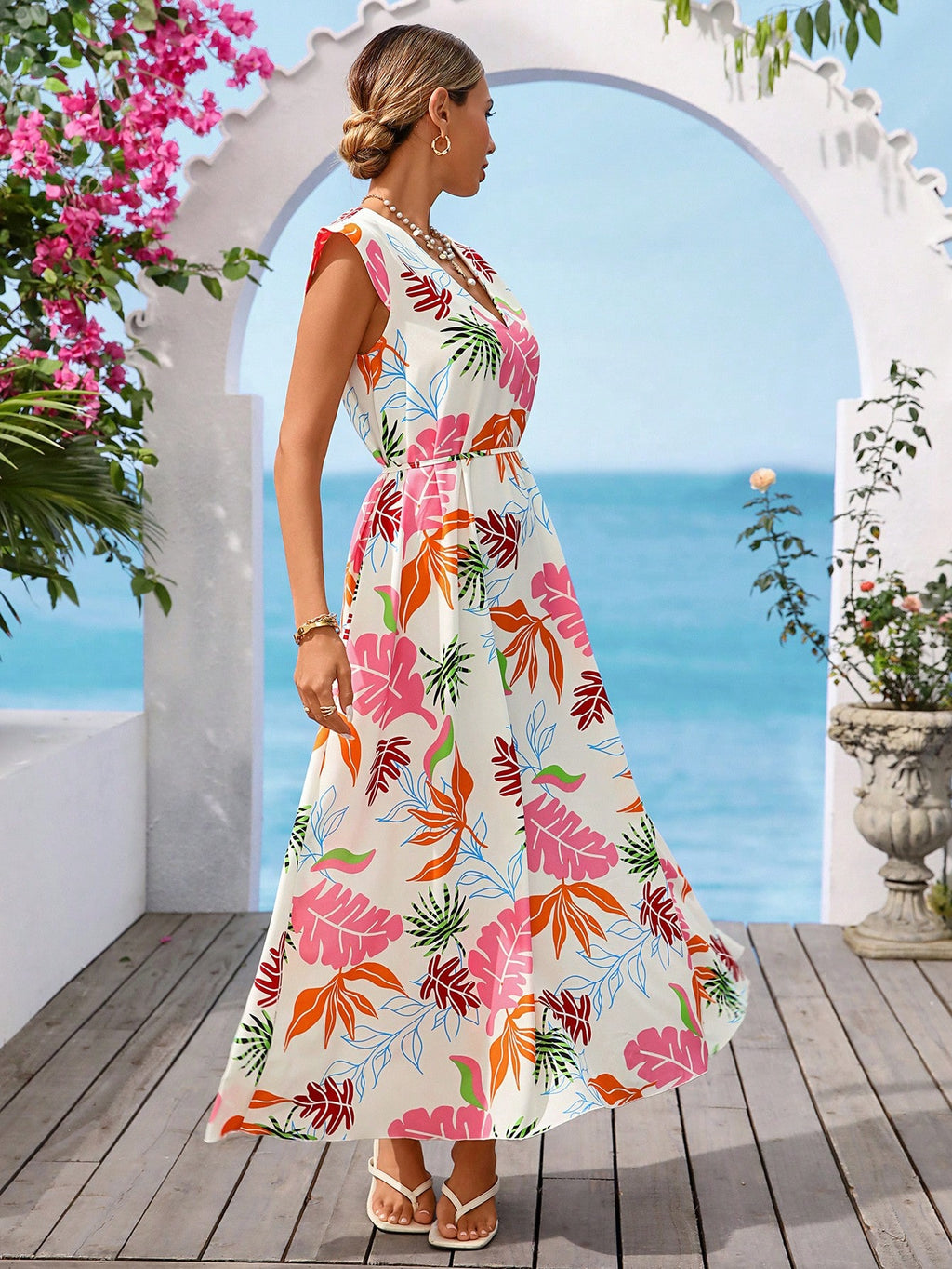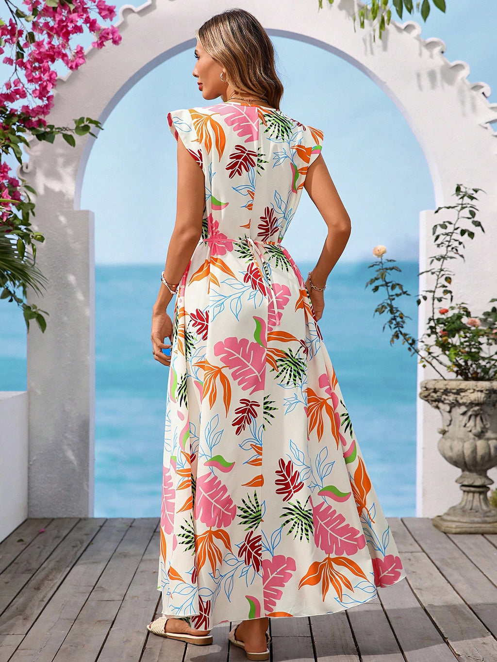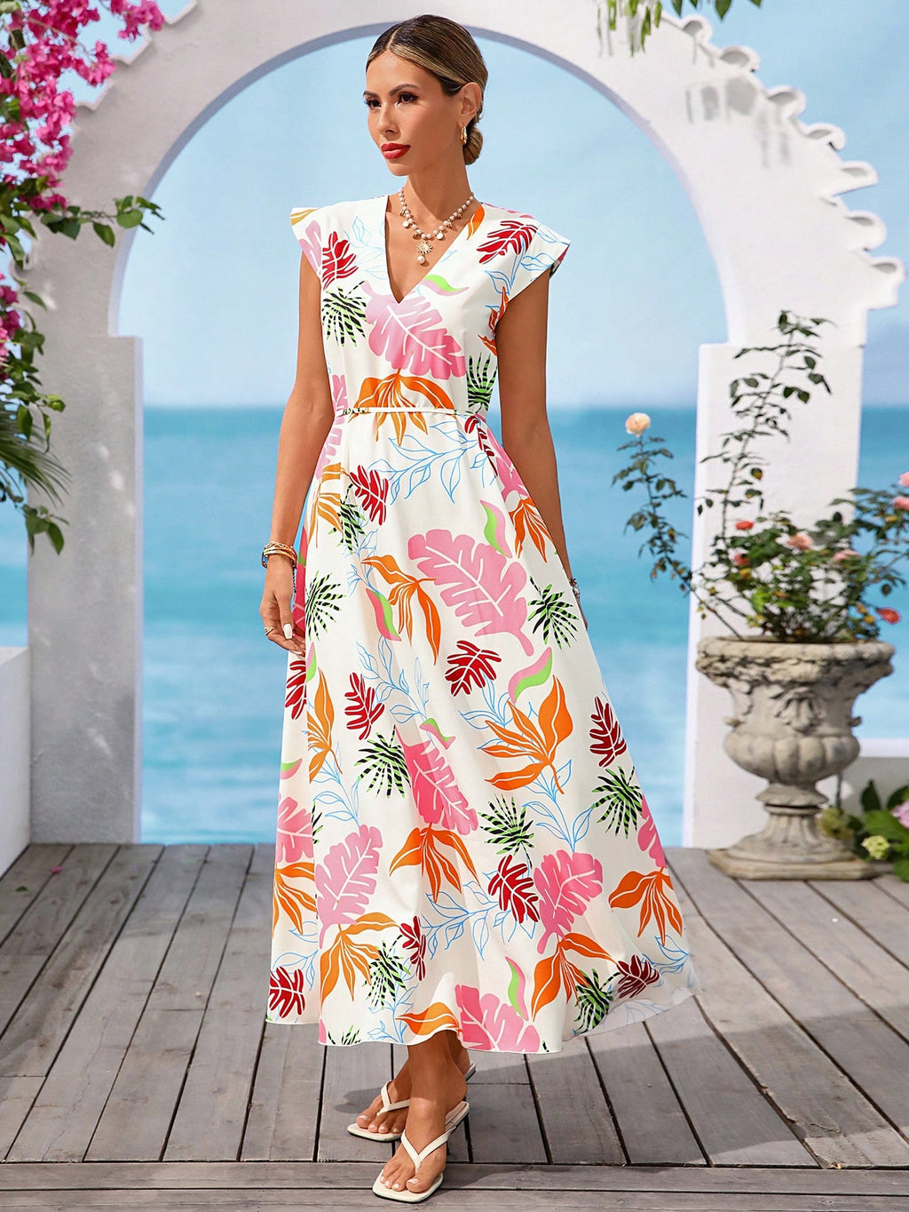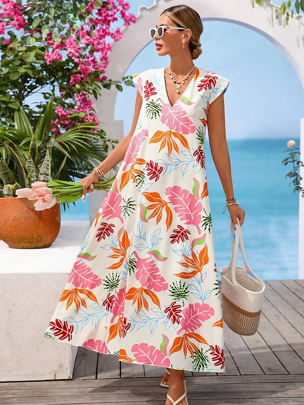 MIU Women's Summer Vacation Tropical Plant Print V-Neck Dolman Sleeve Dress, Summer Outfits For Women, Beach Vacation Outfits, Women Summer Clothing,Sundresses For Women