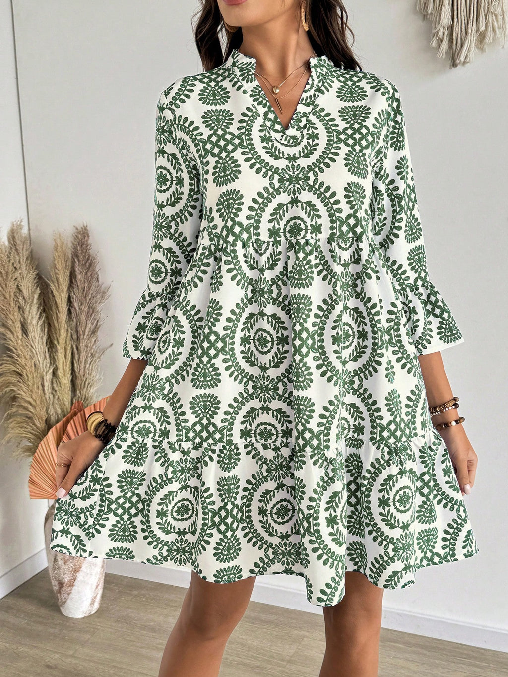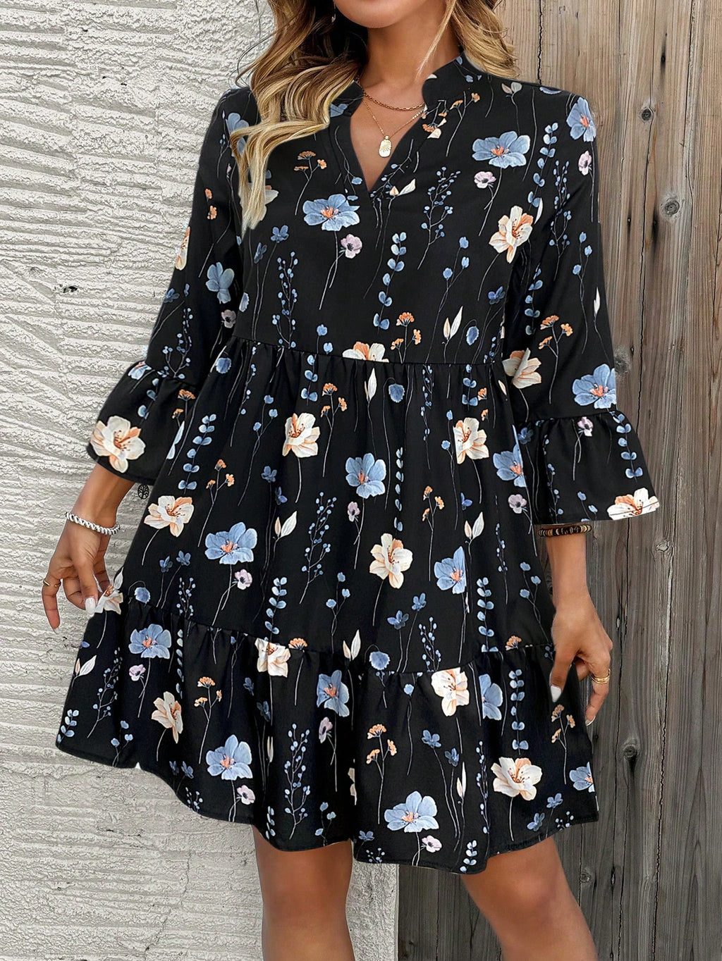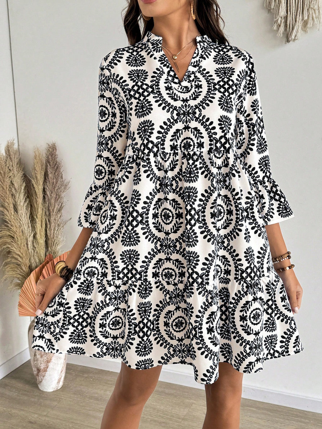 MIU AZRA Ženska Crna Crep Haljina sa Nabranom Ovratnikom i Rukavima u Zvonu