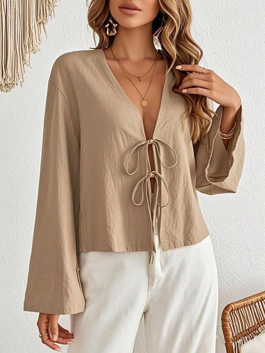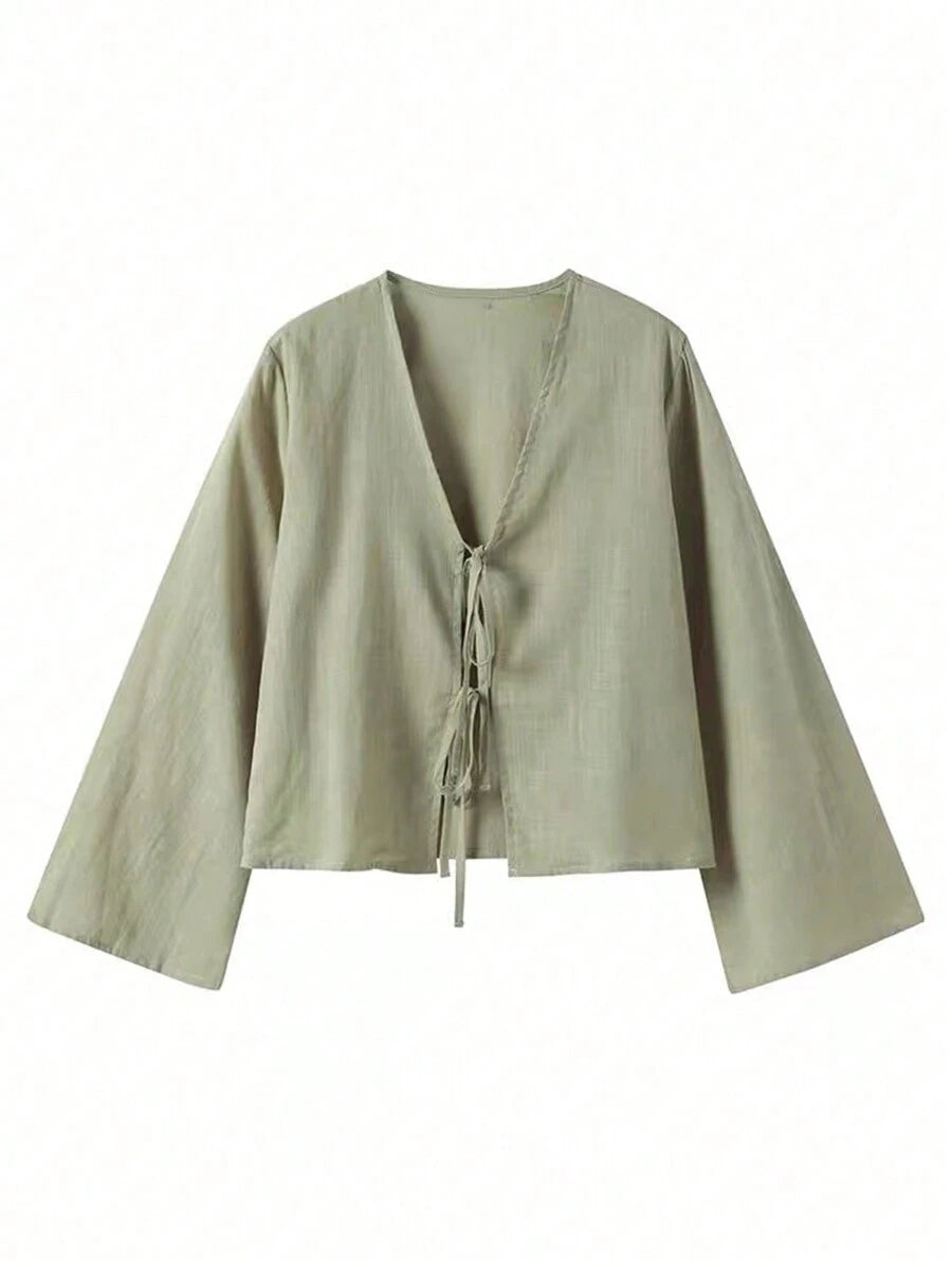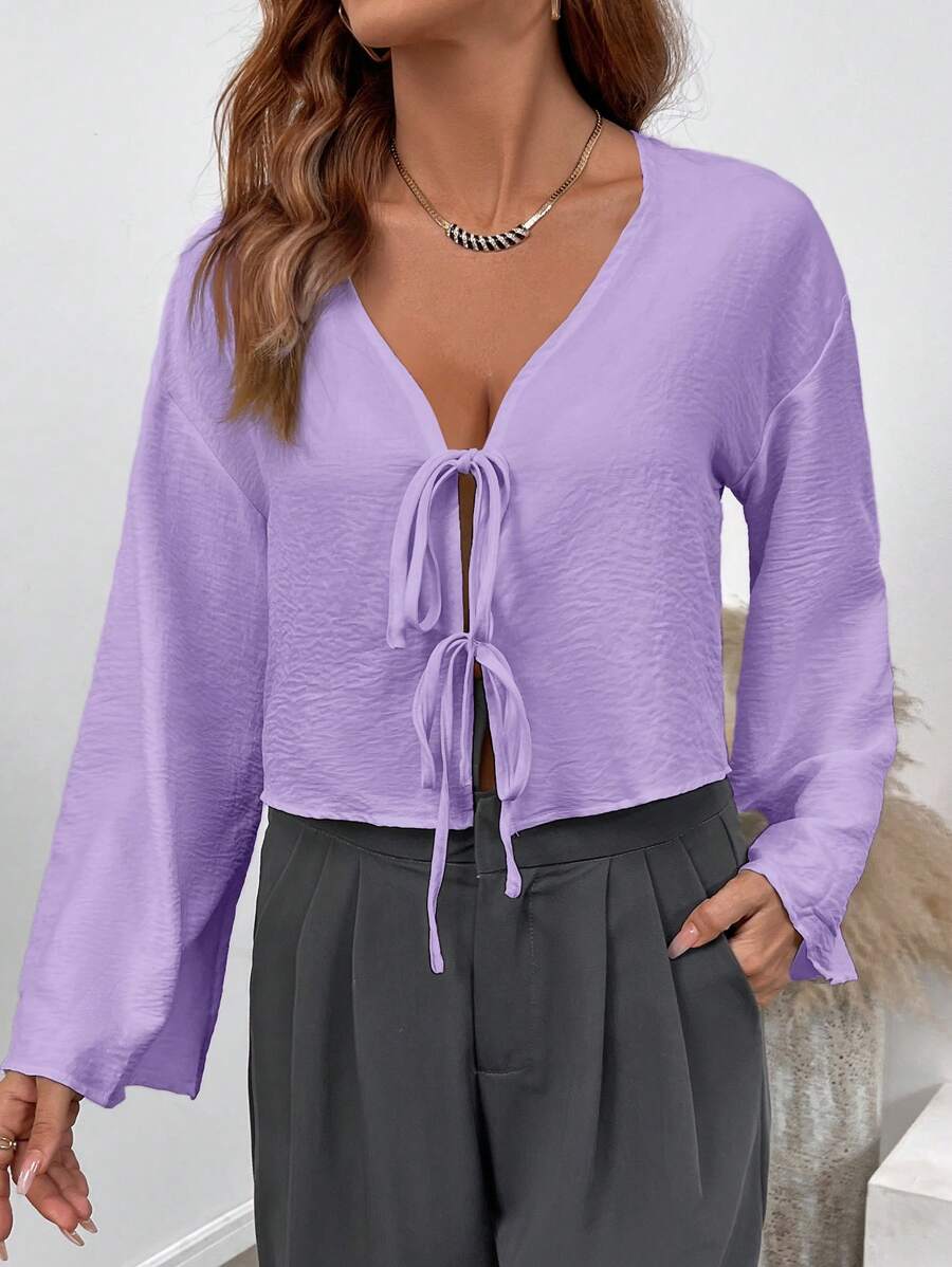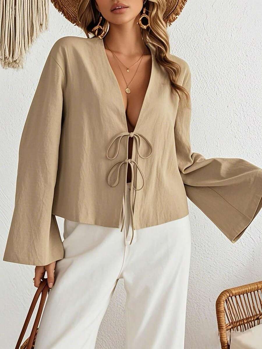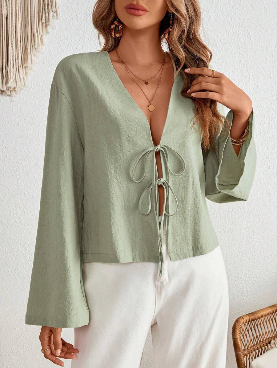 MIU Women's Vacation Casual Solid Color Tie Front Flare Sleeve Blouse Women Shirt