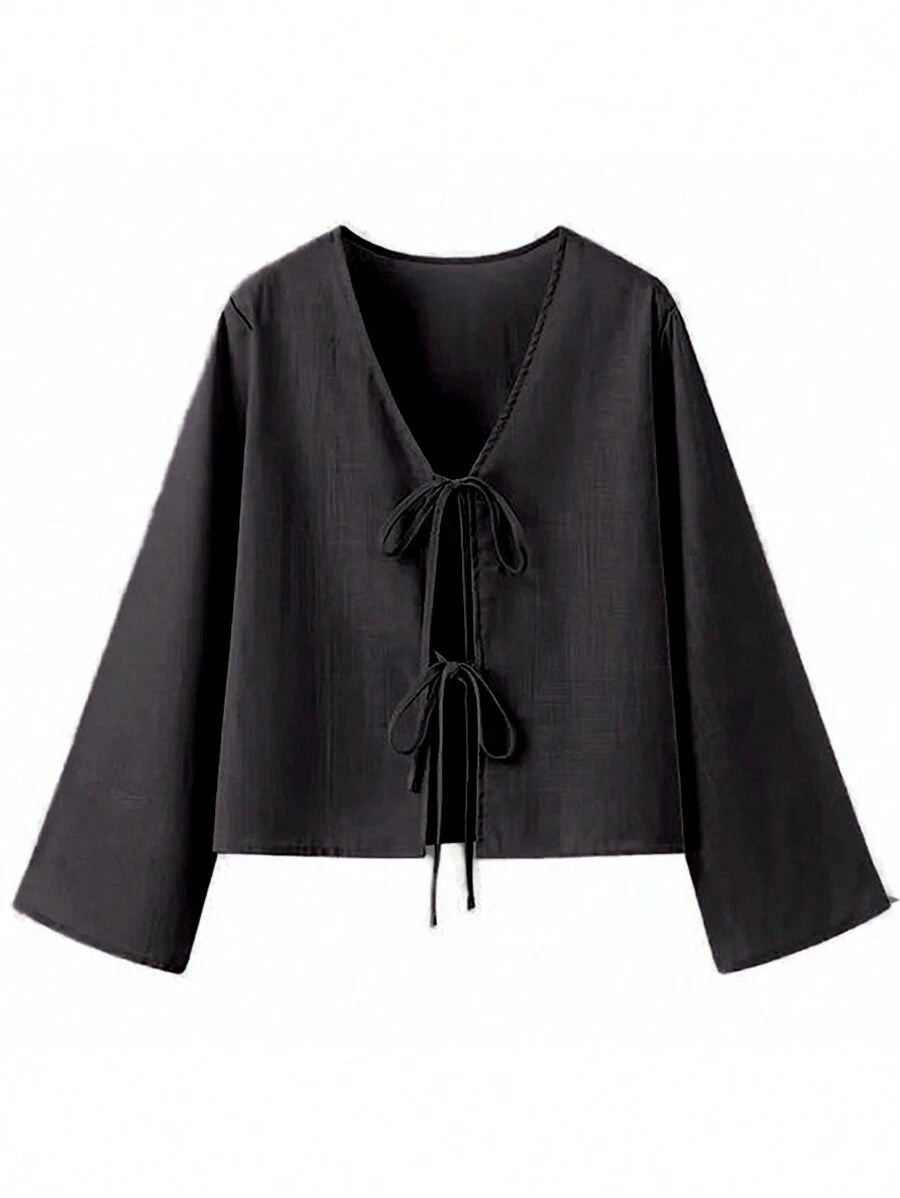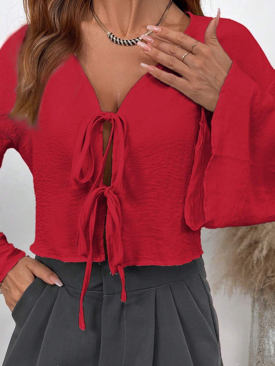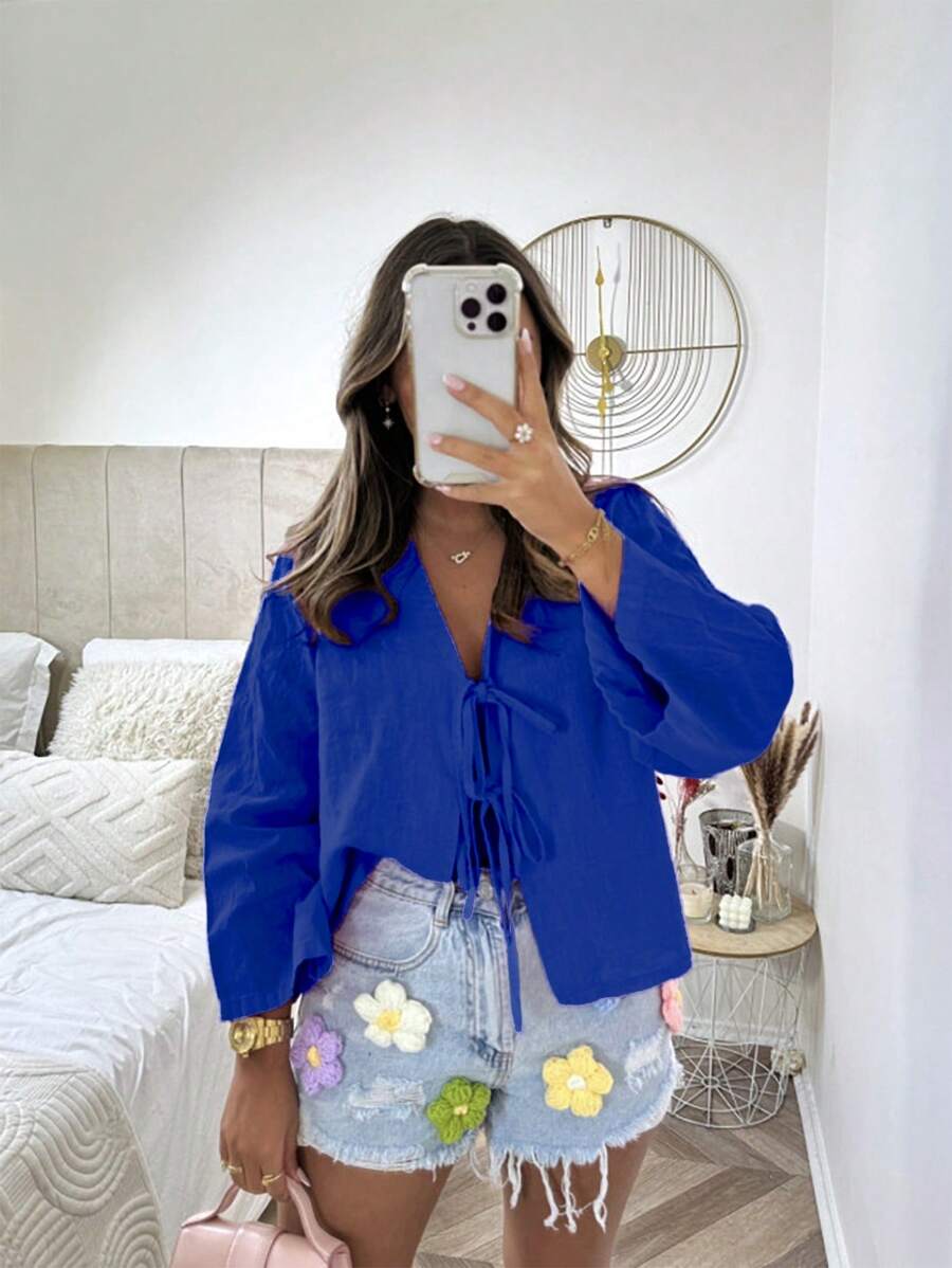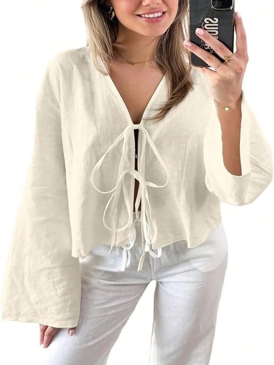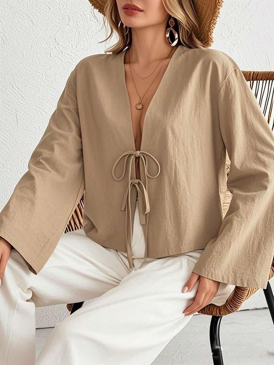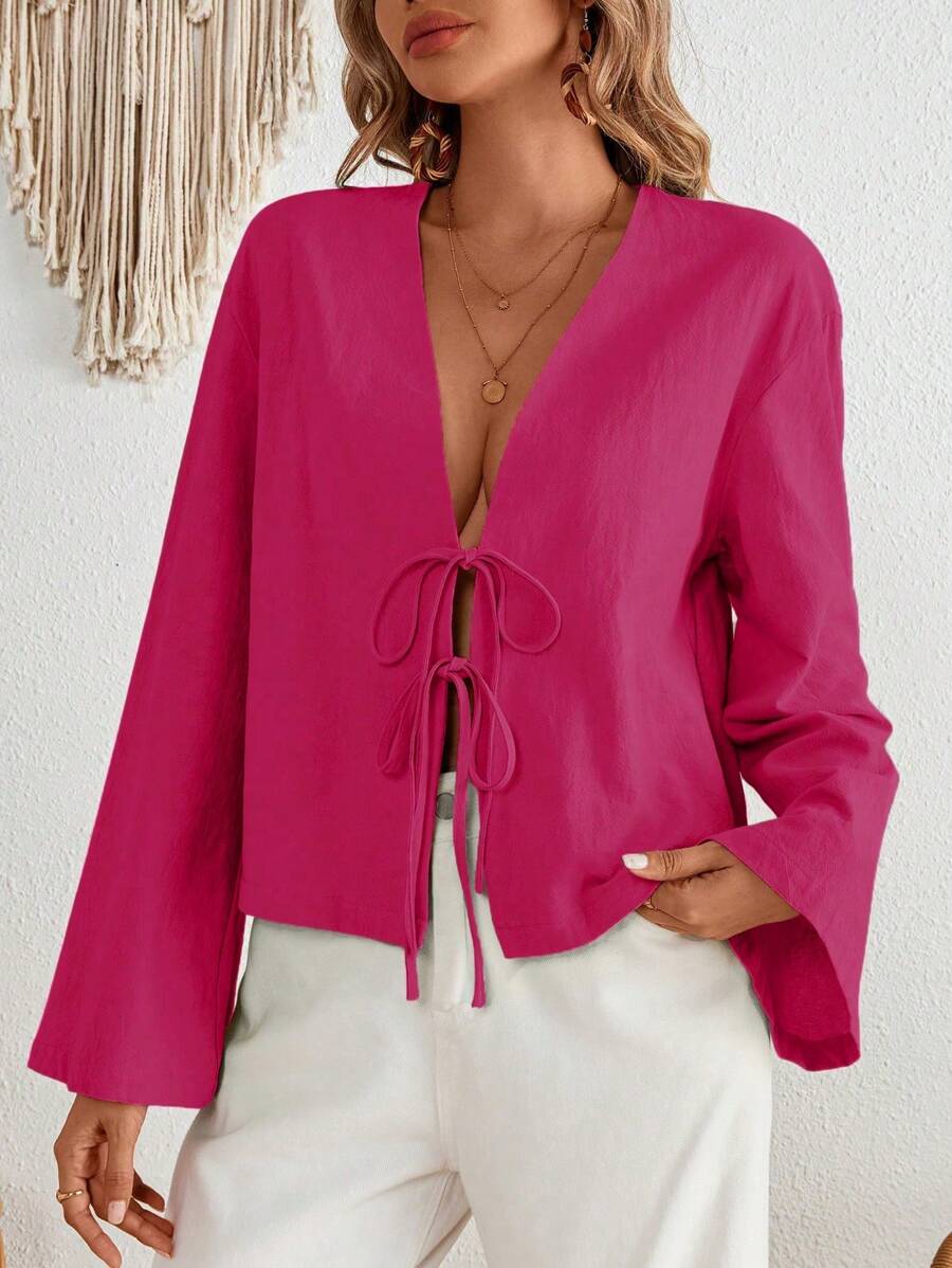 MIU Women's Vacation Casual Solid Color Tie Front Flare Sleeve Blouse Women Shirt