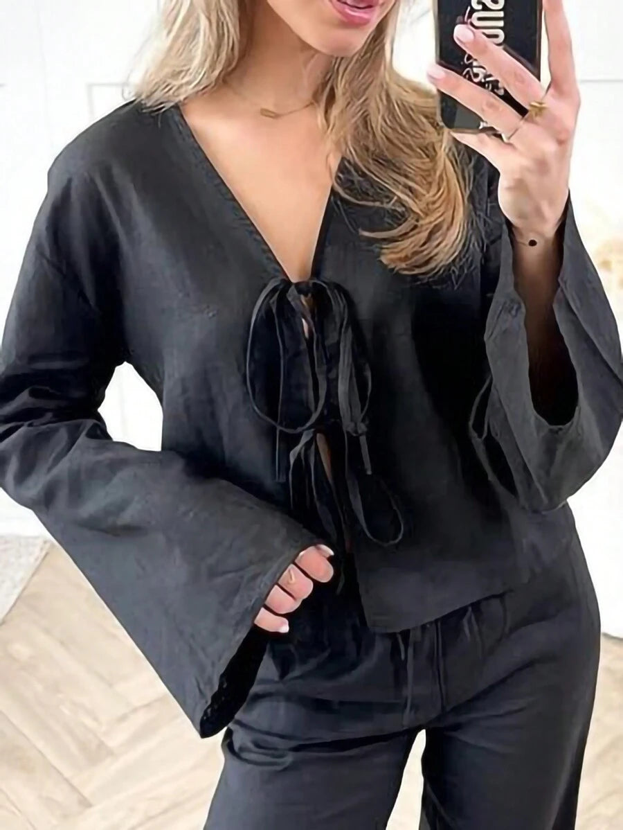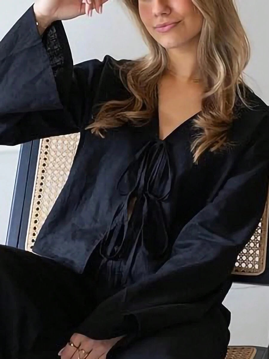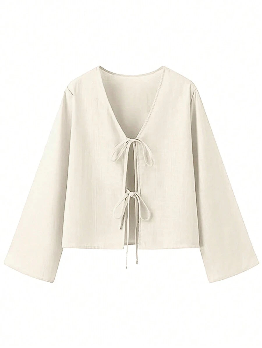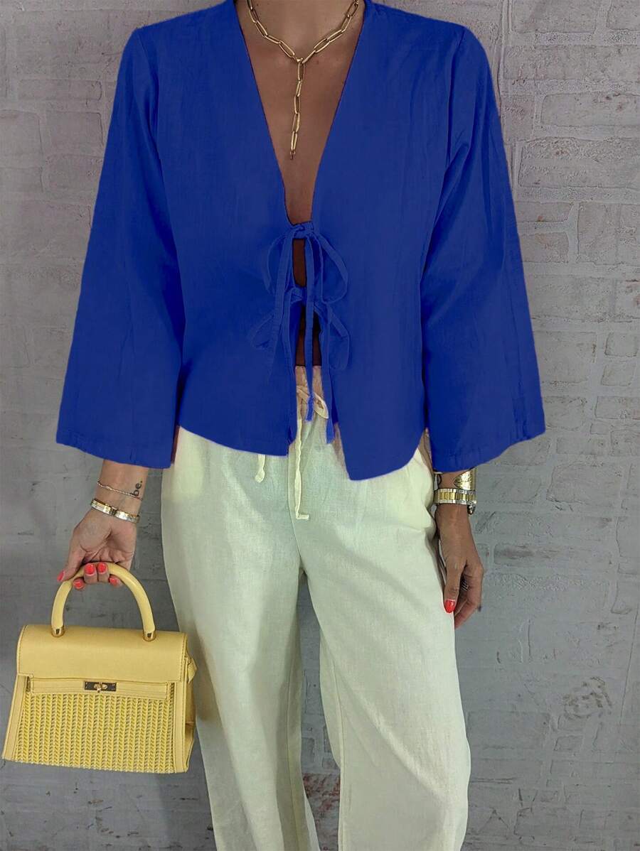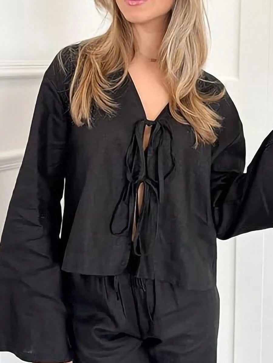 MIU Women's Vacation Casual Solid Color Tie Front Flare Sleeve Blouse Women Shirt