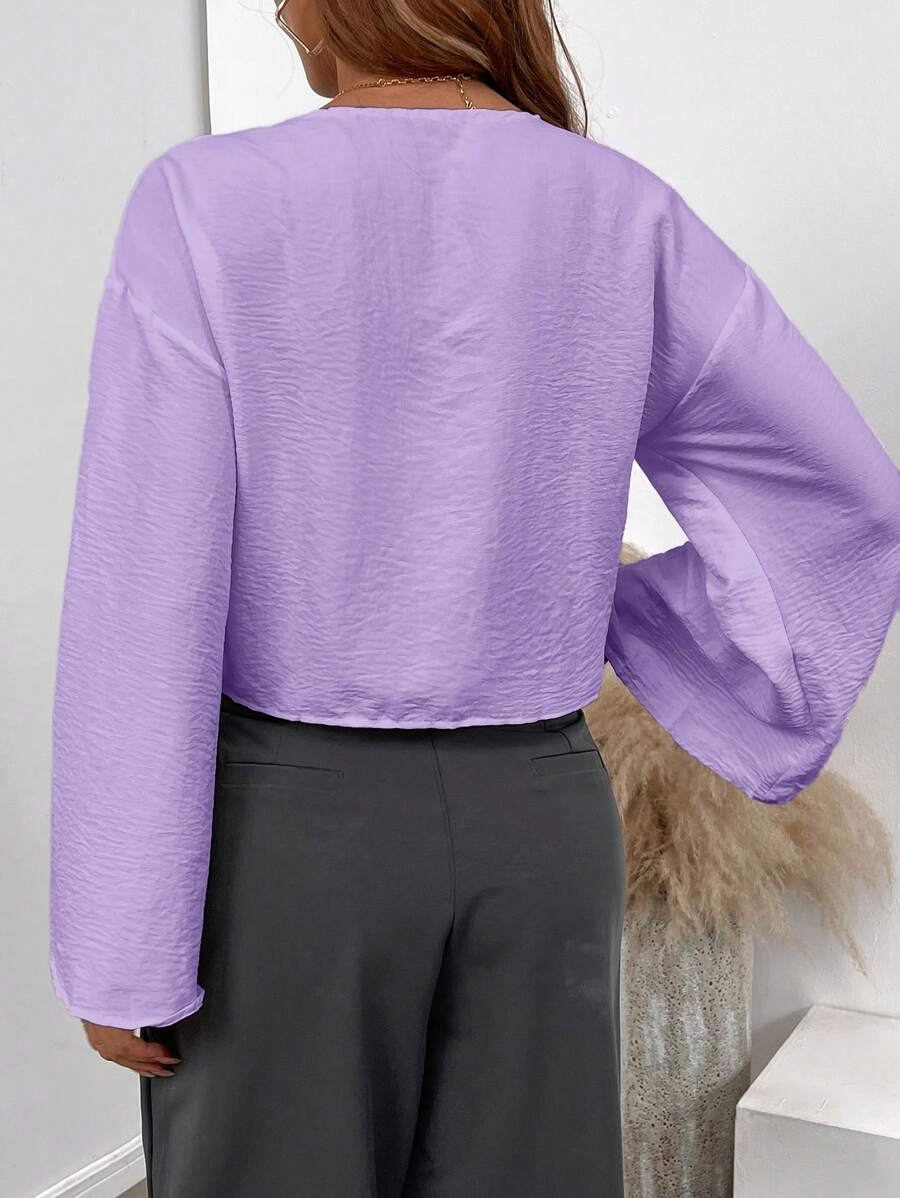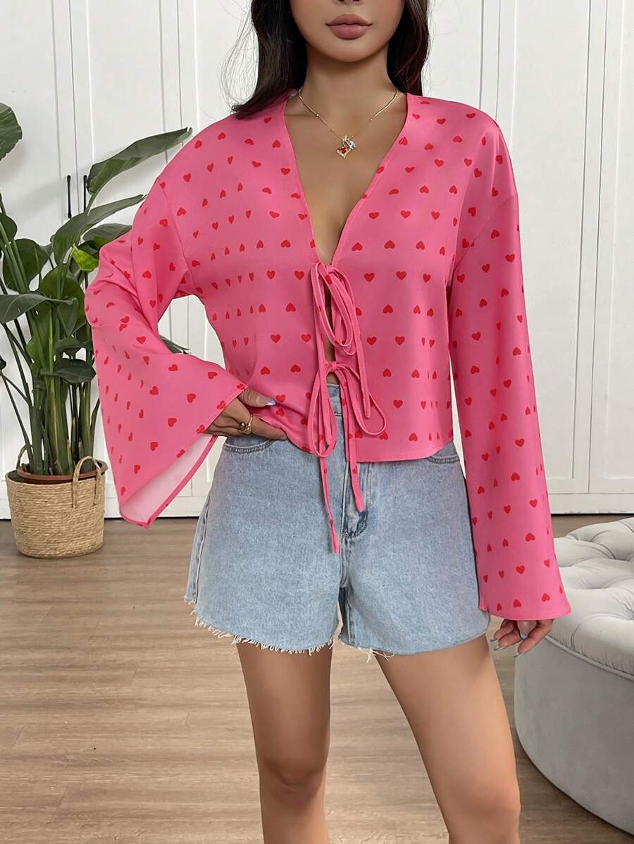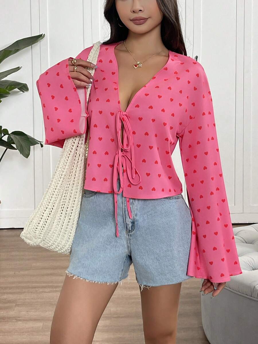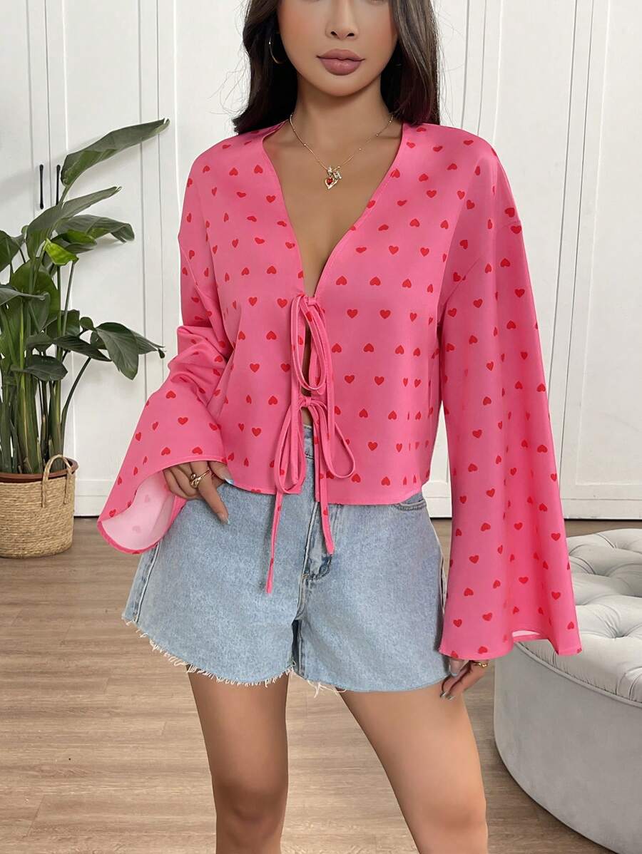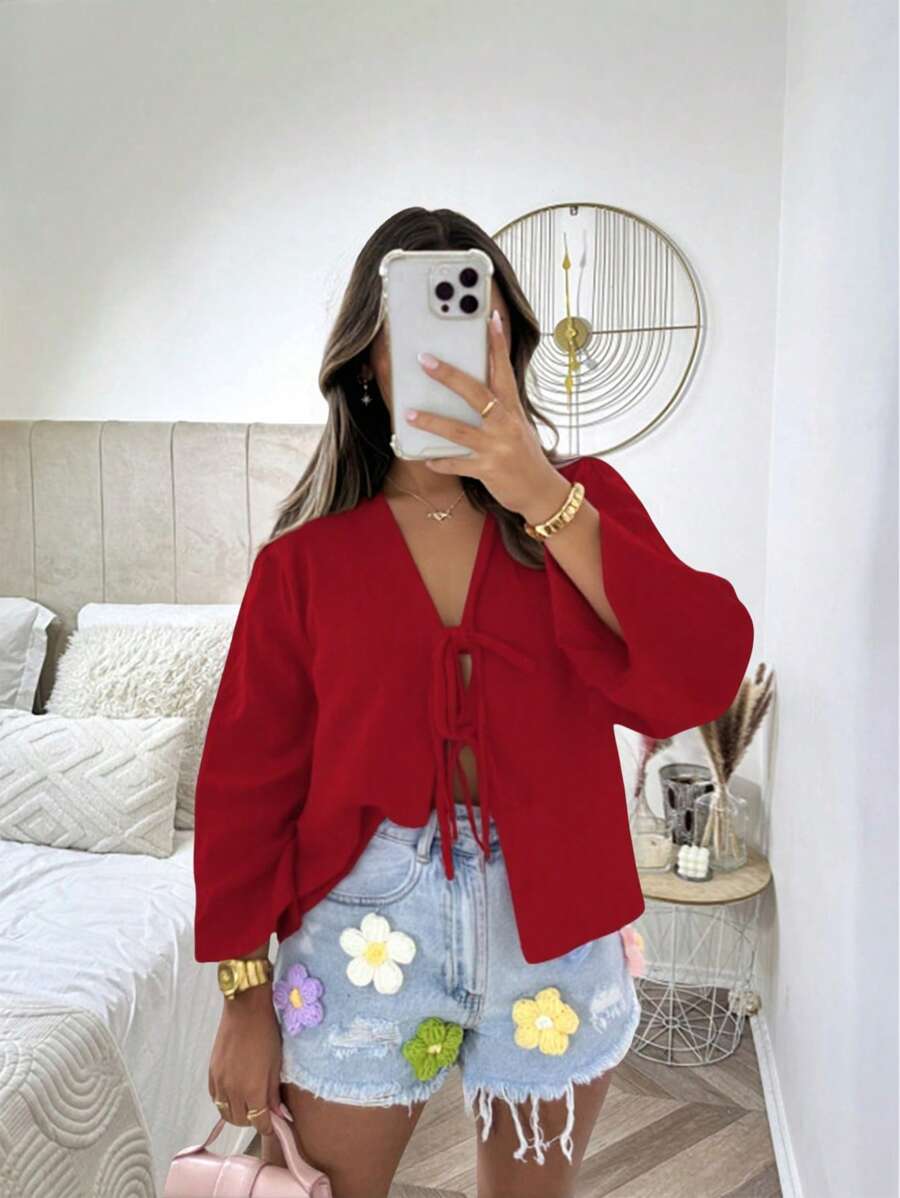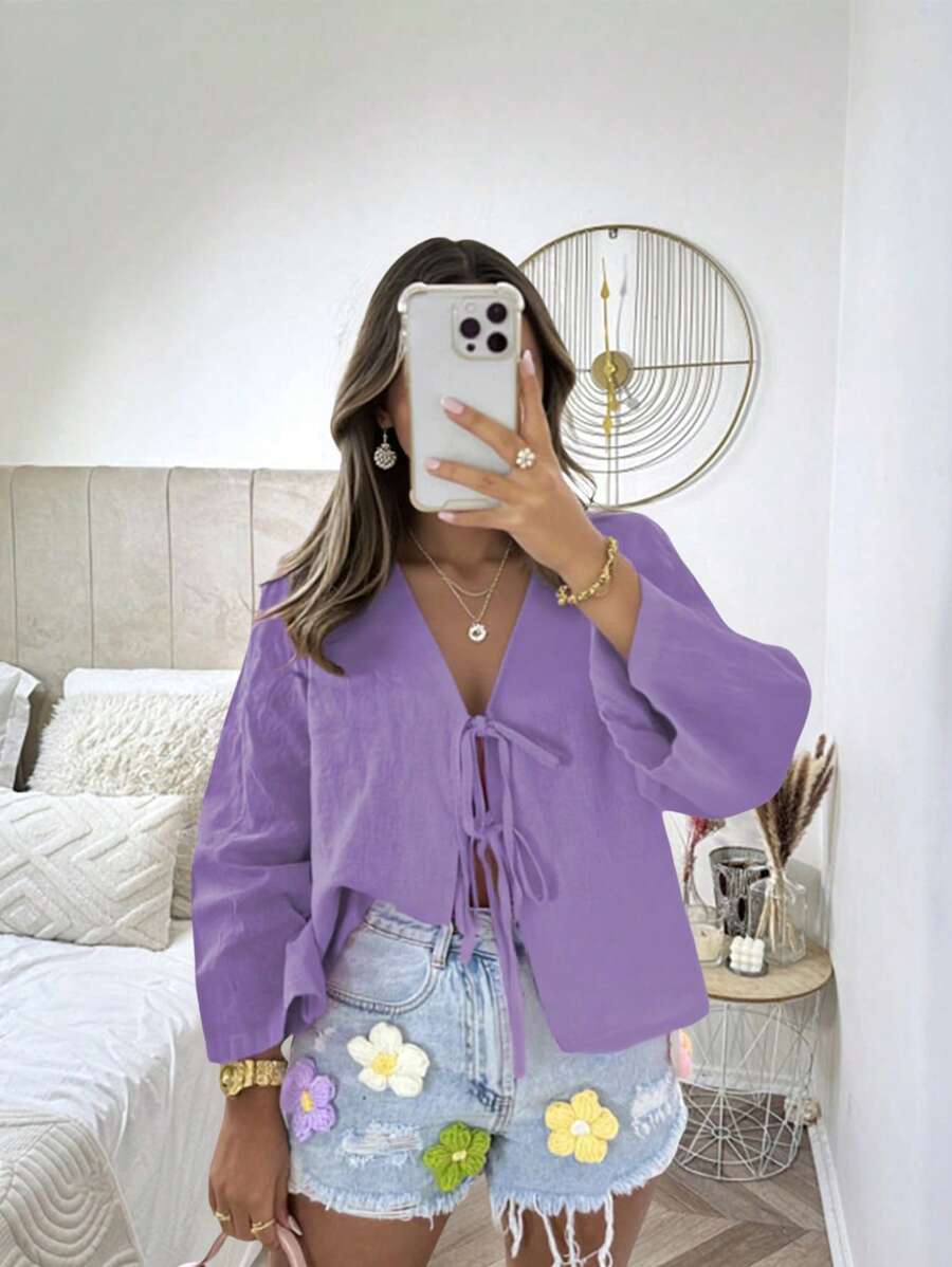 MIU Women's Vacation Casual Solid Color Tie Front Flare Sleeve Blouse Women Shirt