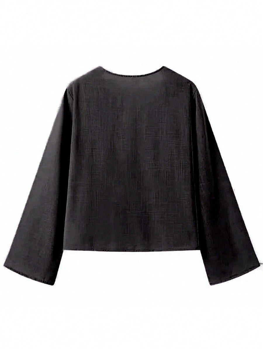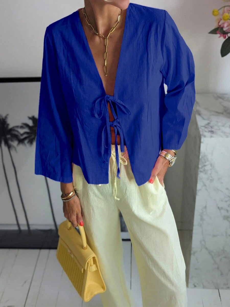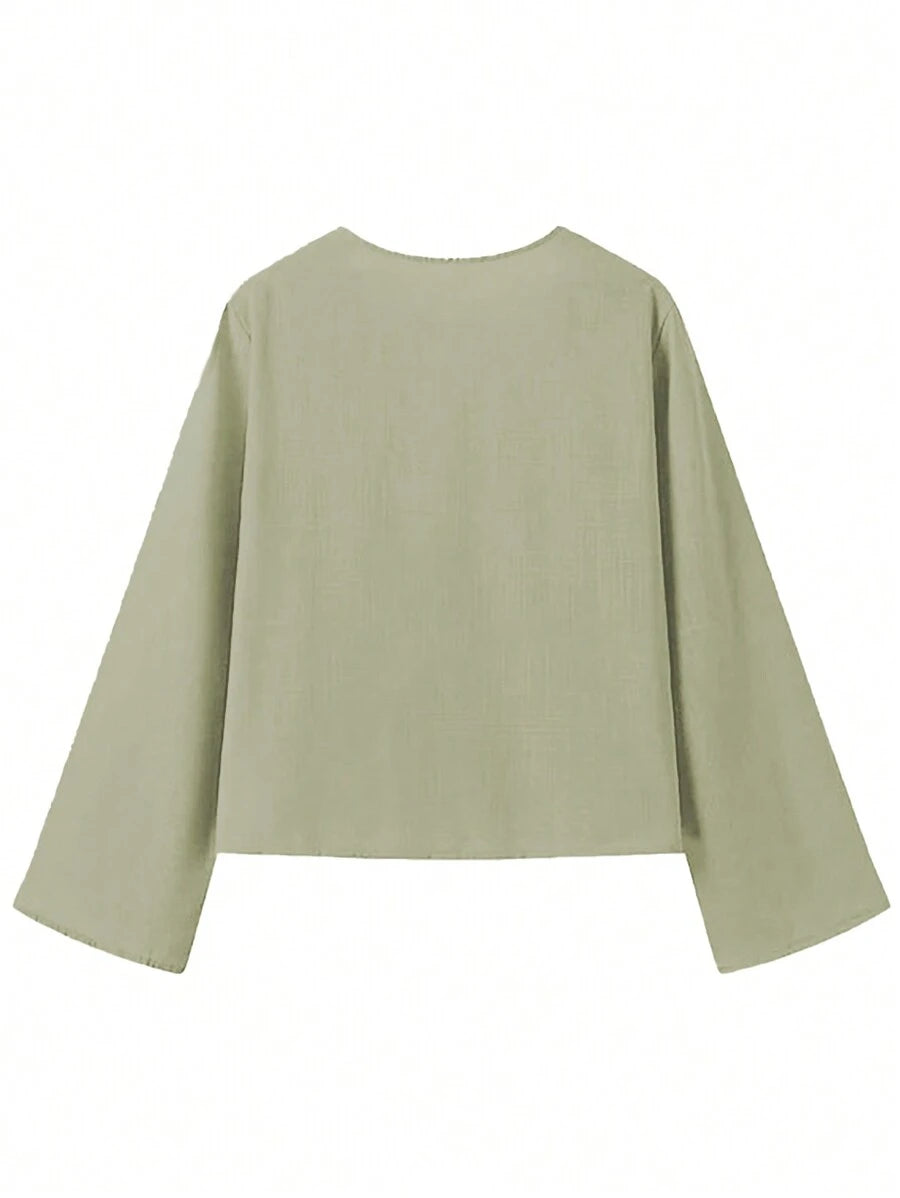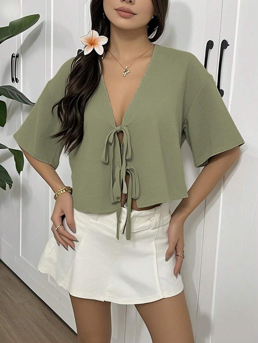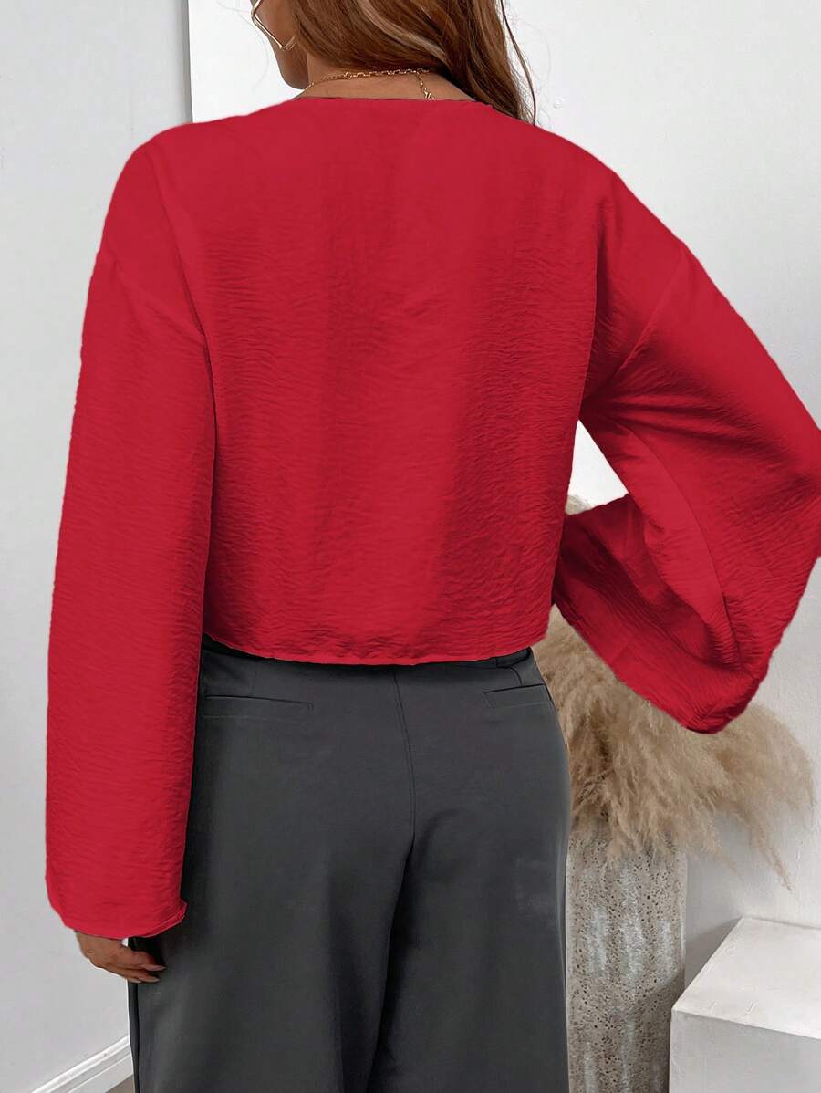 MIU Women's Vacation Casual Solid Color Tie Front Flare Sleeve Blouse Women Shirt