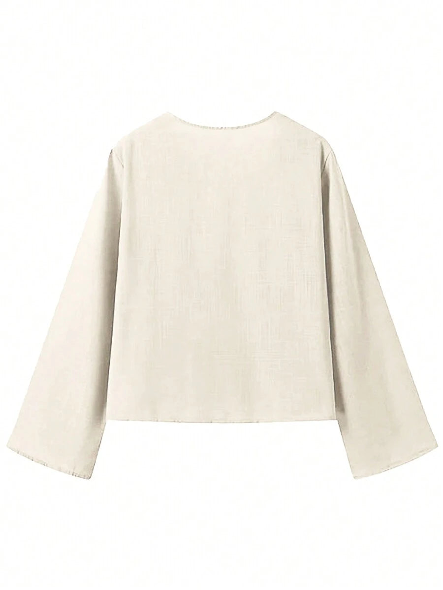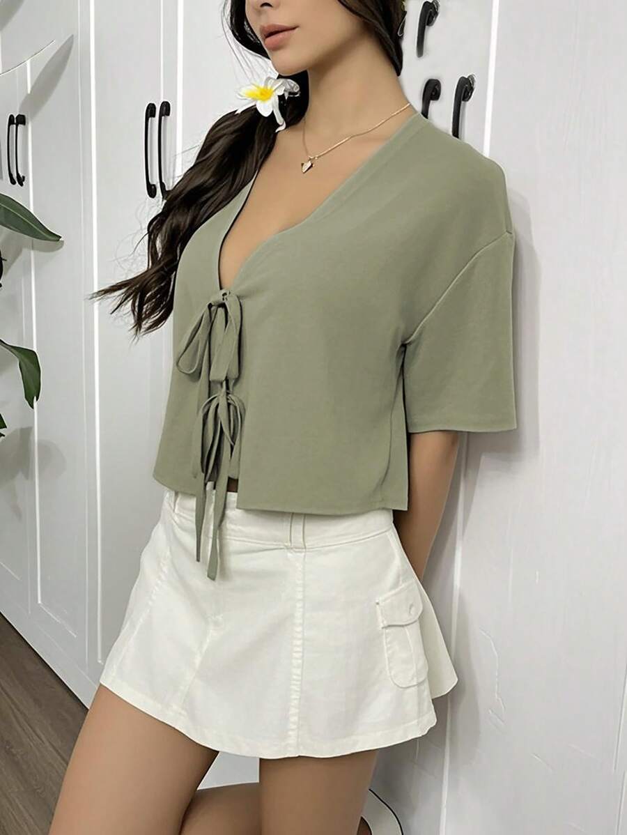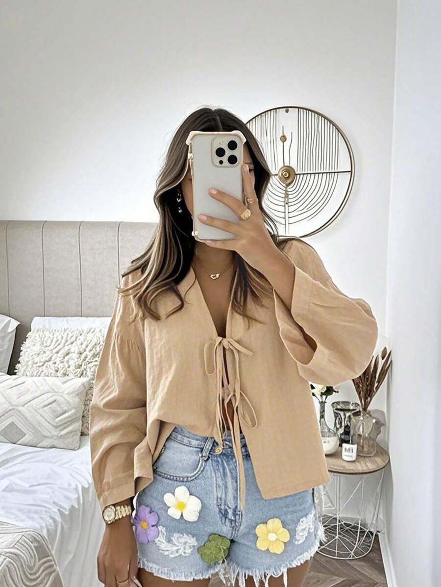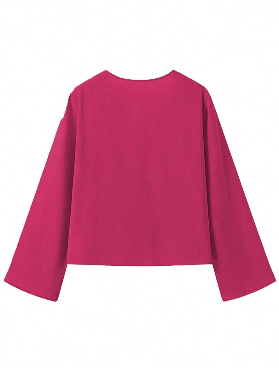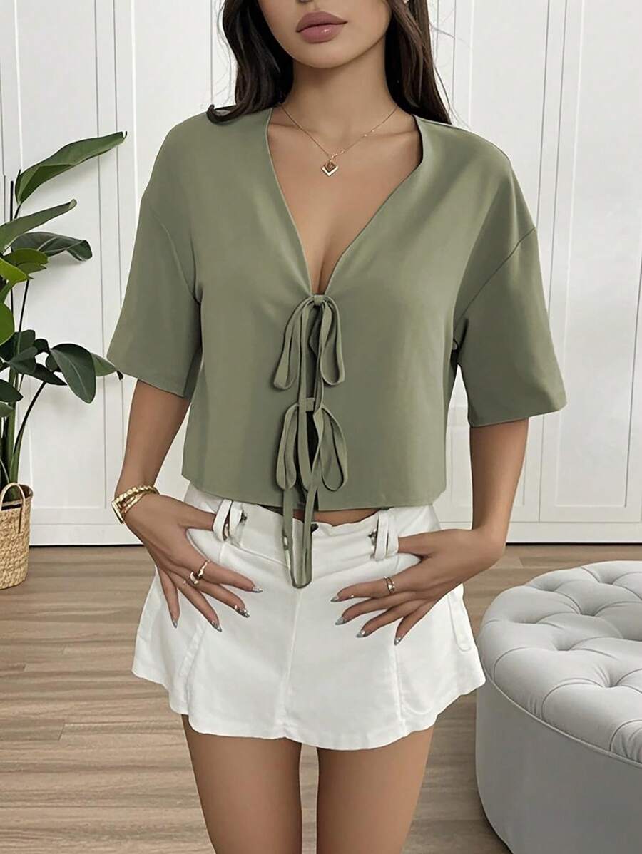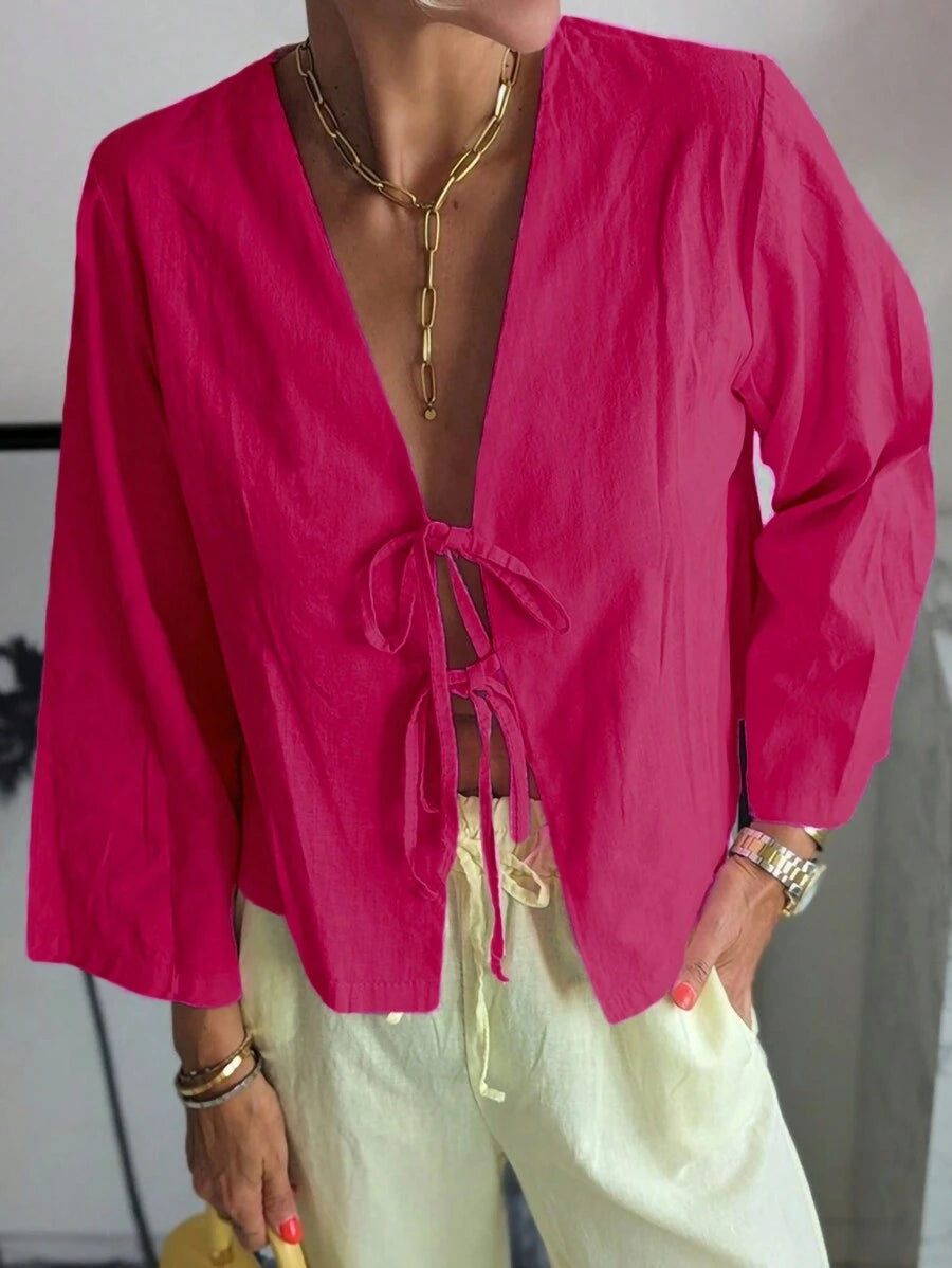 MIU Women's Vacation Casual Solid Color Tie Front Flare Sleeve Blouse Women Shirt