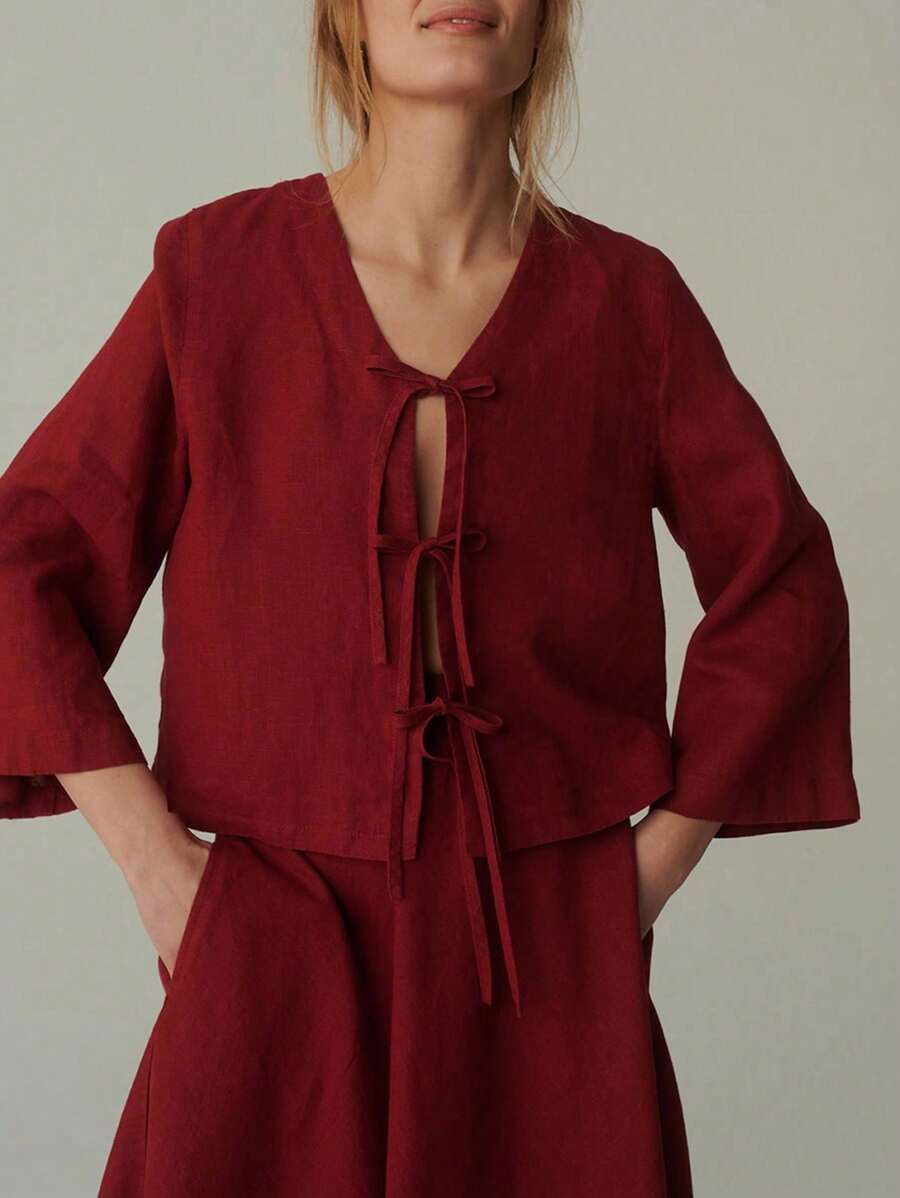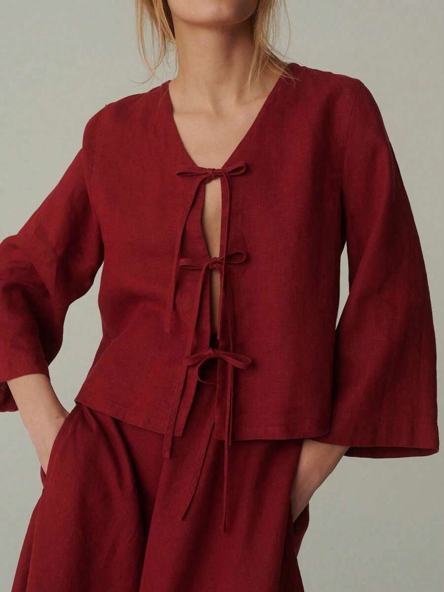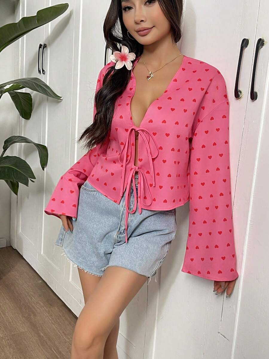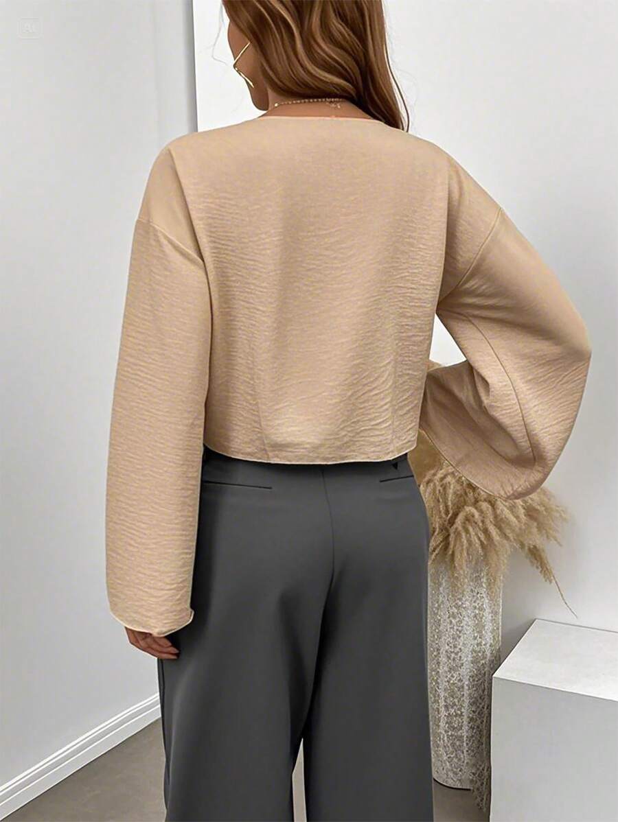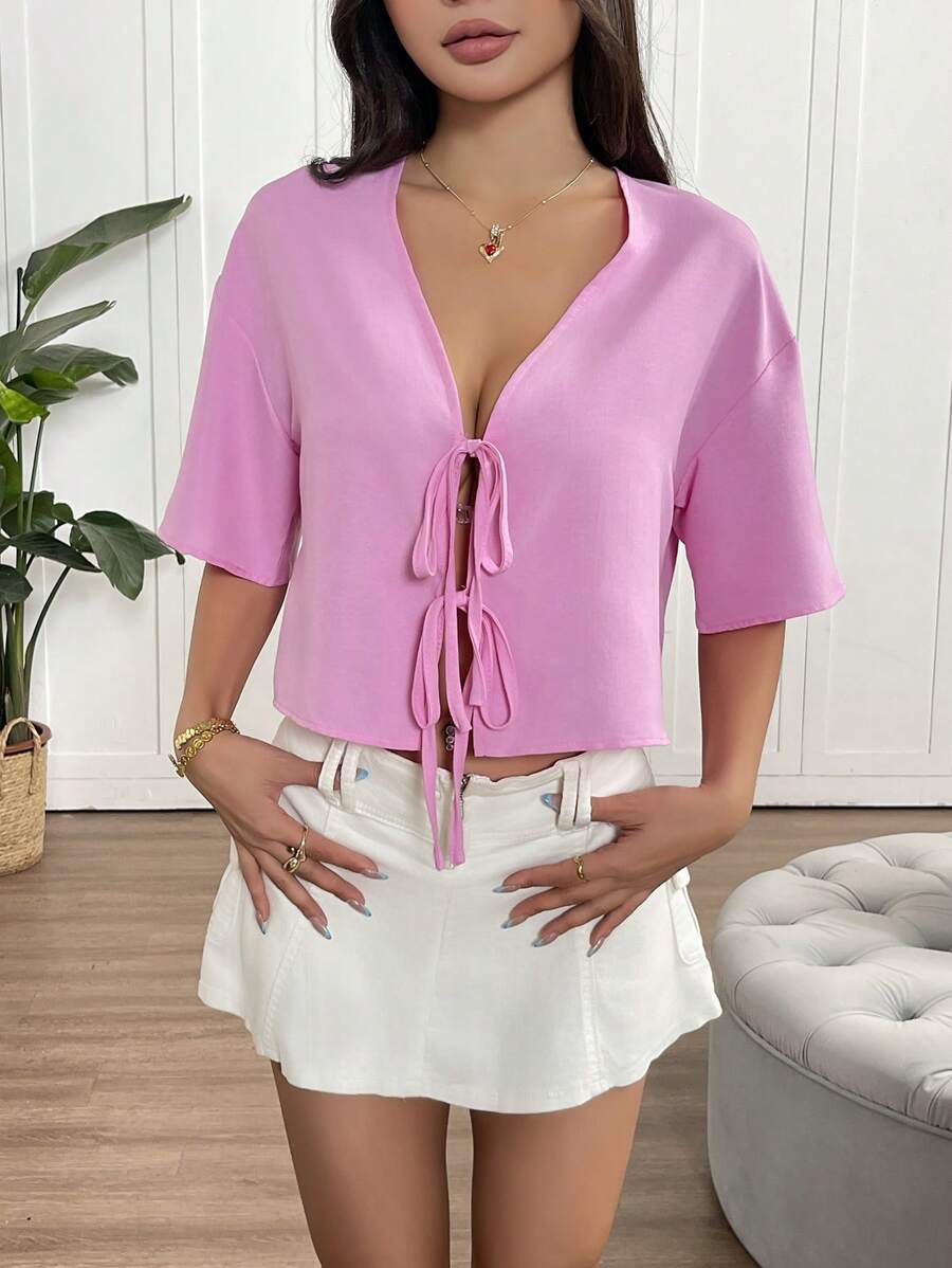 MIU Women's Vacation Casual Solid Color Tie Front Flare Sleeve Blouse Women Shirt