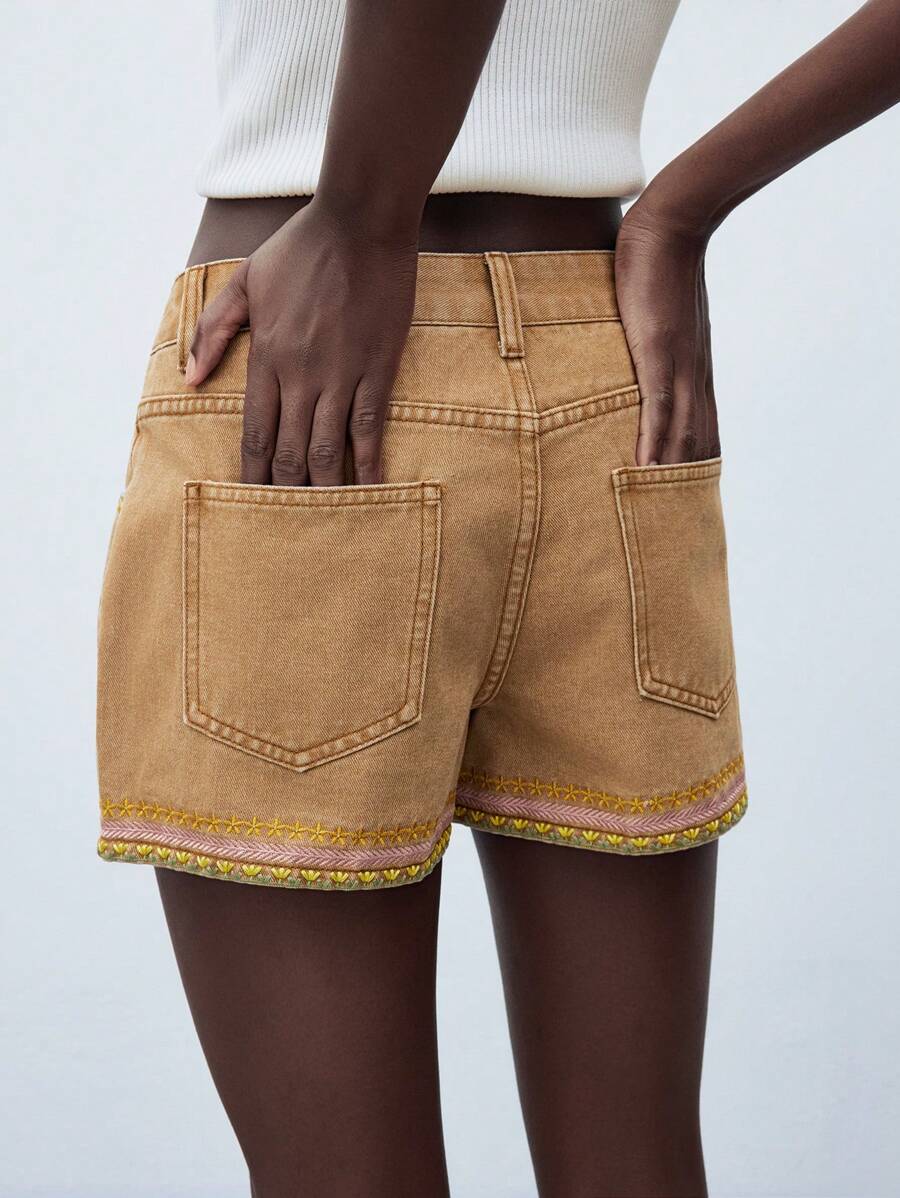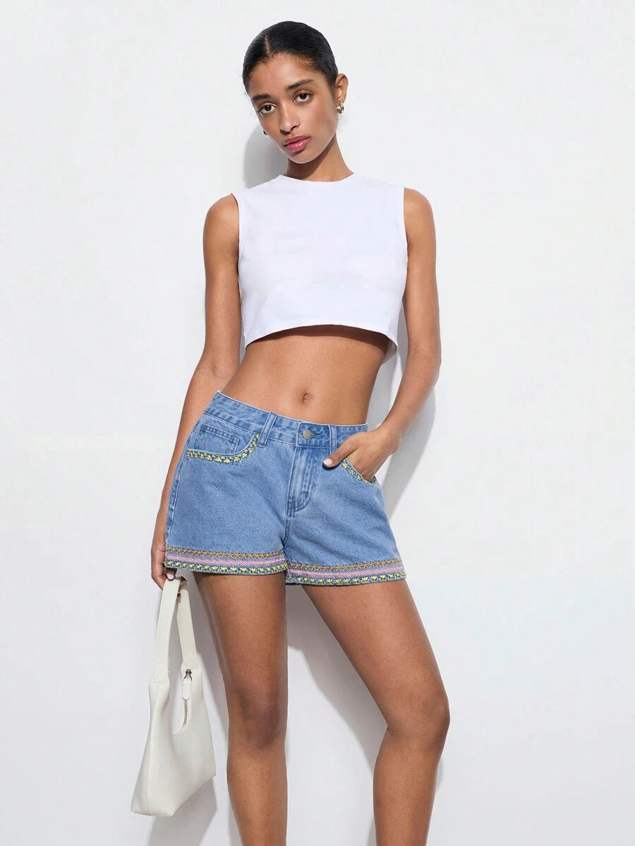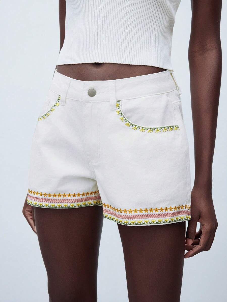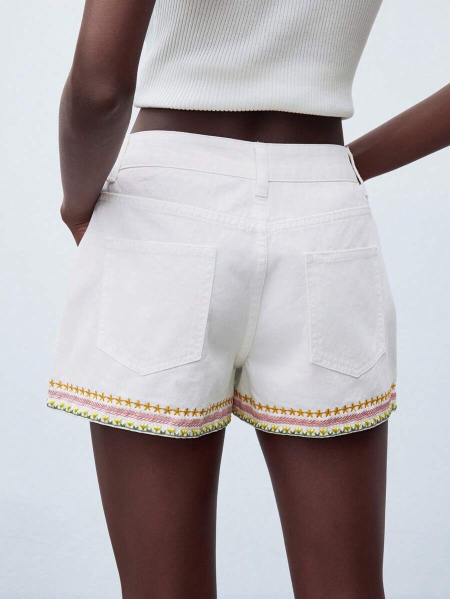 MIU Women's White Denim Shorts Exquisite Embroidery Low Waist Shorts With Pockets Summer Vacation Style Wear