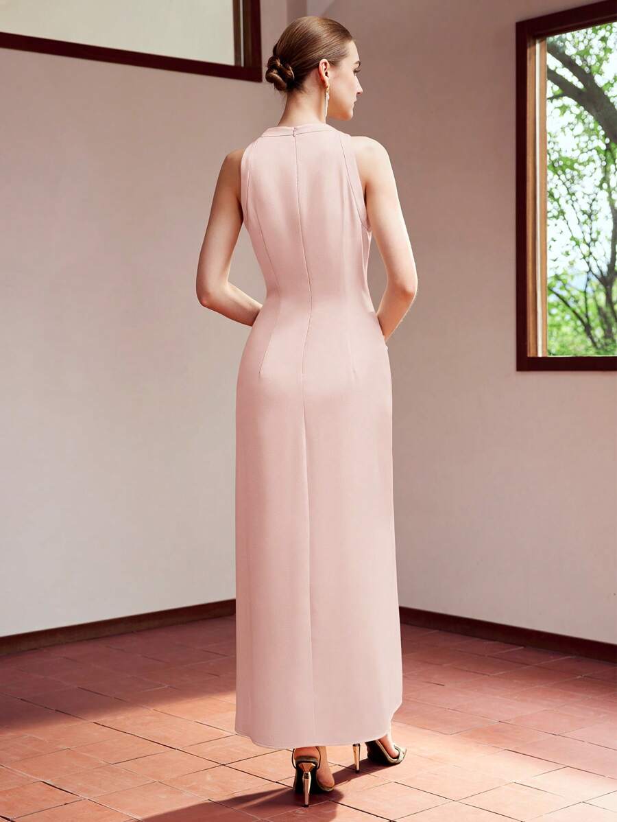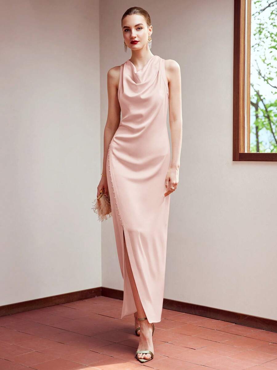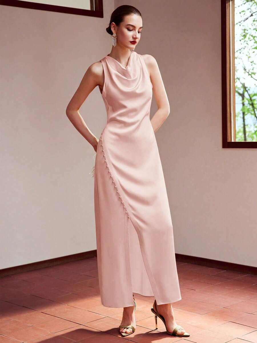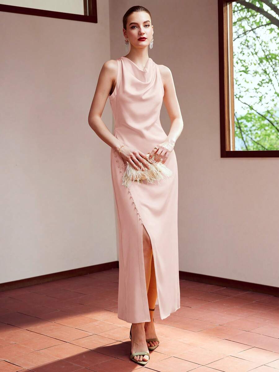 MIU WOVEN WOMEN'S COWL NECK BUTTON SPLIT HEM DRESS,HOLIDAY PARTY BIRTHDAY FORMAL EVENING OCCASSION