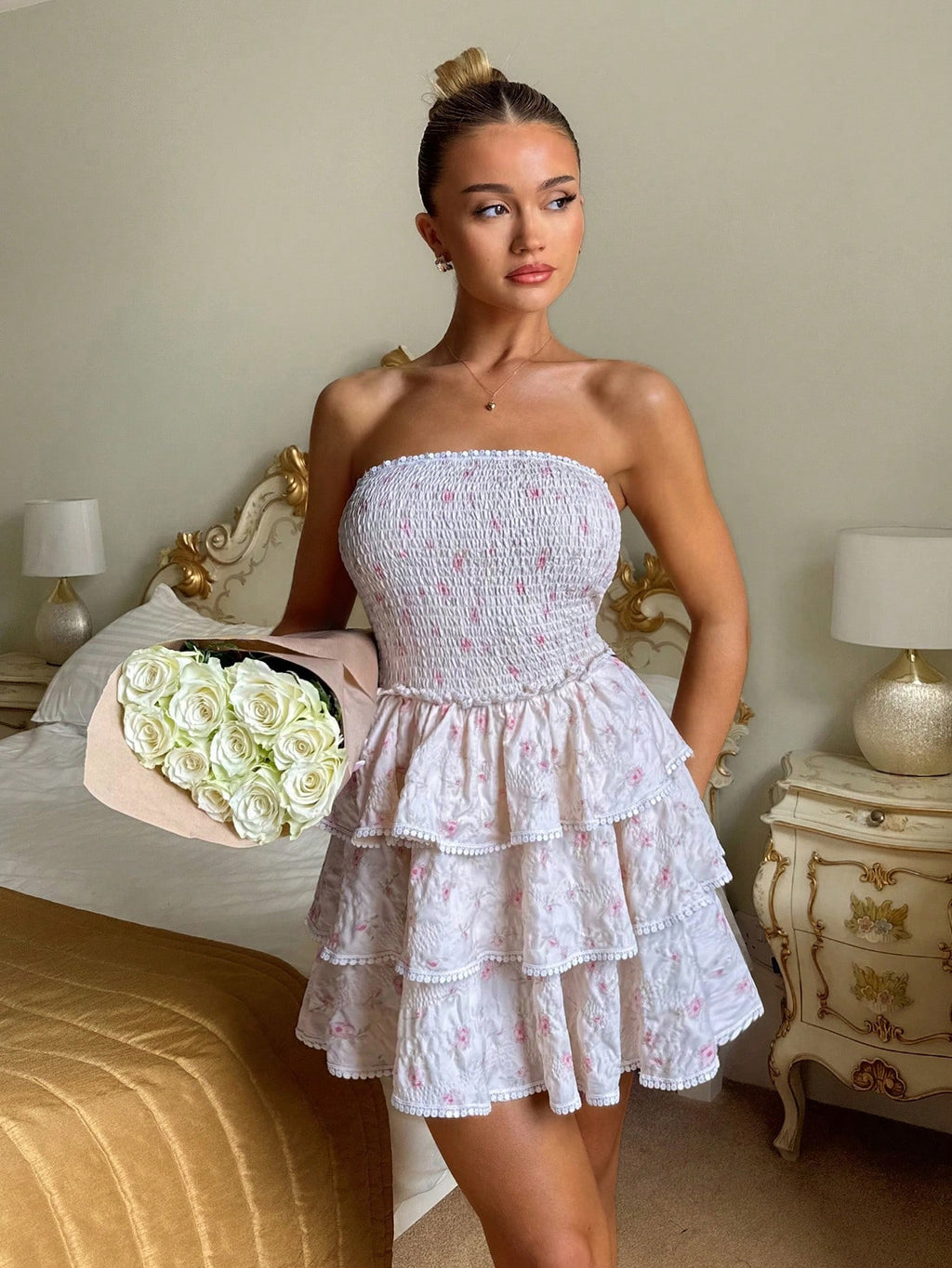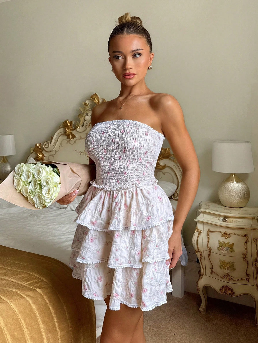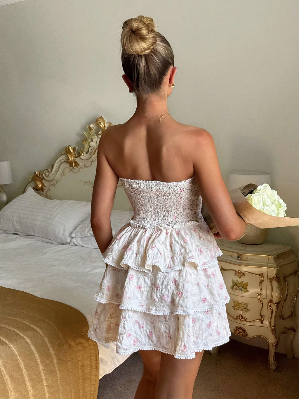 MIU ženska haljina bez naramenica s cvjetnim printom i volanima — idealna za ljetni odmor, plažu, mini haljina za ljeto, modni izbor za čajanke i odmor u resortu. Lagana i lepršava, savršena za tople dane i ljetne izlaske.