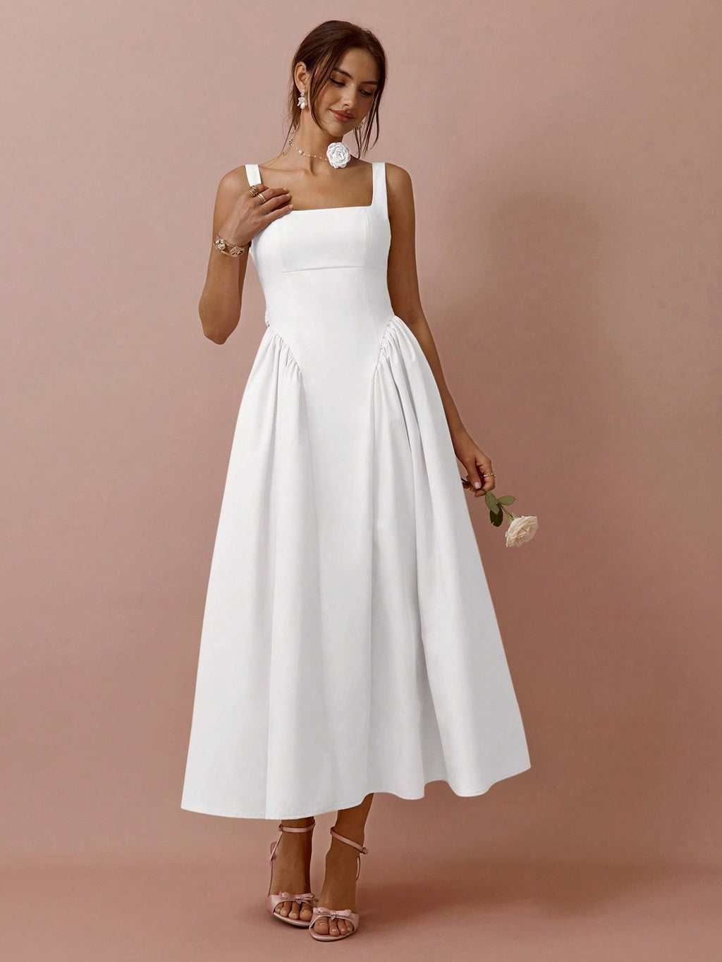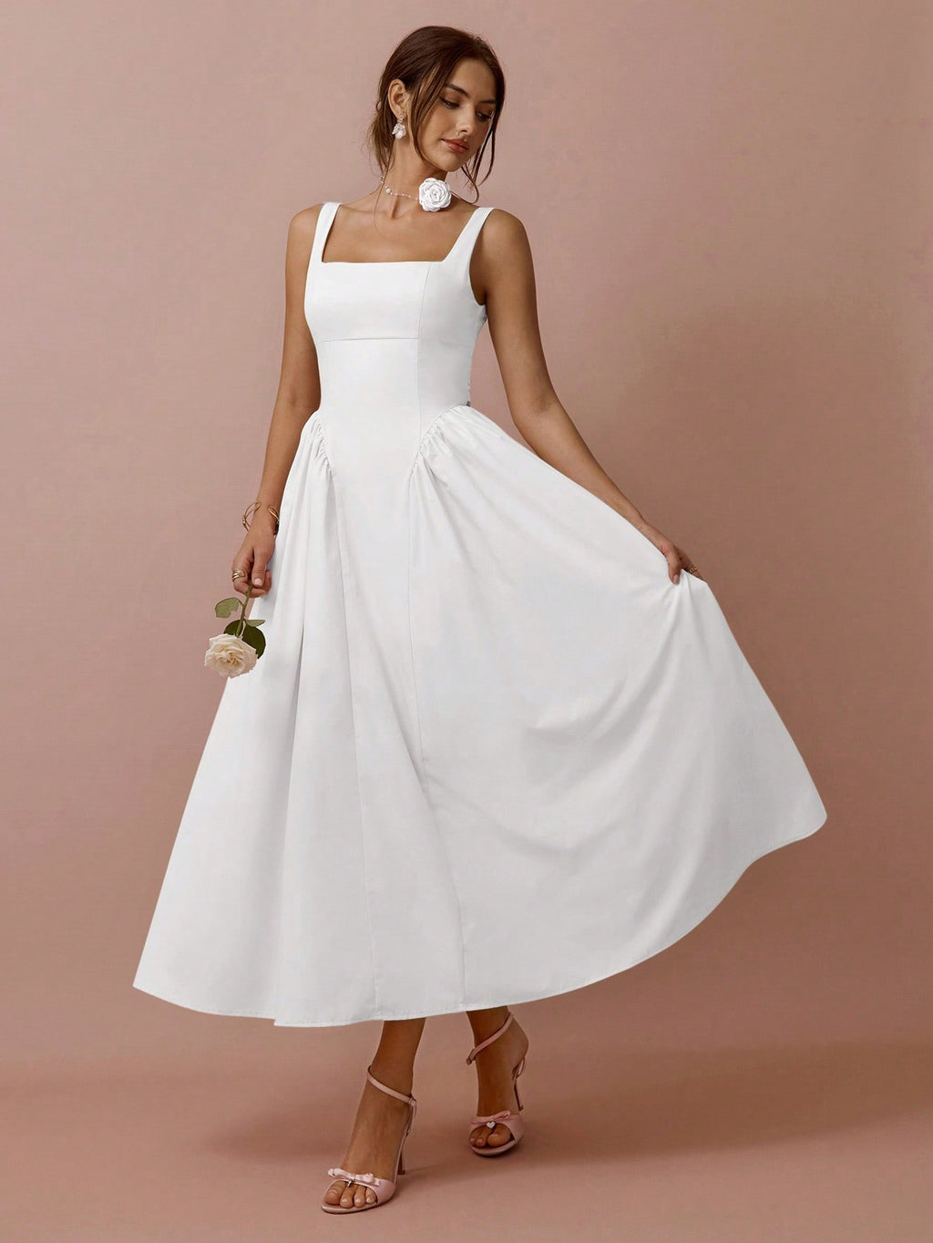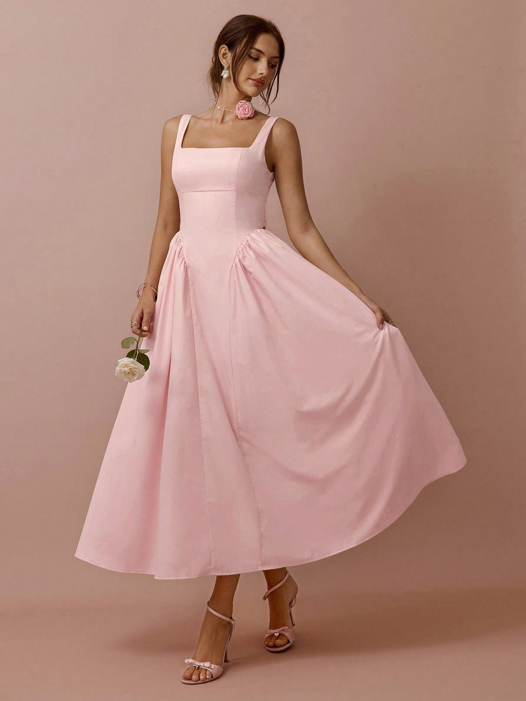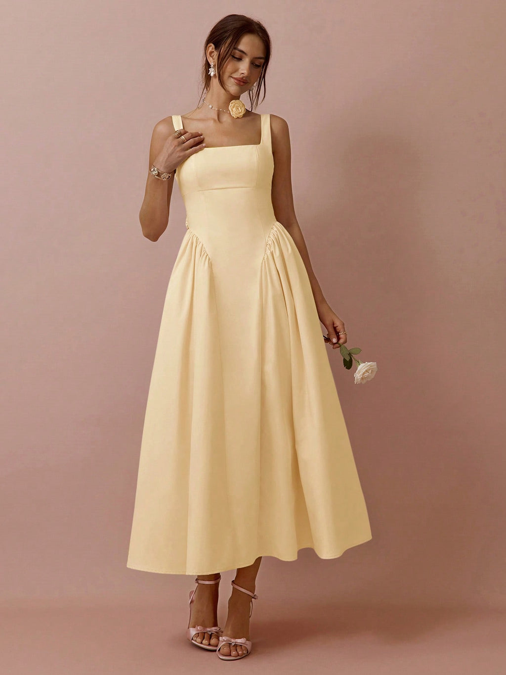 MiuVogue 1pc Women Square Neck Pleated Sleeveless Elegant Dress Butter Yellow Dress