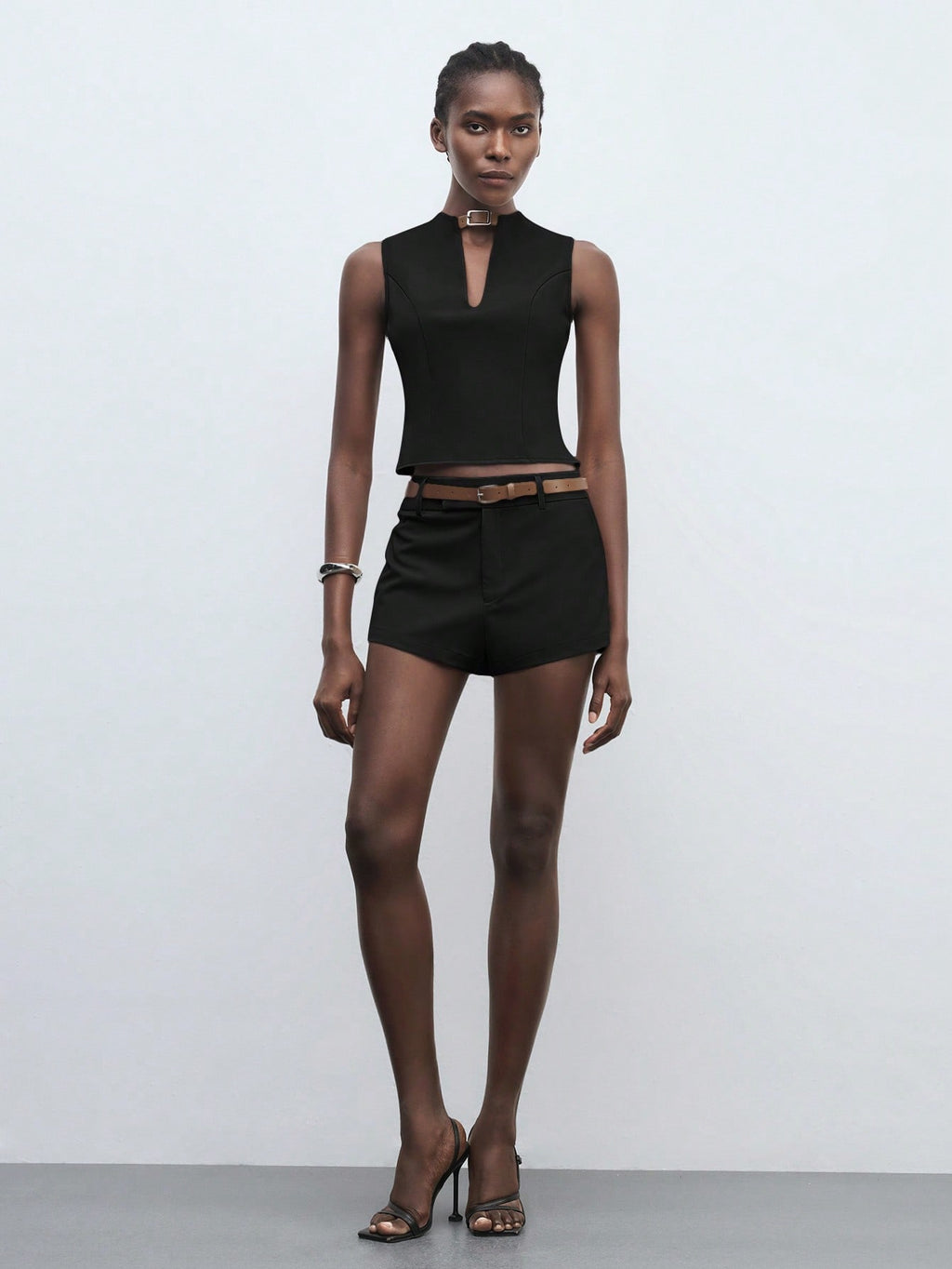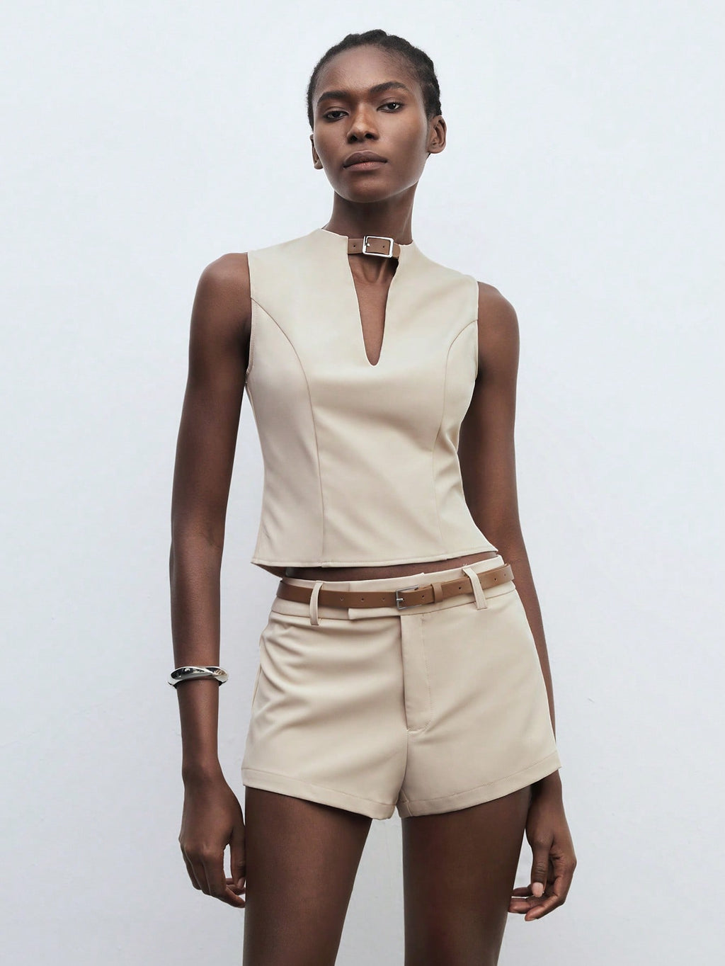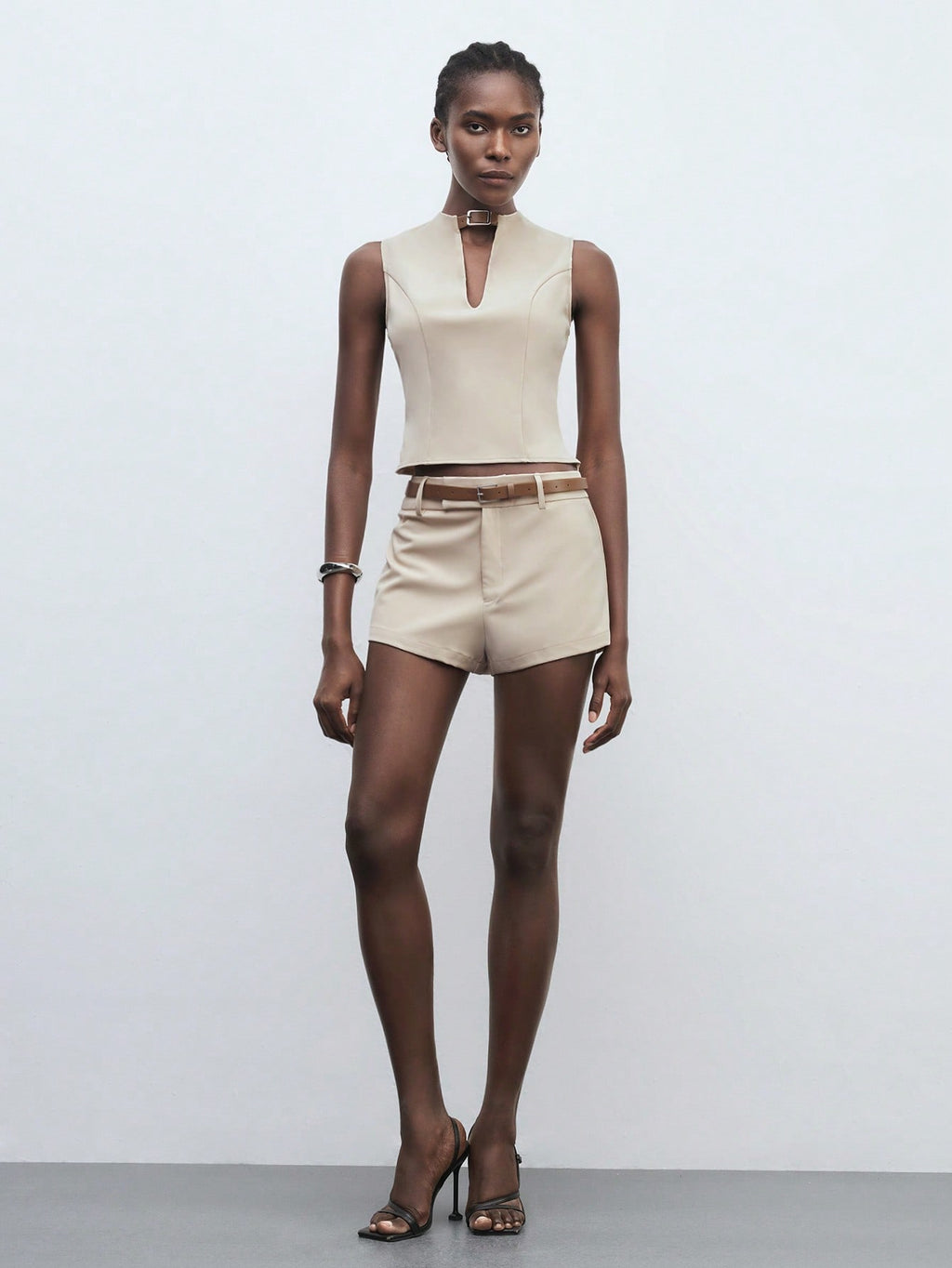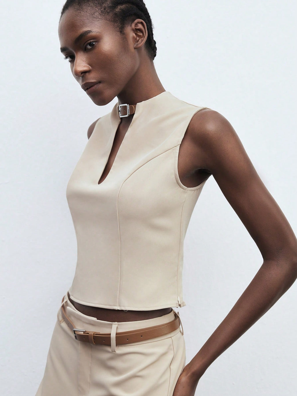 MiuVogue Apricot Round Neck Sleeveless Hollow Metallic Decor Fitted Cropped Women Tank Top, Versatile Fashion Minimalist Modern Urban Style Spring/Summer Easter Business Casual Woman Airport Outfit For Women
