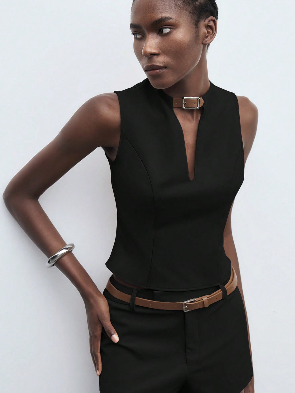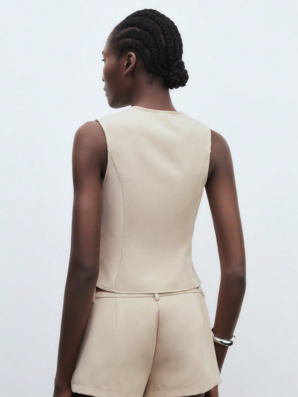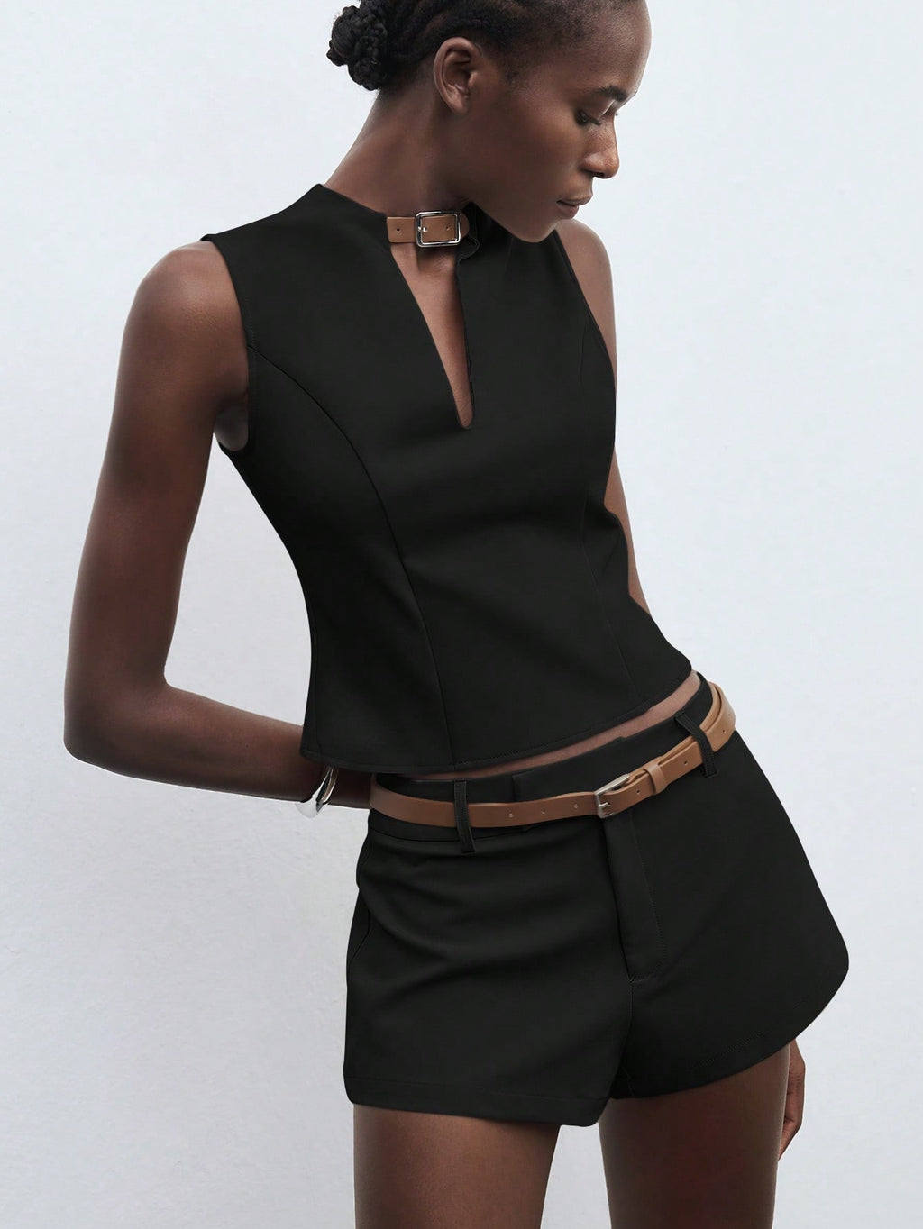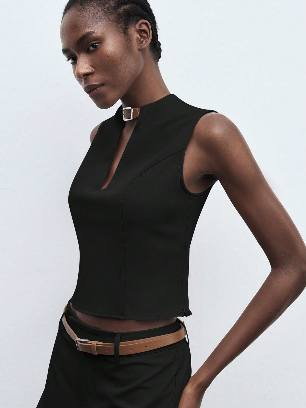MiuVogue Apricot Round Neck Sleeveless Hollow Metallic Decor Fitted Cropped Women Tank Top, Versatile Fashion Minimalist Modern Urban Style Spring/Summer Easter Business Casual Woman Airport Outfit For Women