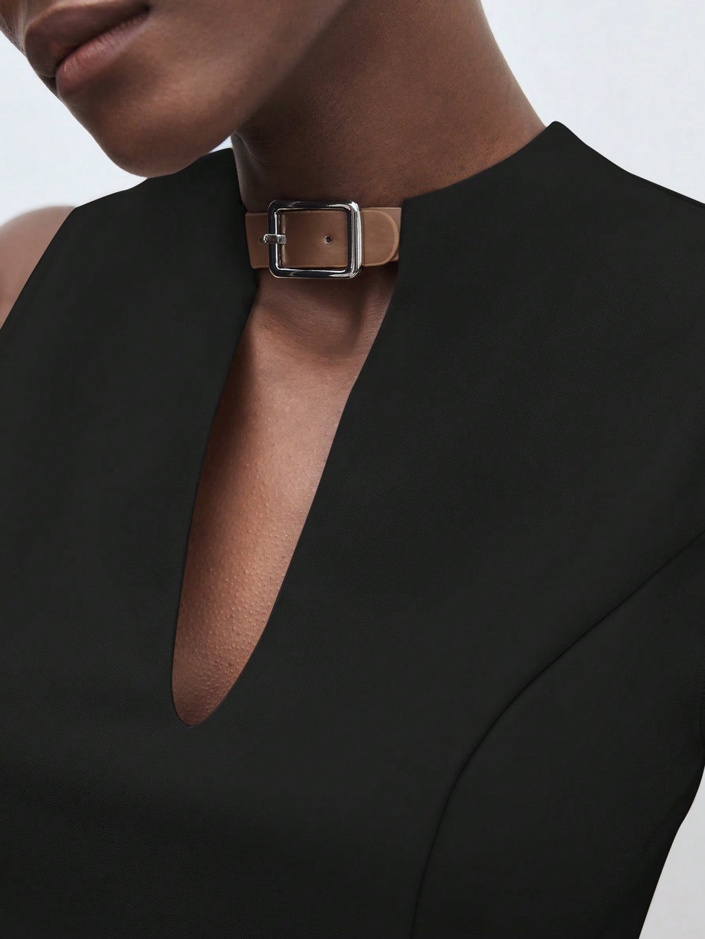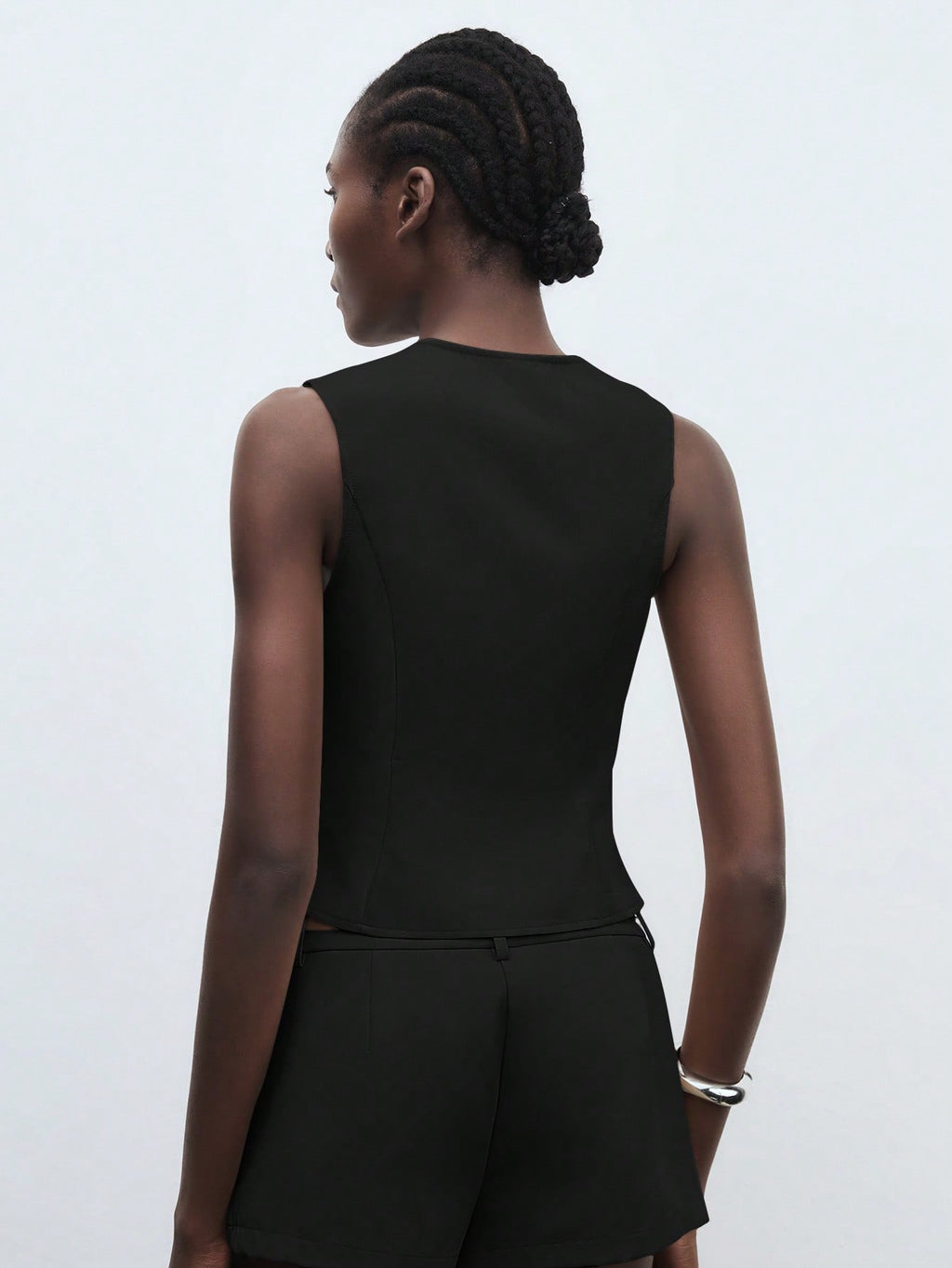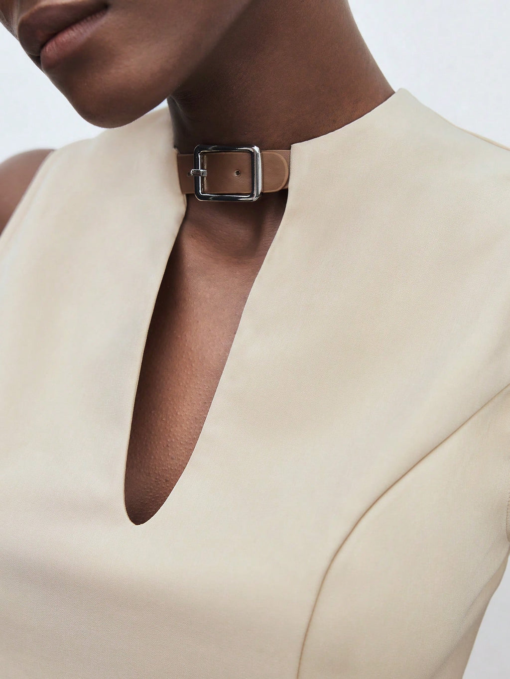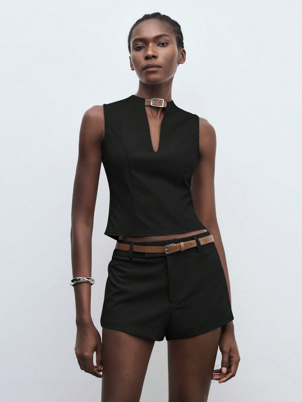 MiuVogue Apricot Round Neck Sleeveless Hollow Metallic Decor Fitted Cropped Women Tank Top, Versatile Fashion Minimalist Modern Urban Style Spring/Summer Easter Business Casual Woman Airport Outfit For Women