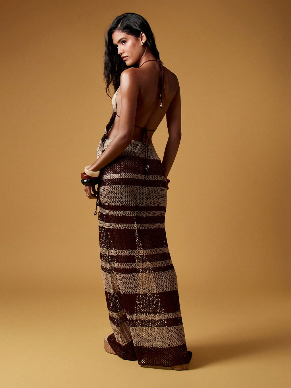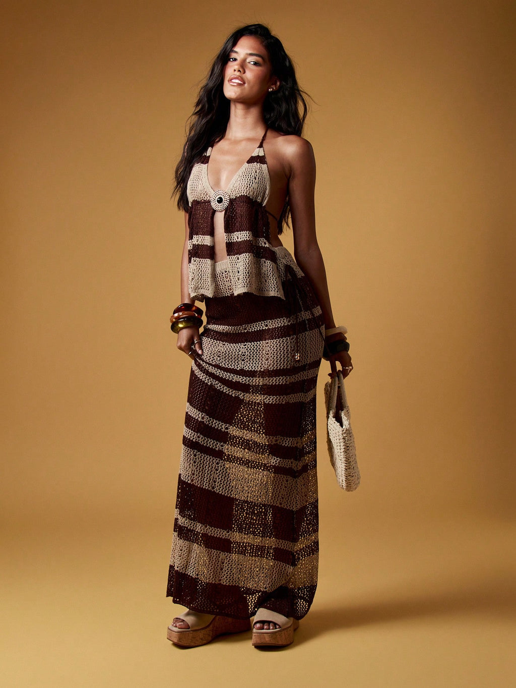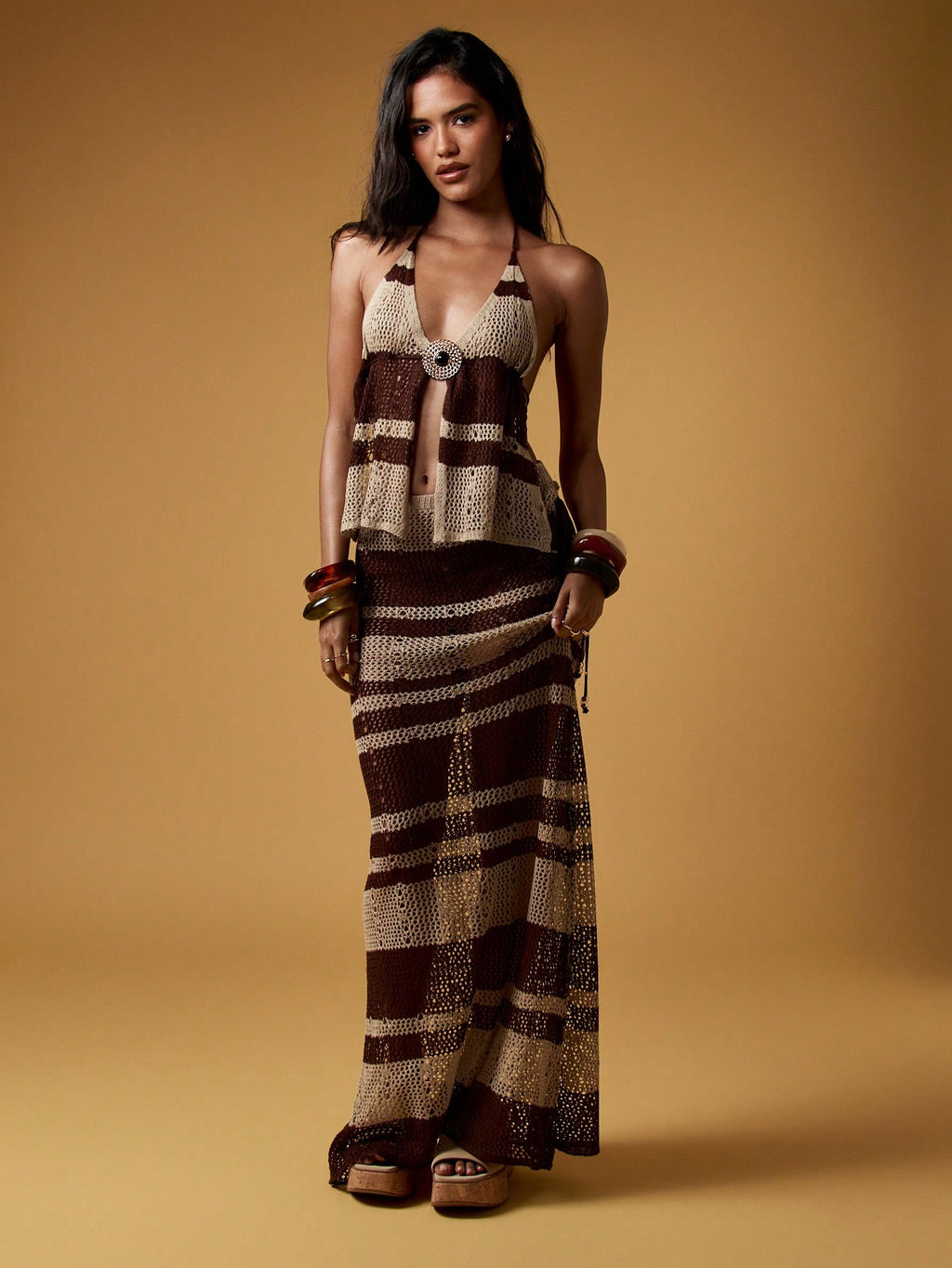 MiuVogue Boho Beach Cover Up Crochet Halter Top With Maxi Skirt Resort Wear Pool Side Swimming Cover Up Summer Holiday Beach Outfit