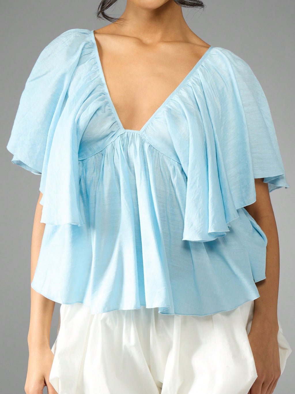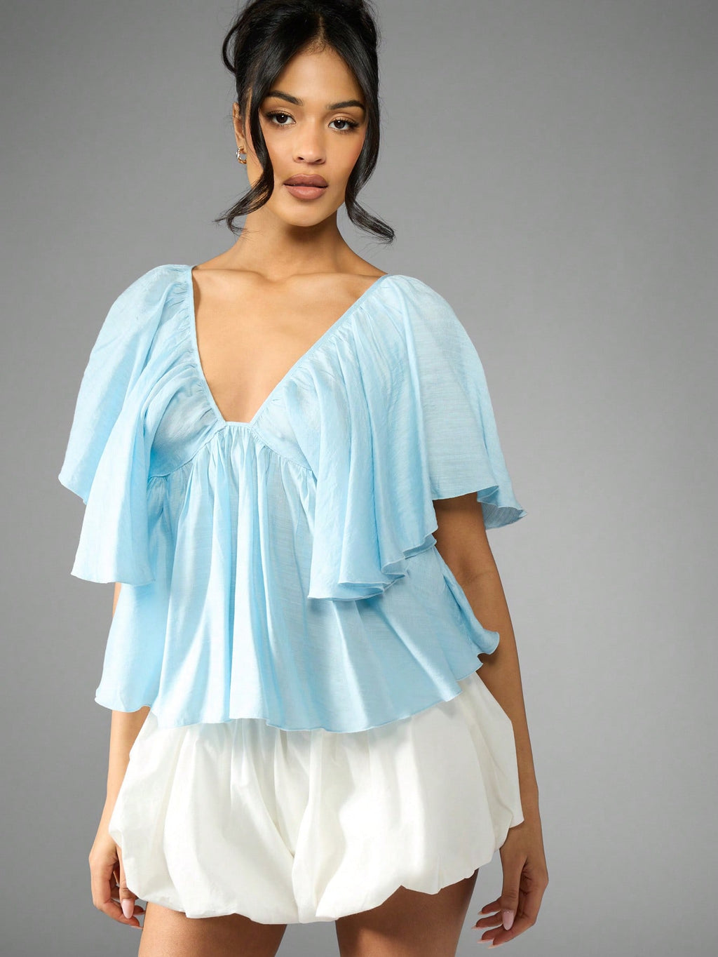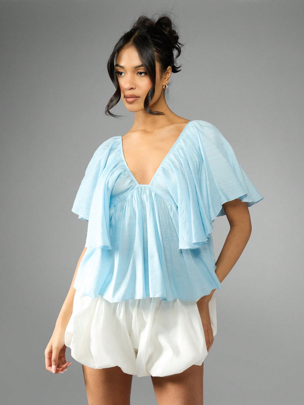 MiuVogue Butterfly Sleeve Babydoll Top Empire Waist Puff Ruffle Summer Blouse Flowy Beach Resort Loose Fit Back Tie Detail