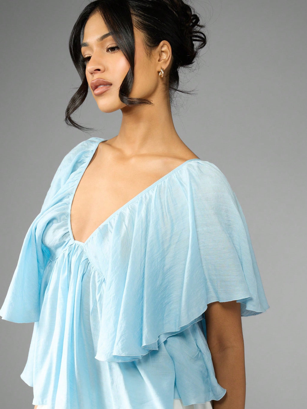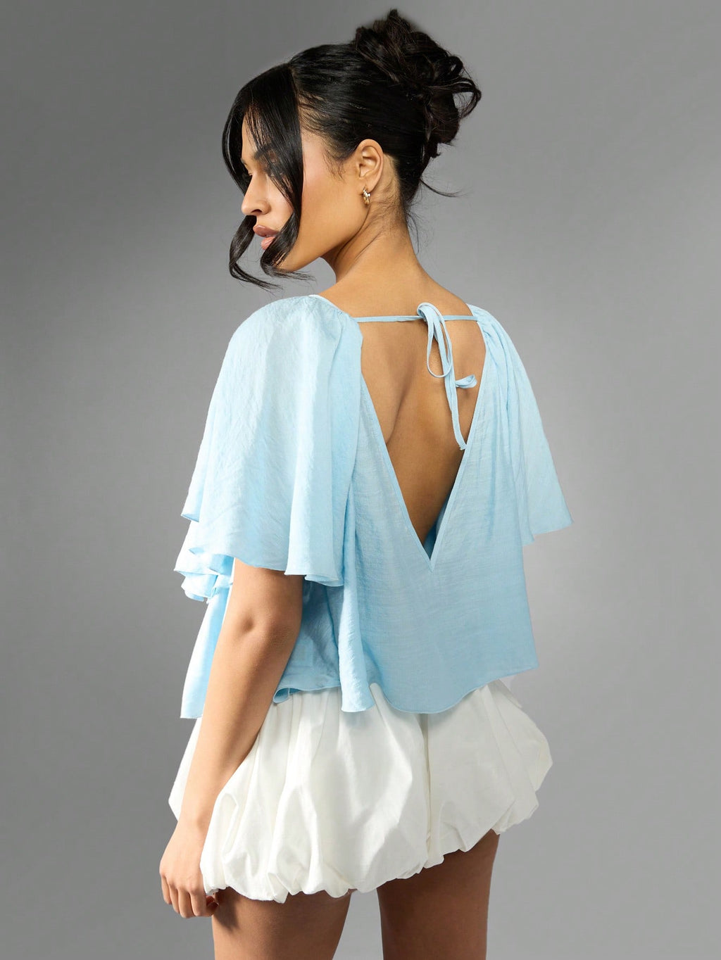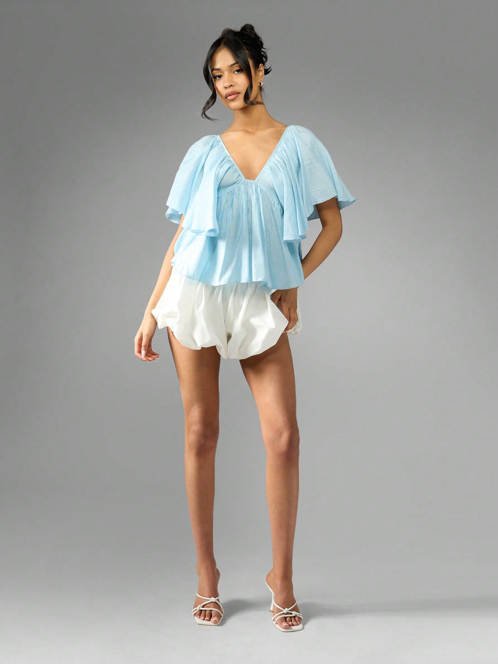 MiuVogue Butterfly Sleeve Babydoll Top Empire Waist Puff Ruffle Summer Blouse Flowy Beach Resort Loose Fit Back Tie Detail