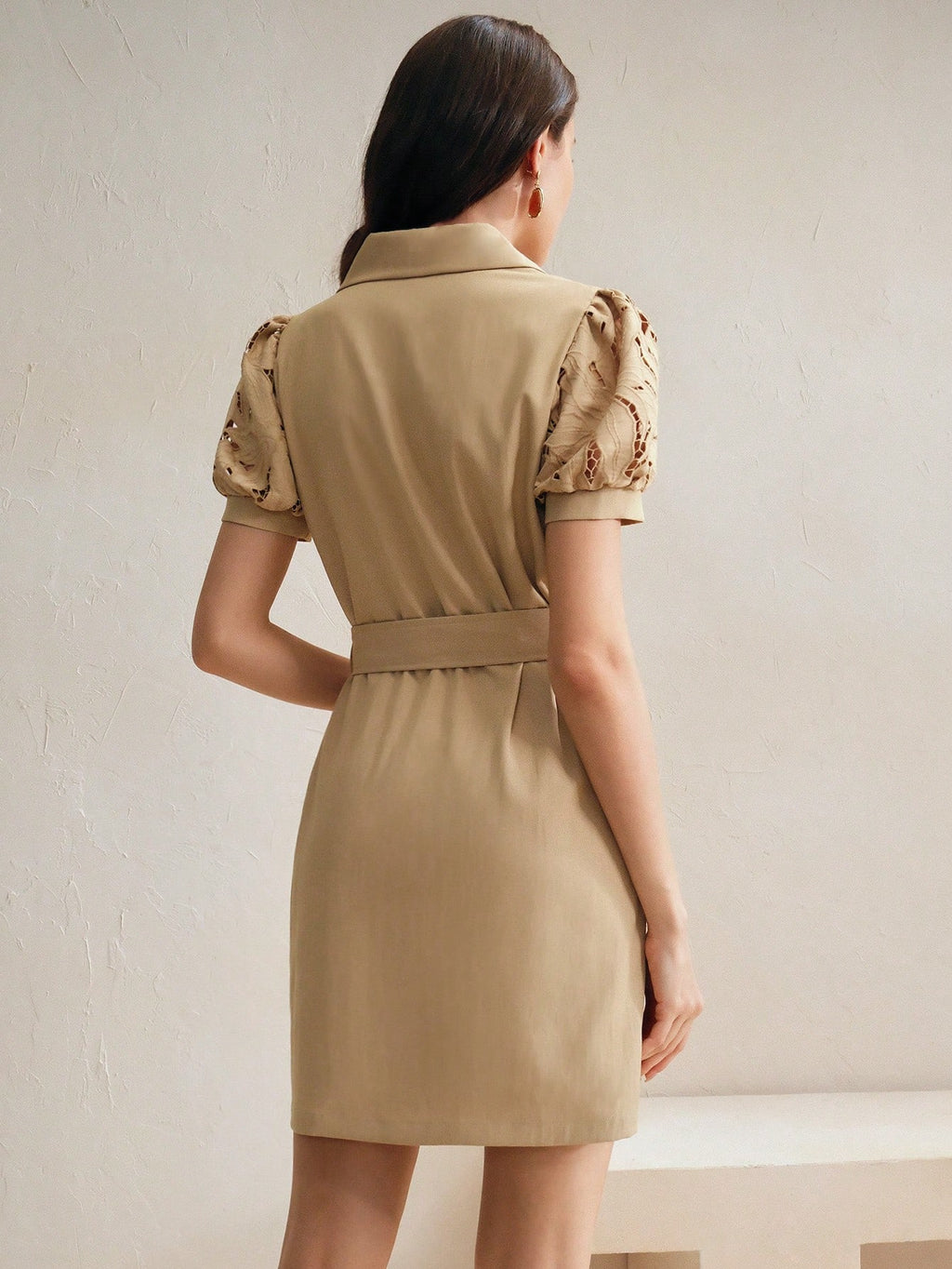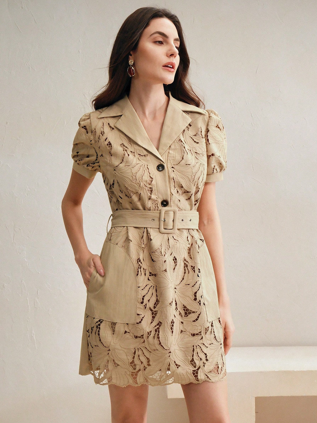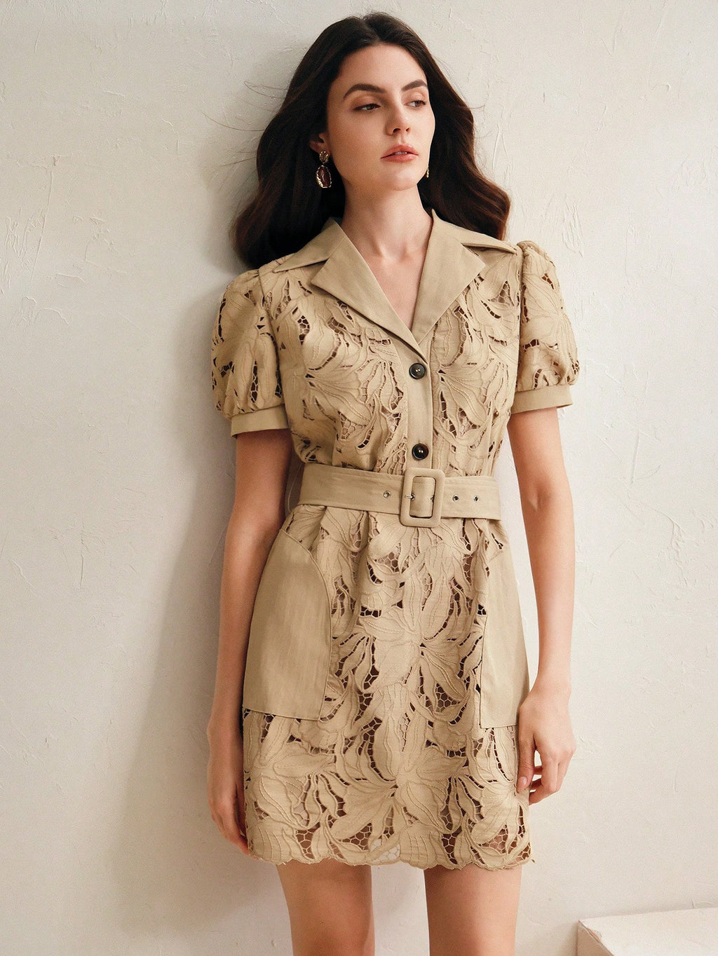 MiuVogue Elaire Heavy Laser Cutout Floral Print Shirt Collar Belted Dress, Summer Beach Vacation Outfit For Valentine's Day, Spring/Summer