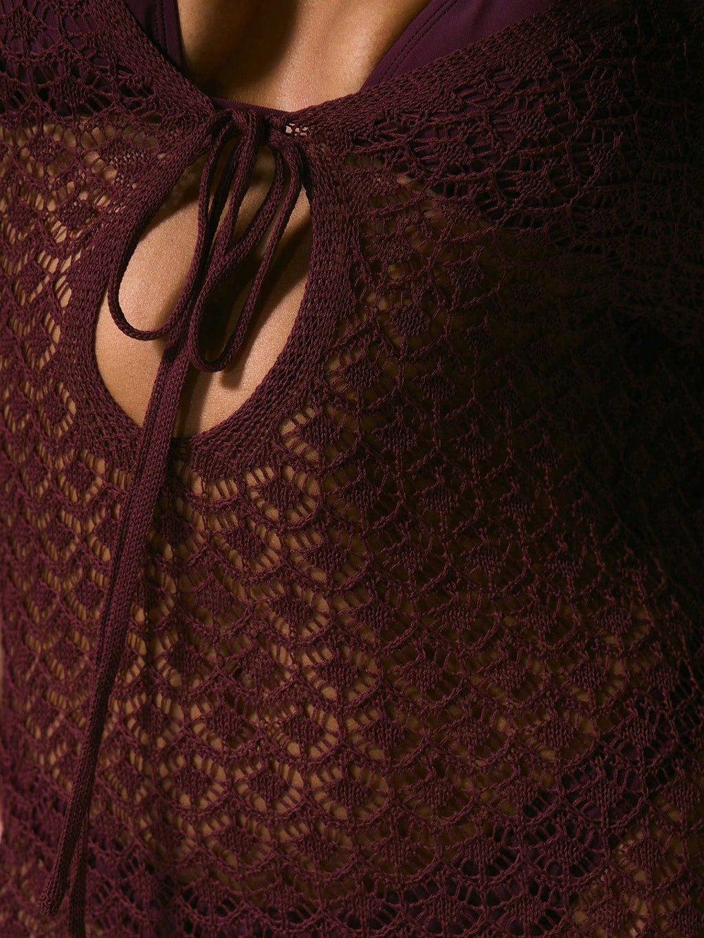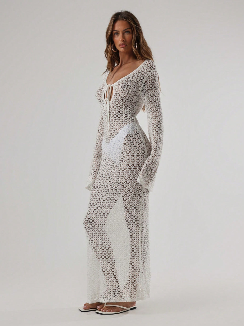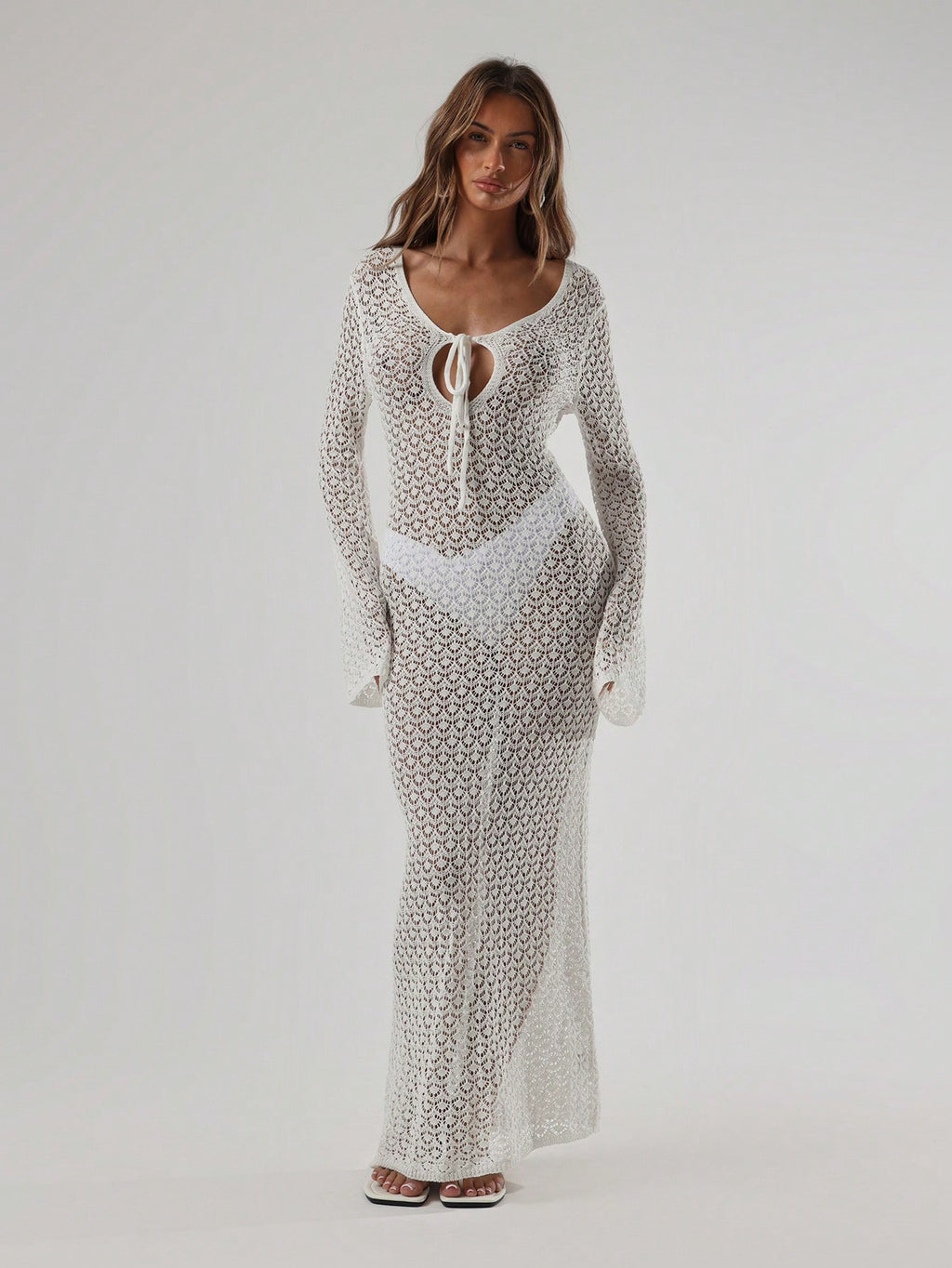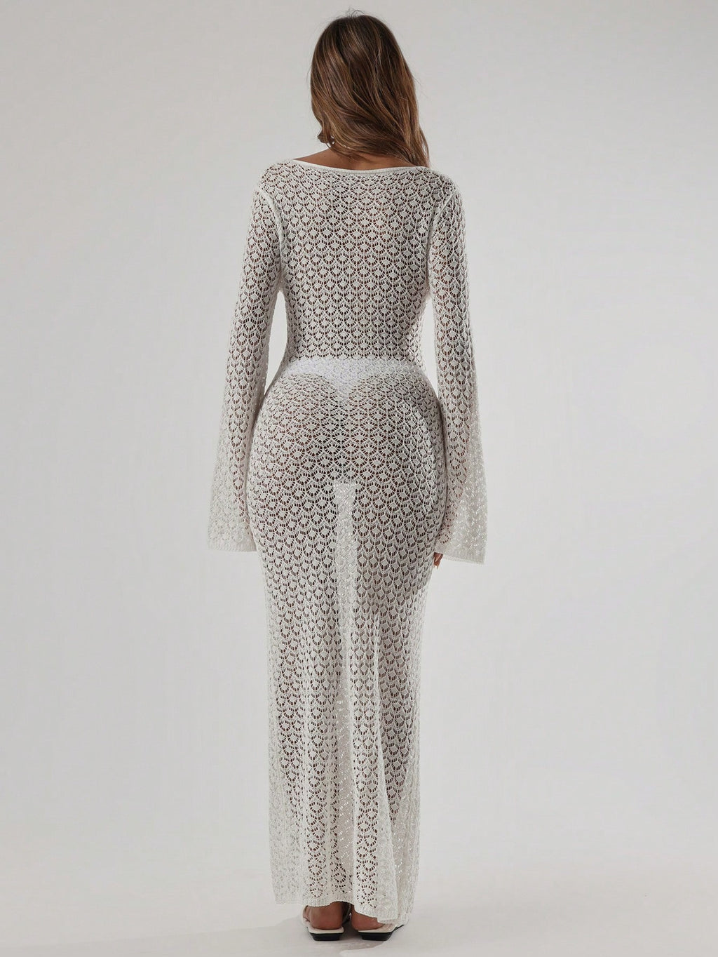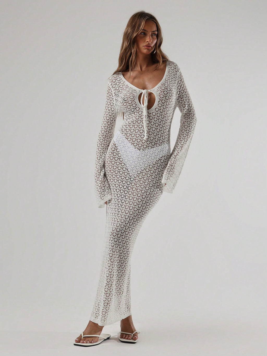 MiuVogue Resort Crochet Knit Plunge Neck Tie Front Long Flared Sleeve Maxi Dress Beach Cover Up Vacation Spring Summer Elegant Beach Resort Ibiza Swim Acai