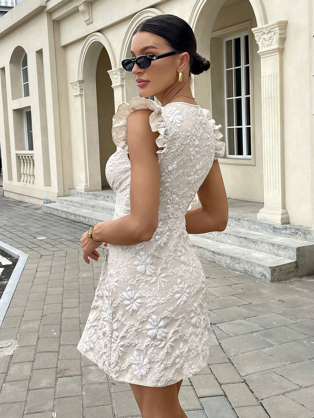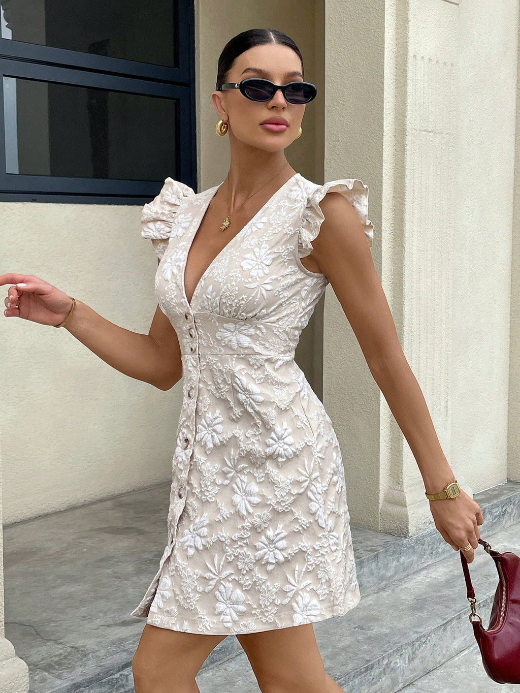 MiuVogue Serisse Women's Elegant Solid Color Jacquard Textured Ruffle Button Front Placket Summer Fly Sleeve Slimming Dress For Everyday Wear Women's Summer Clothing Women's Summer Dresses Vacation Outfits Woman Vacation Dress Business Casual Woman