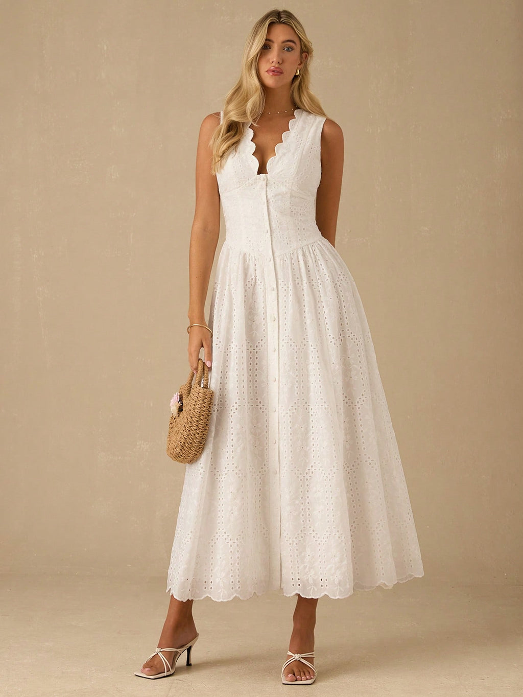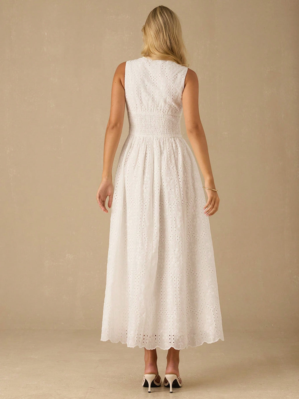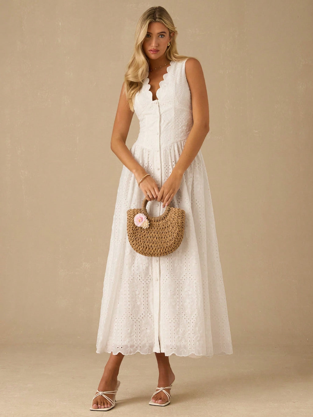 MiuVogue Spring/Summer Romantic Women's Fashion White Shell Edge Sleeveless Embroidery Pattern Maxi Dress,Sweet