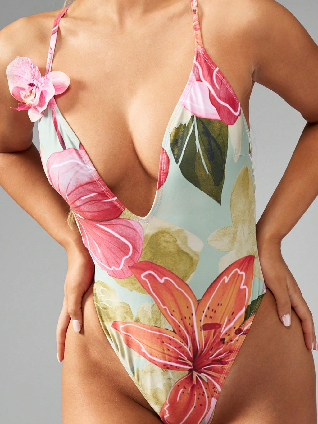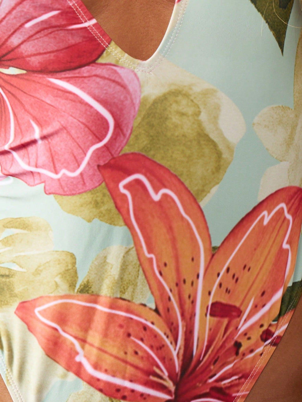MiuVogue Tropical Paradise One Piece Swimsuit Hawaiian Orchid Print Plunging V-Neck Monokini Beach Vacation Resort Wear Summer Swim Pool Party Cruise Beachwear
