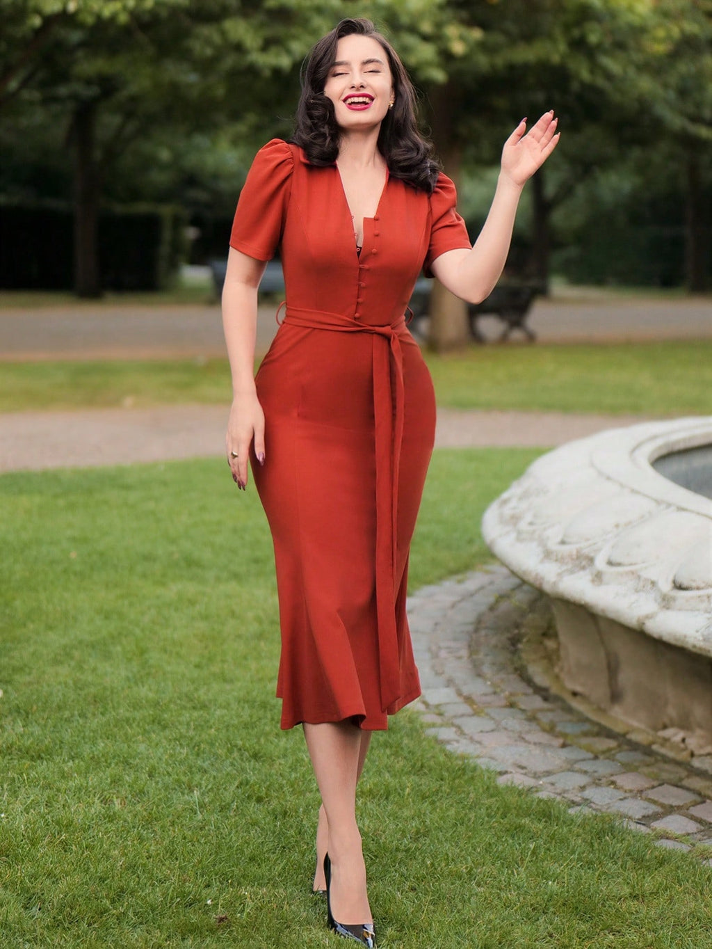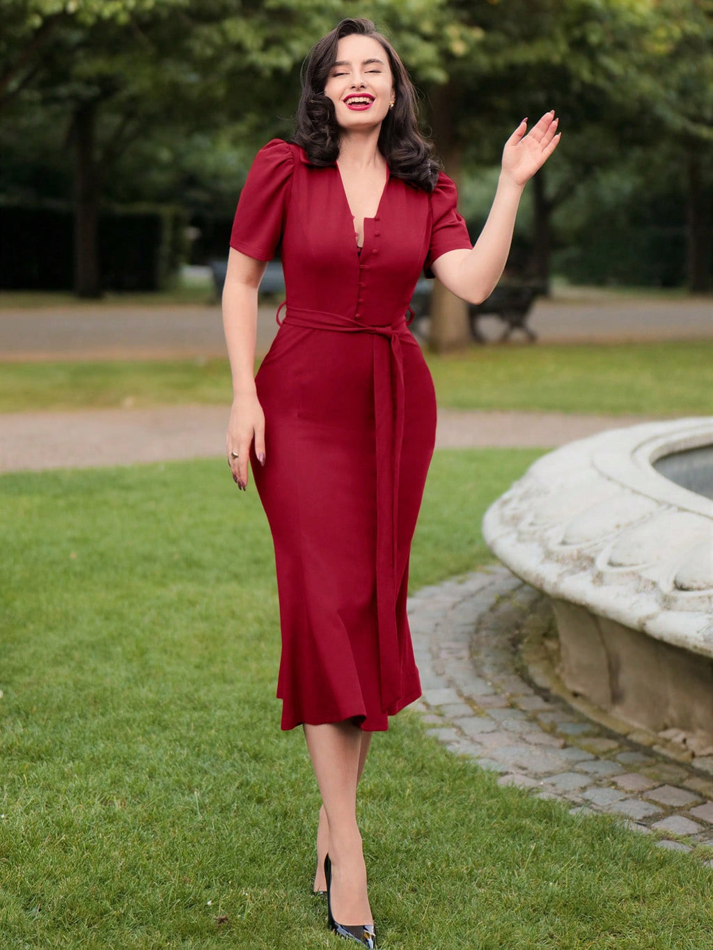 MiuVogue Vintamour Vintage Elegant Women Dress V-Neck Collar Short Sleeve Button Bow Tie Waist Mermaid Bodycon Dress, Casual