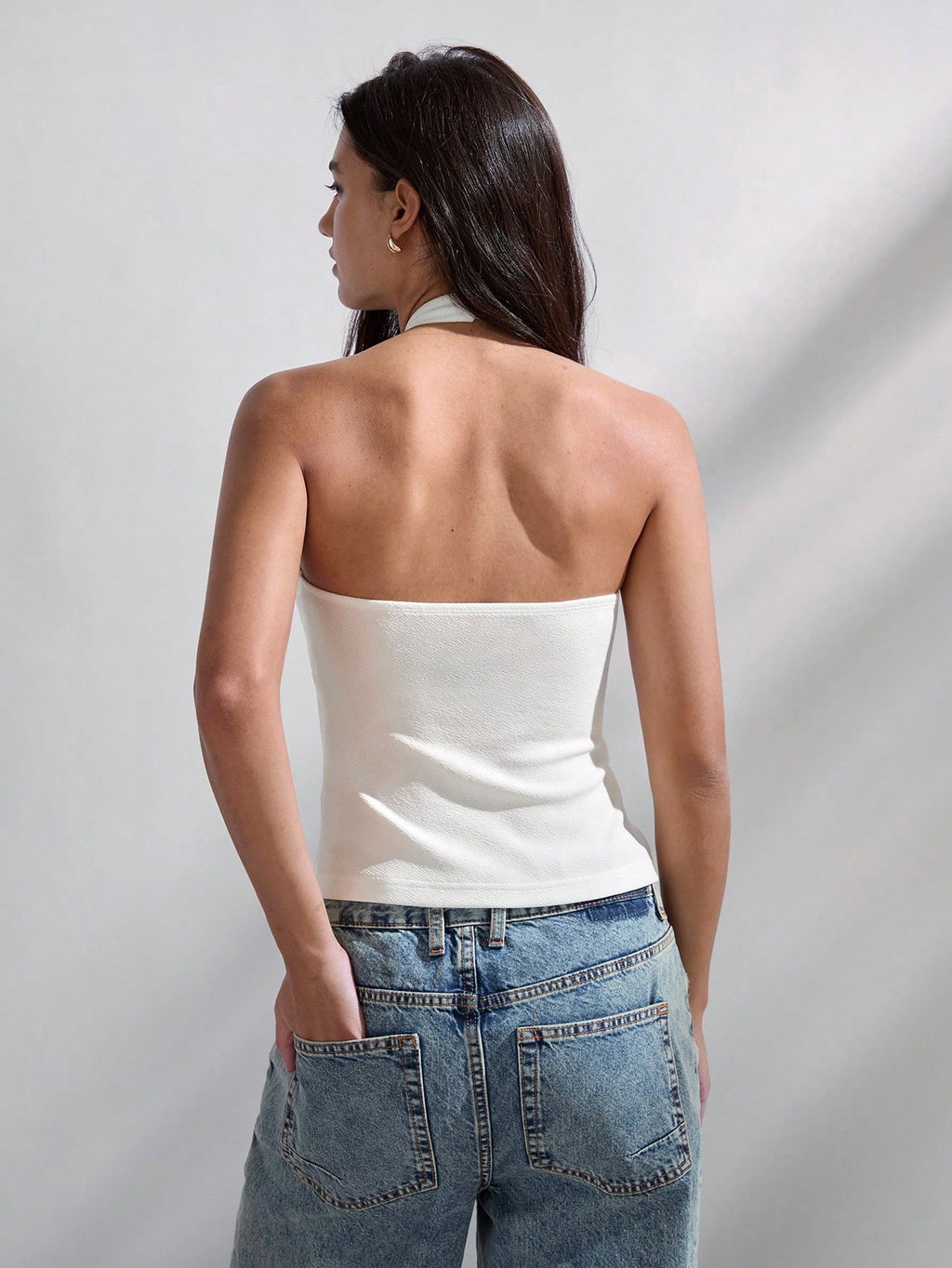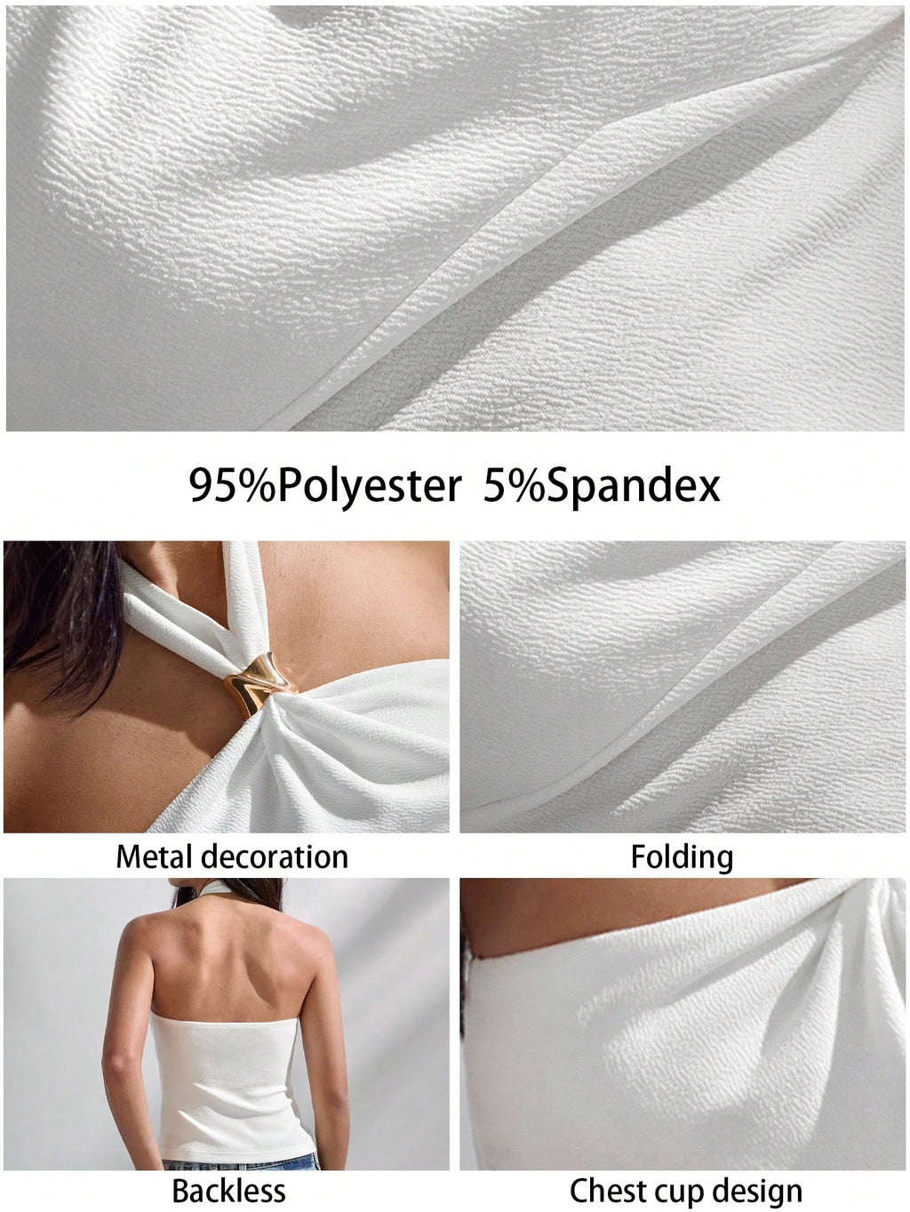 MiuVogue Women's All-Match White Sleeveless Crop Top With Hollow Out Design And Metal Decor, Simple Versatile Fashion Essential For Spring