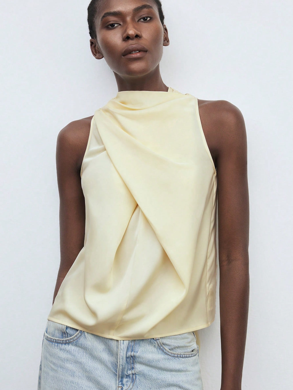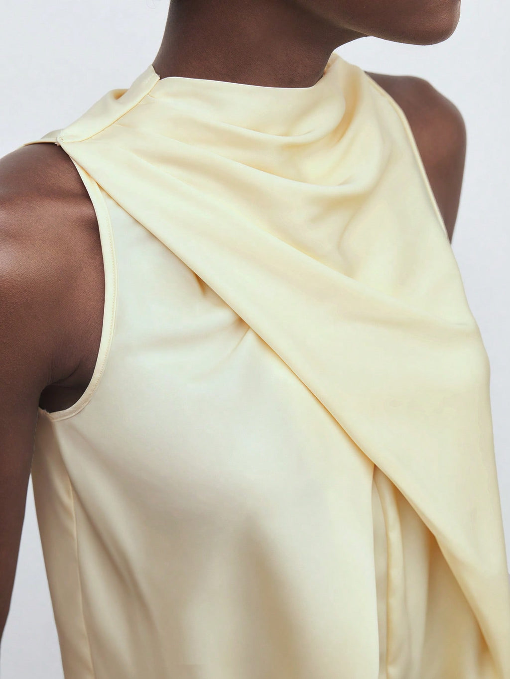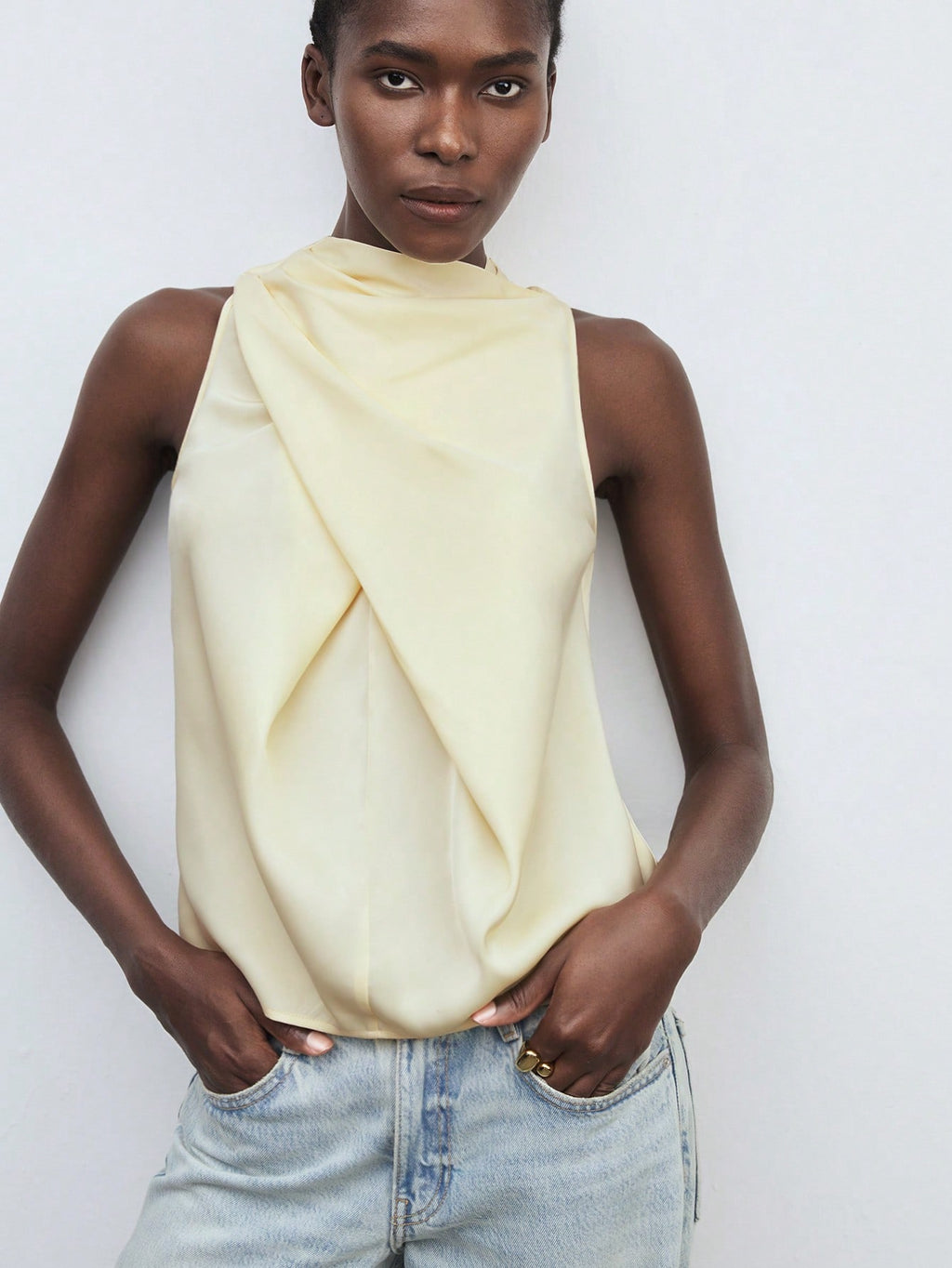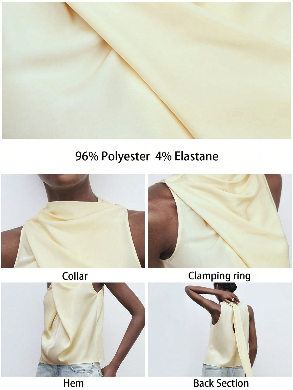 MiuVogue Women's Apricot Summer Outfit, Standing Collar Ruched Front With Middle Pleats, Button Placket At Back, Satin Fabric, Elegant